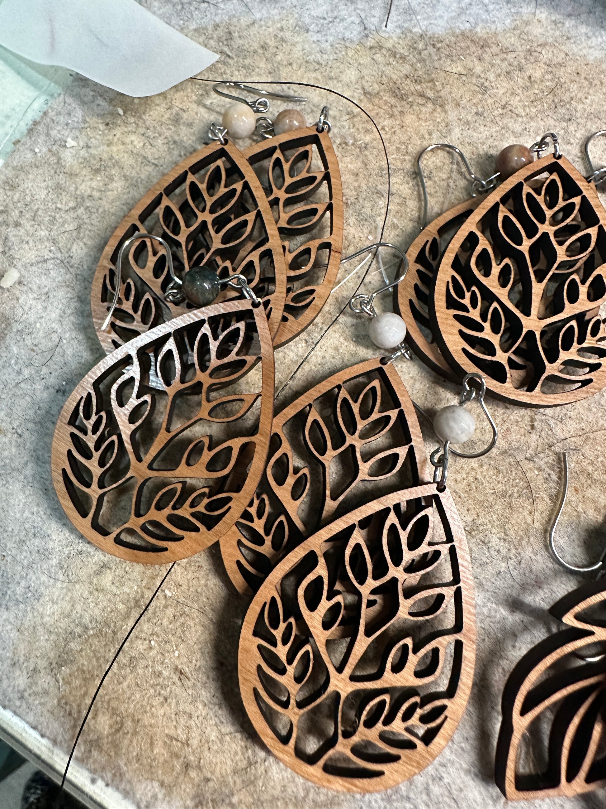 Laser cut cherry wood leaf drop with agate beads in various colors.