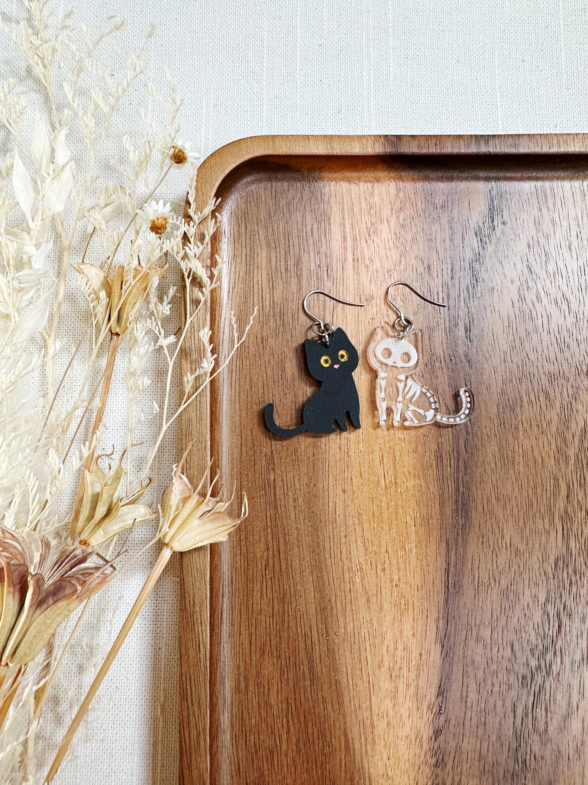 One earring is a black cat and the other is a clear acrylic skeleton of the cat