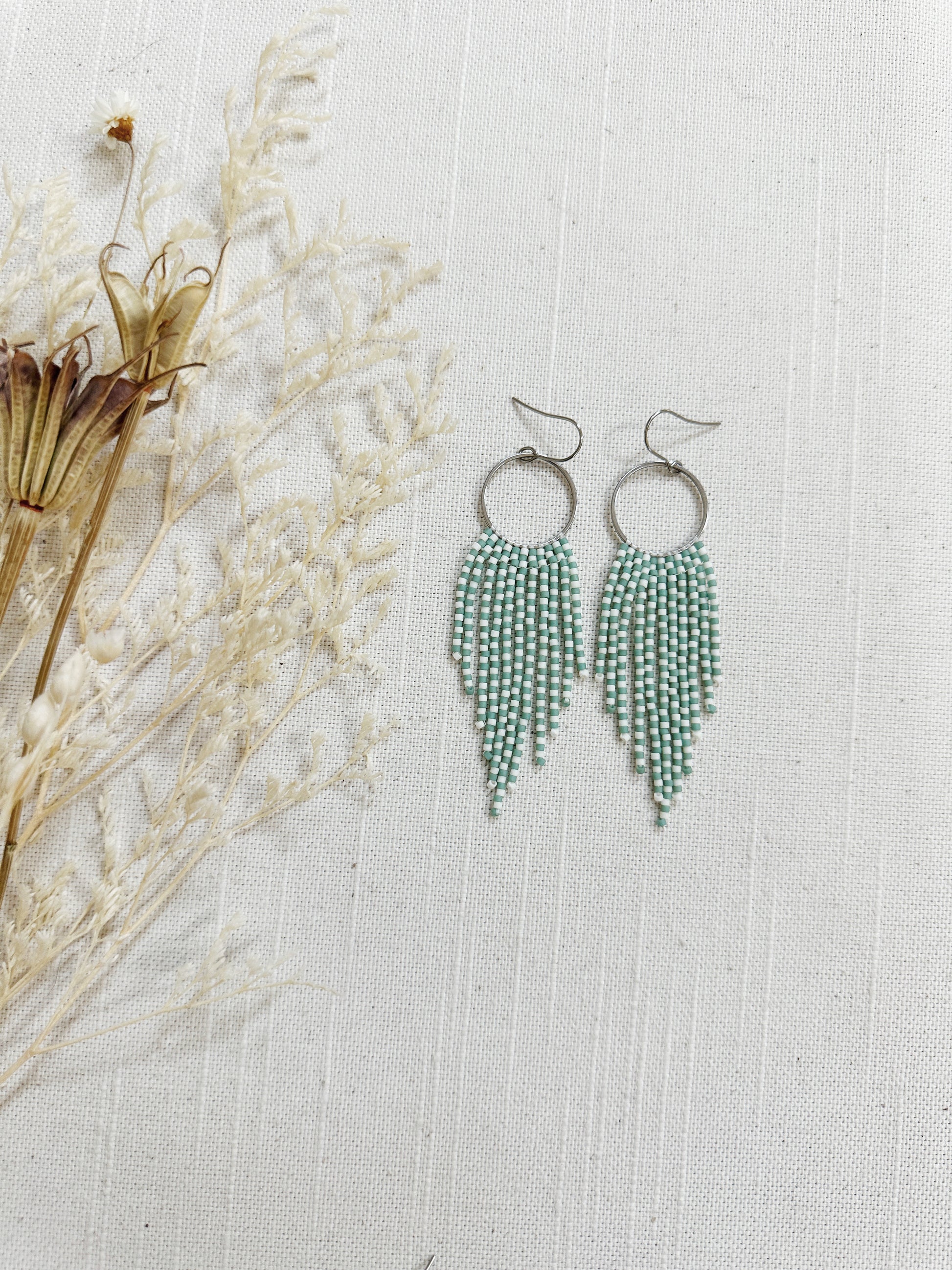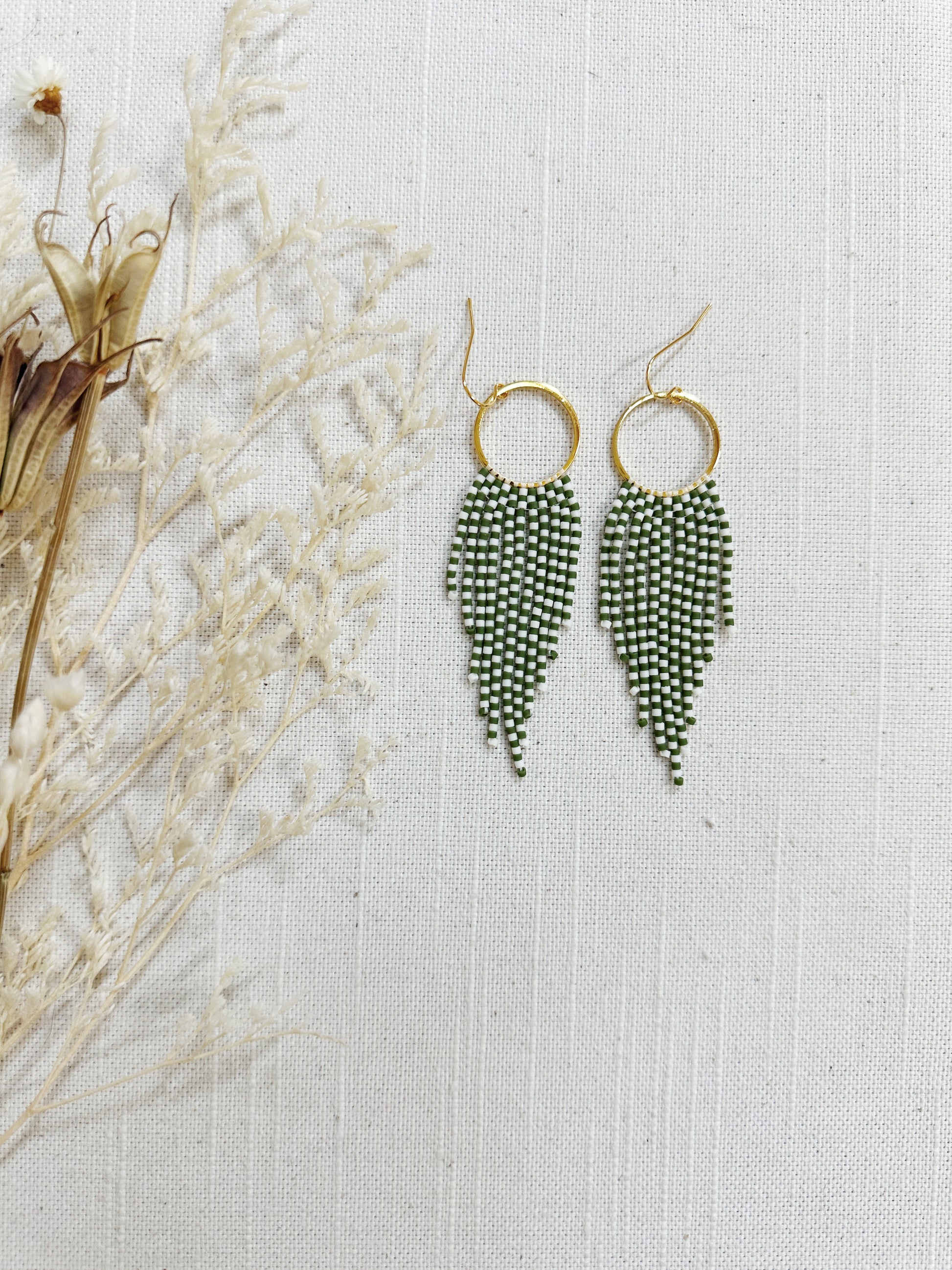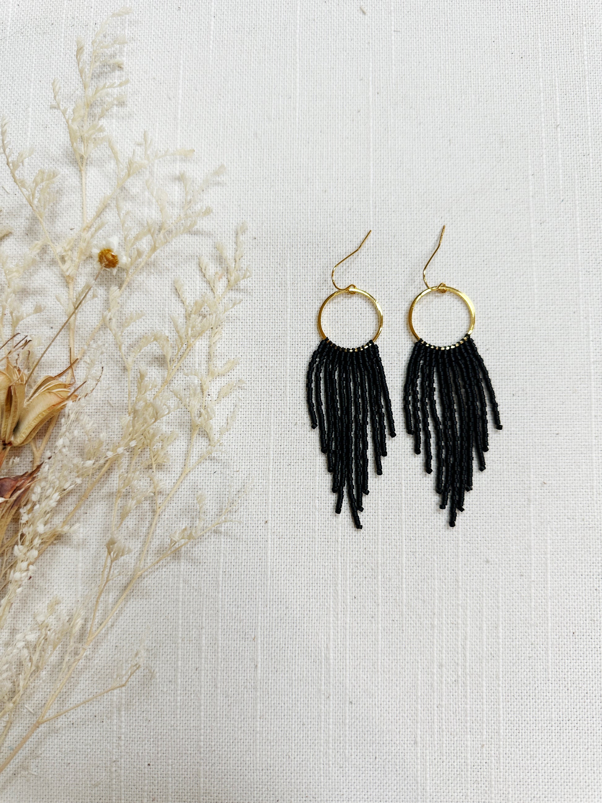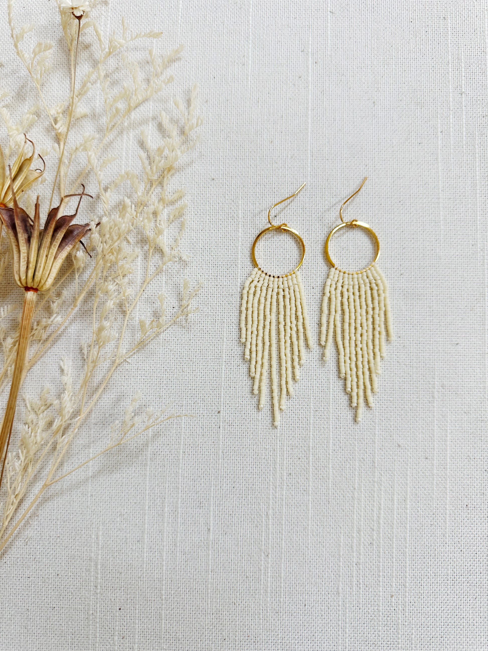 Fringe hangs from a gold or silver plated hoop (see color description)