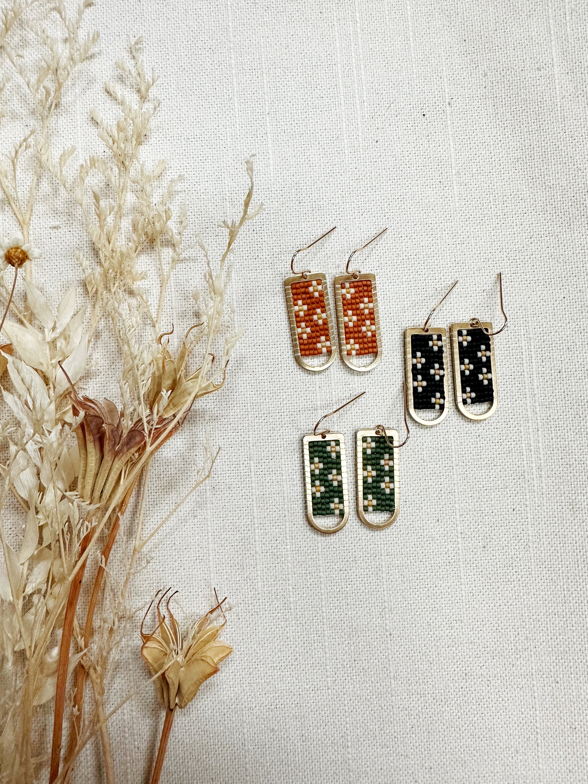 Glass beads sown in a floral pattern on a brass finding. Perfect to dress up or down