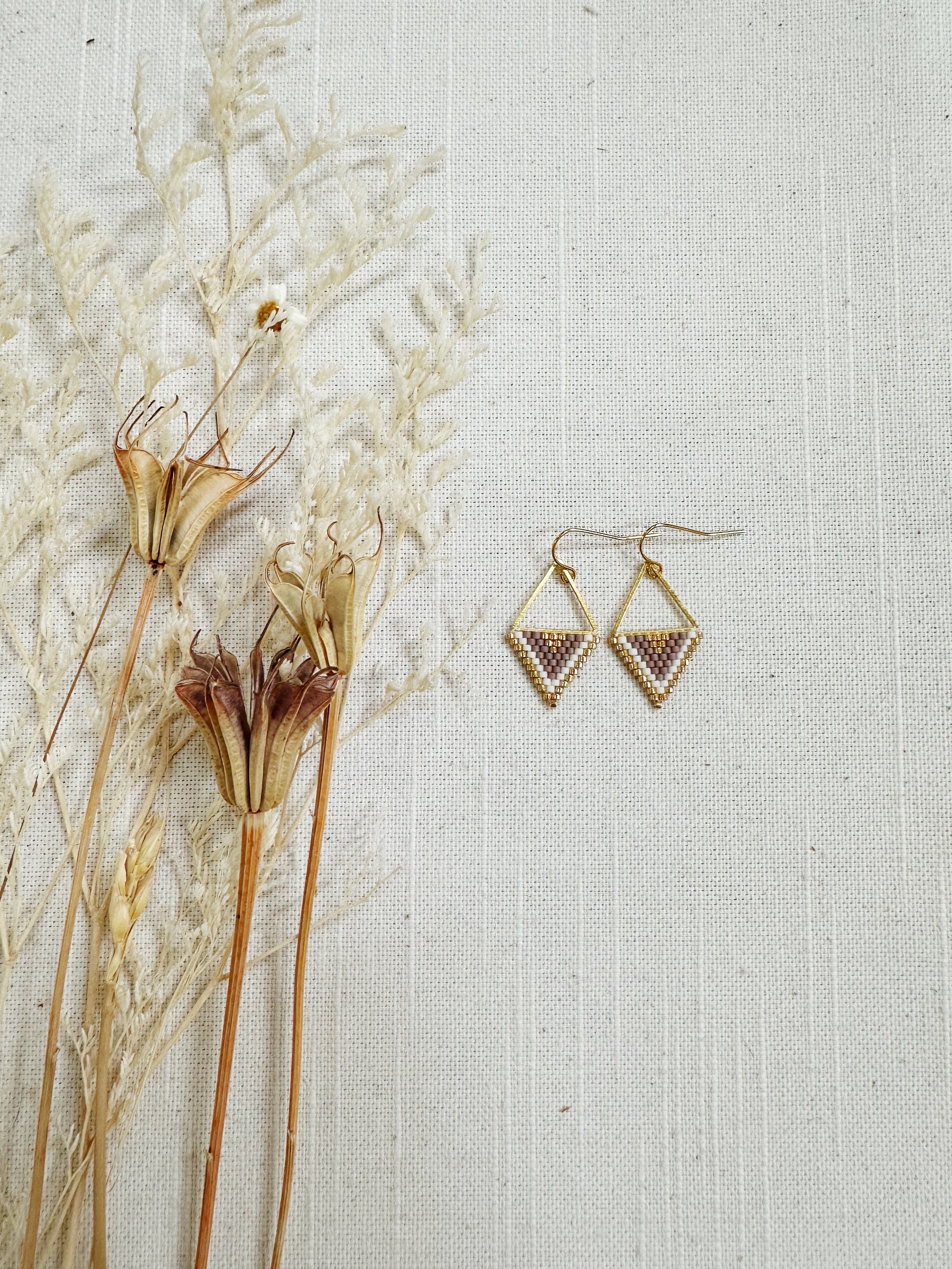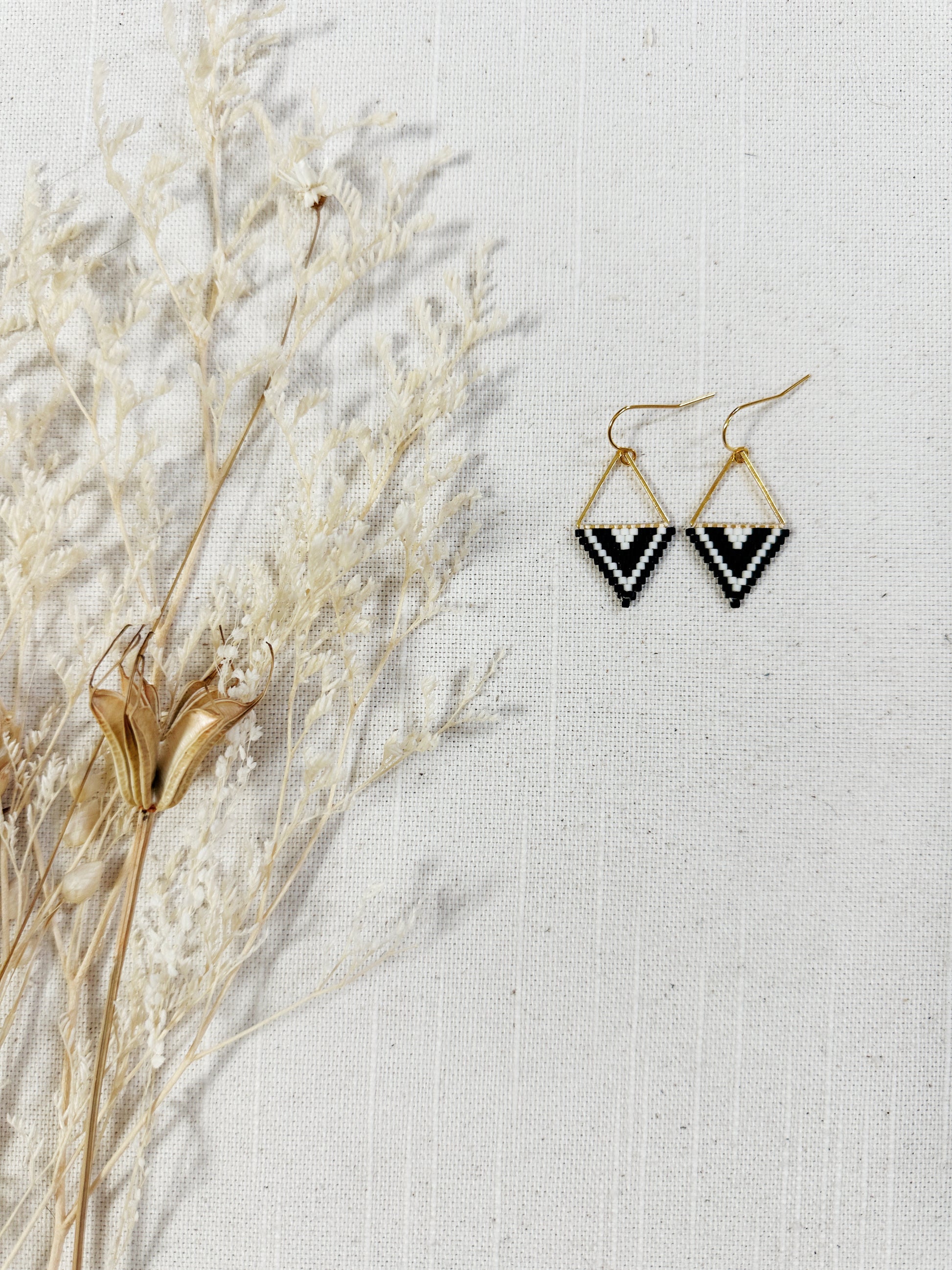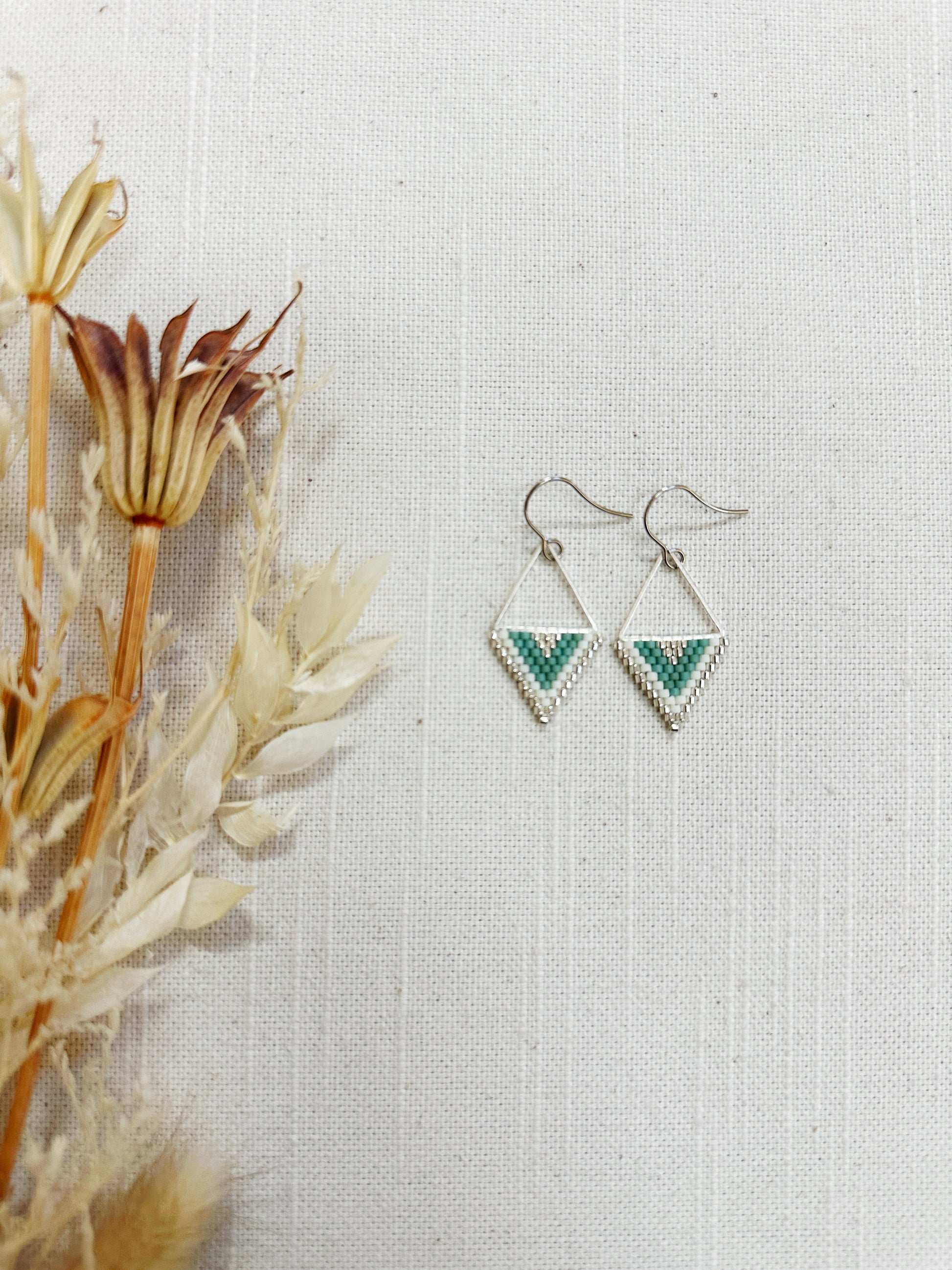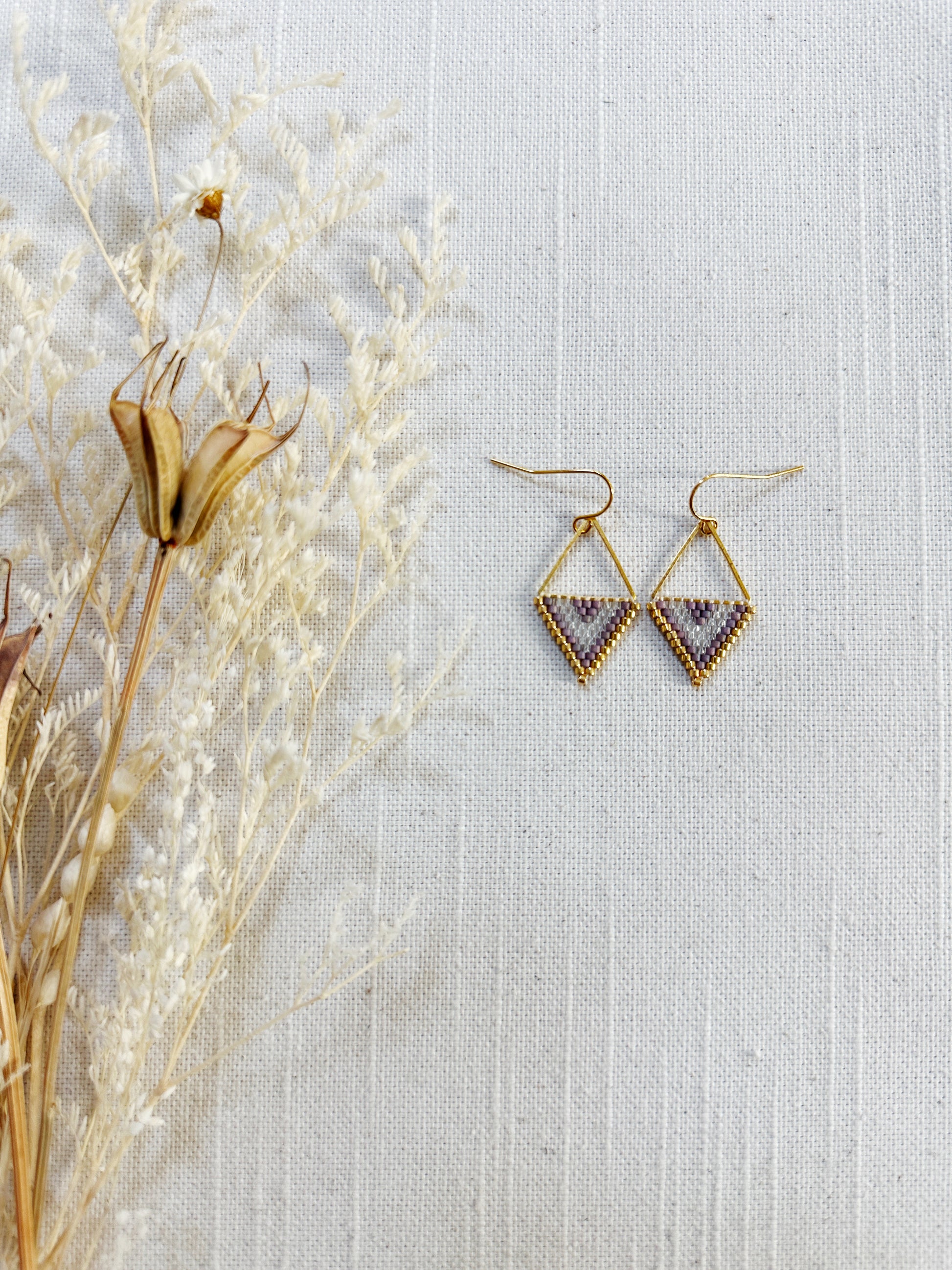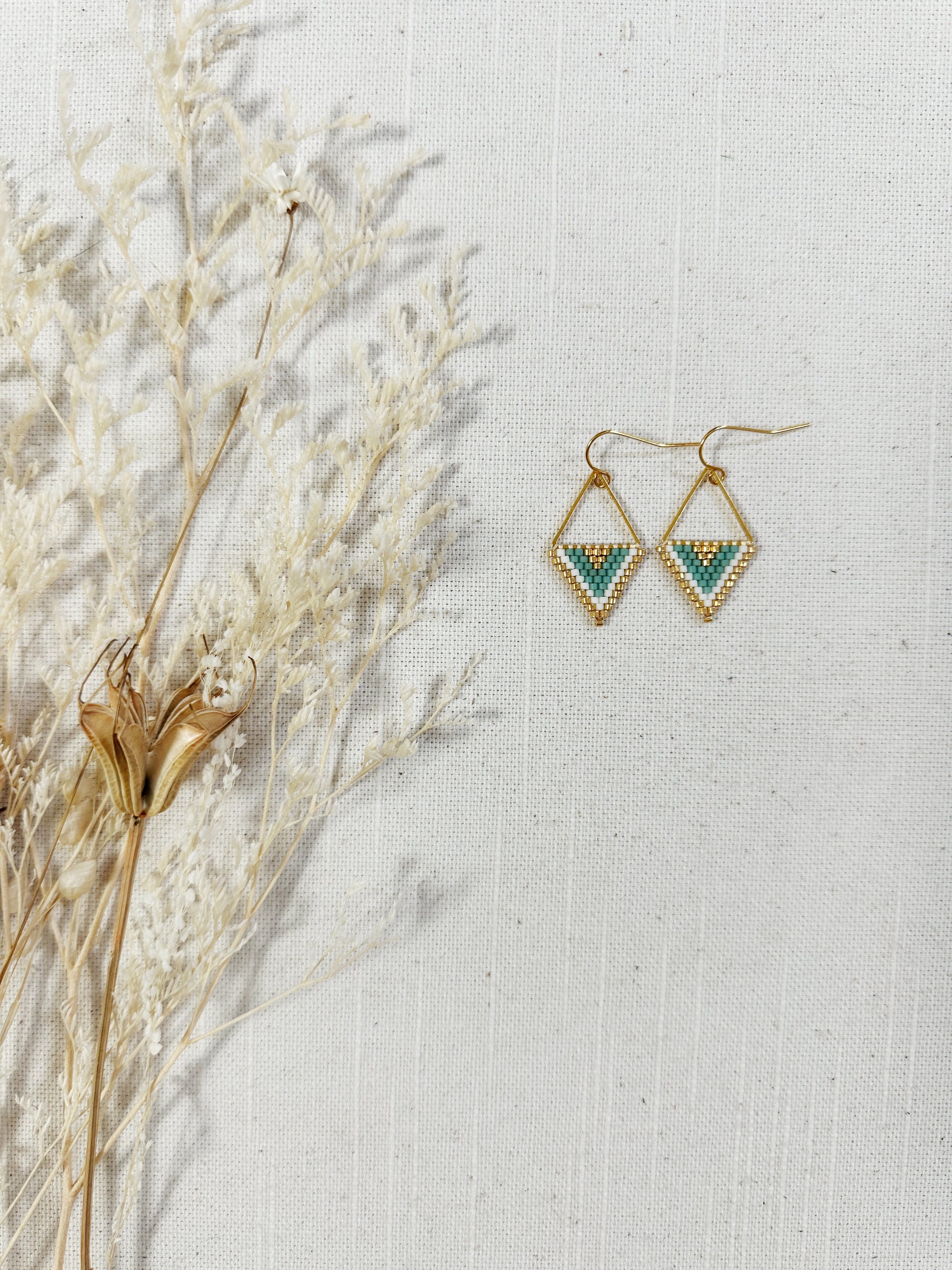 Mini earring sets attached to a gold plated triangles. Some options available in Silver plated triangles. See color name for those options.