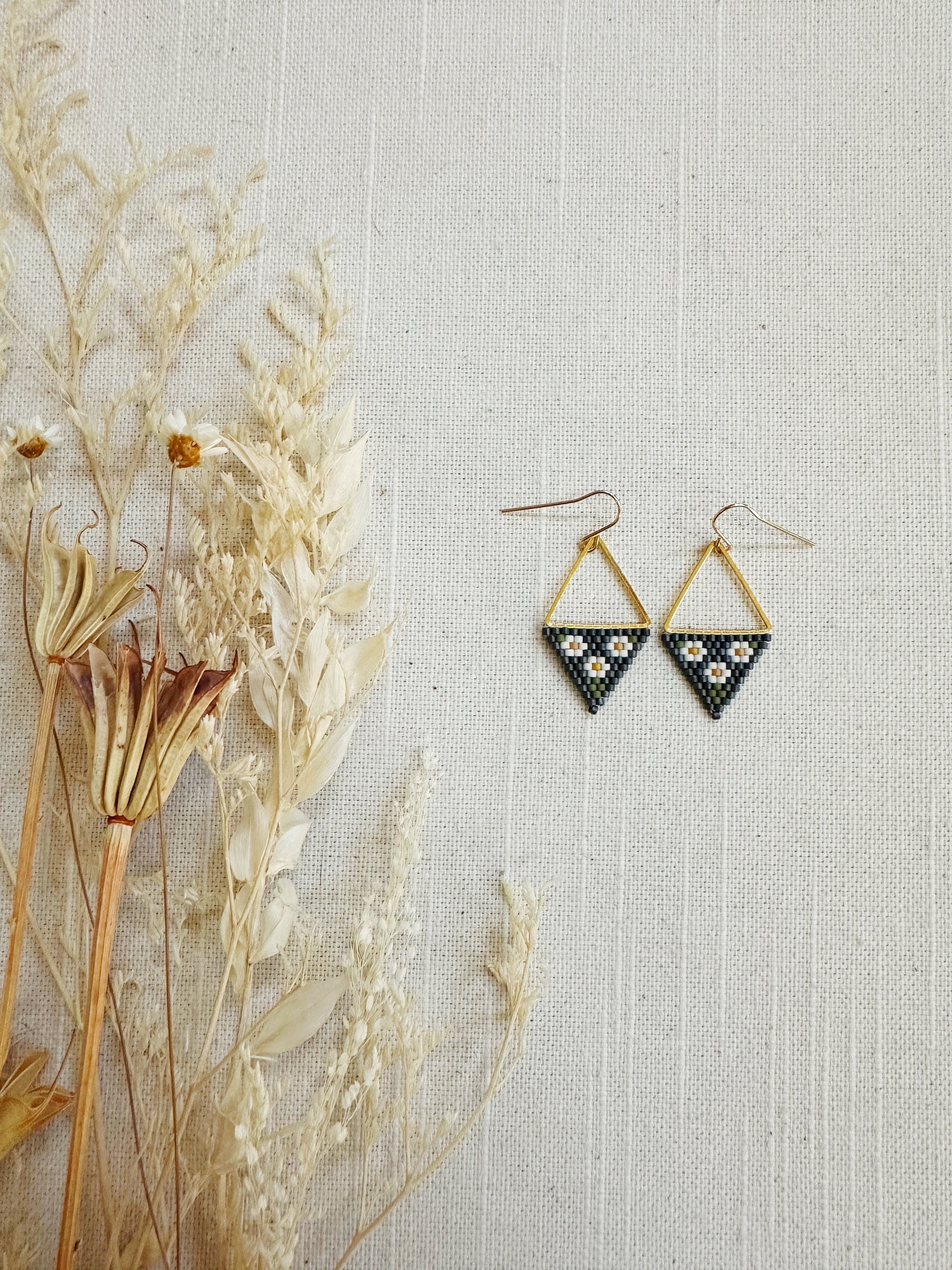Beaded flower design on gold or silver plated triangles. Silver Plated will be in the color option name.