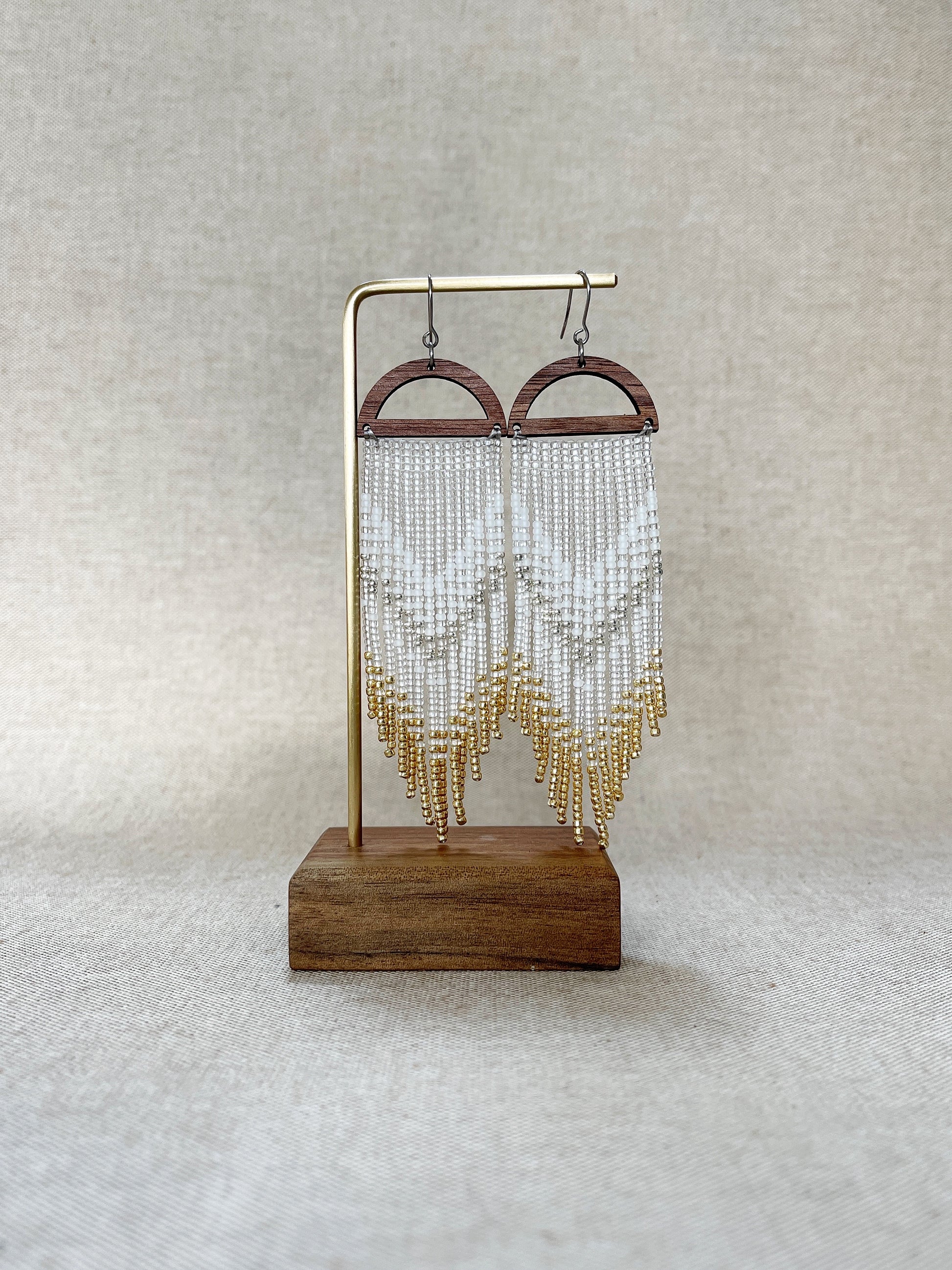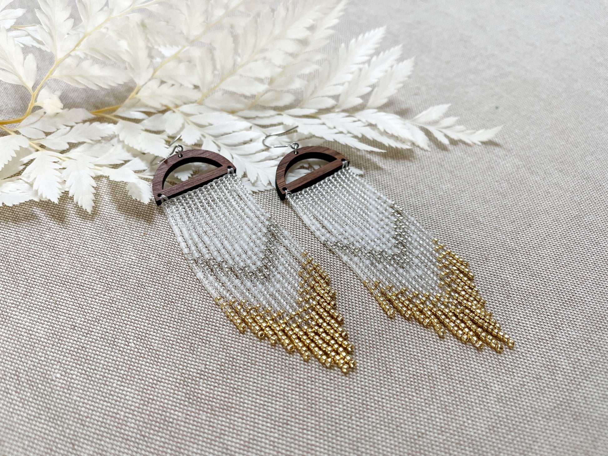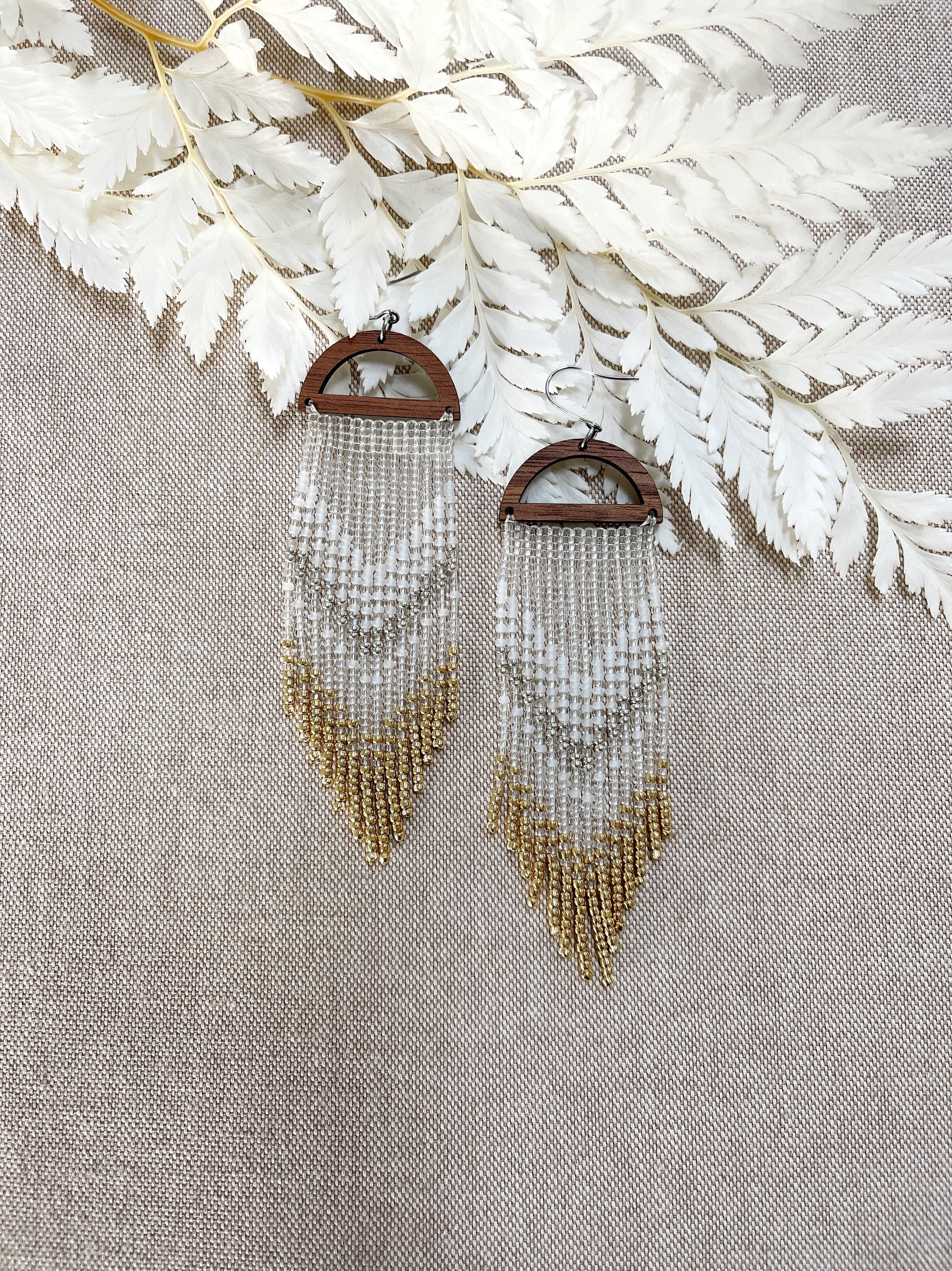 Clear, frosted, gold and silver beads mixed with a walnut stained wood semi circle.