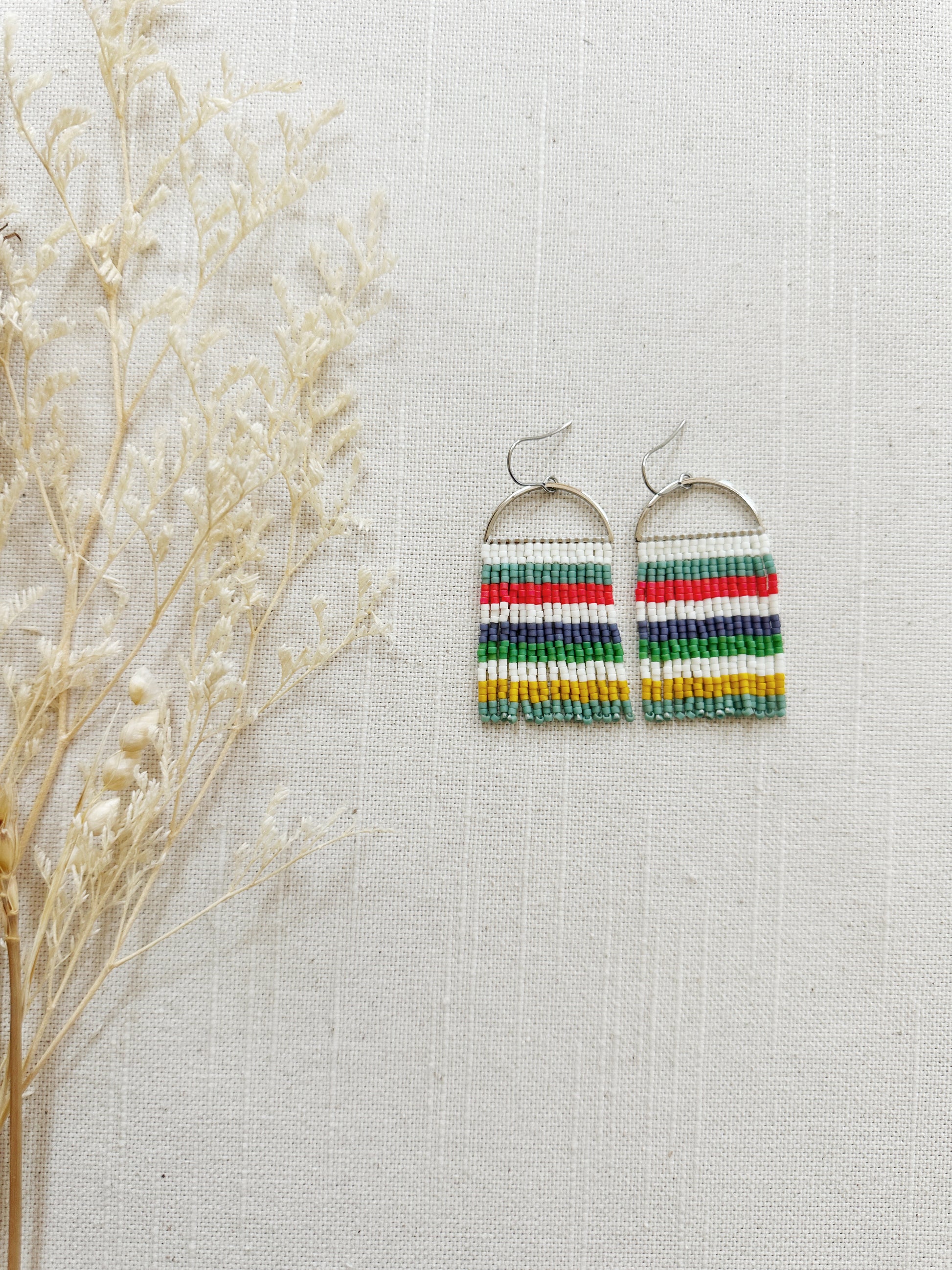 These vibrant striped beads hang from a semi circle finding. They are light weight and a great size for everyday wear.
