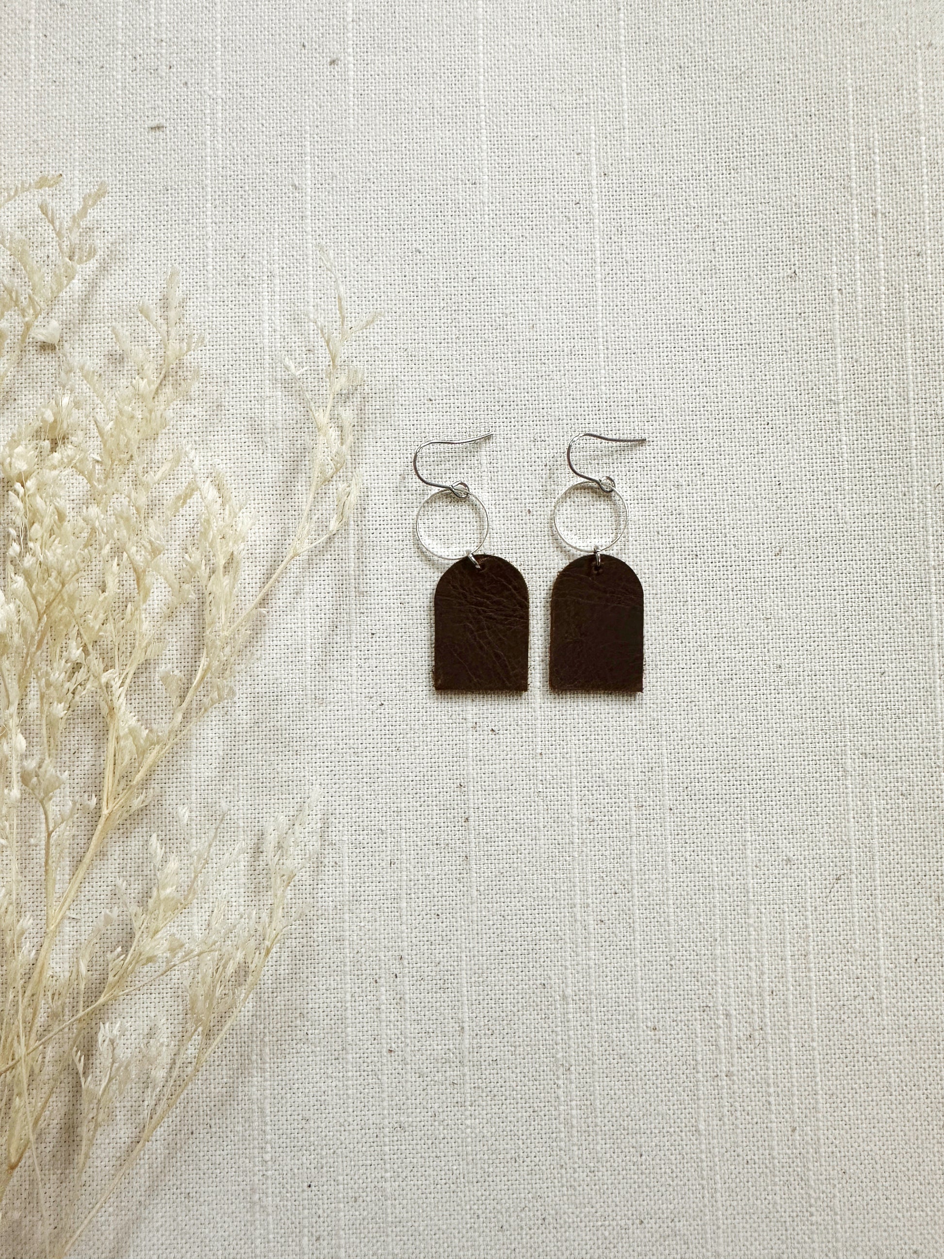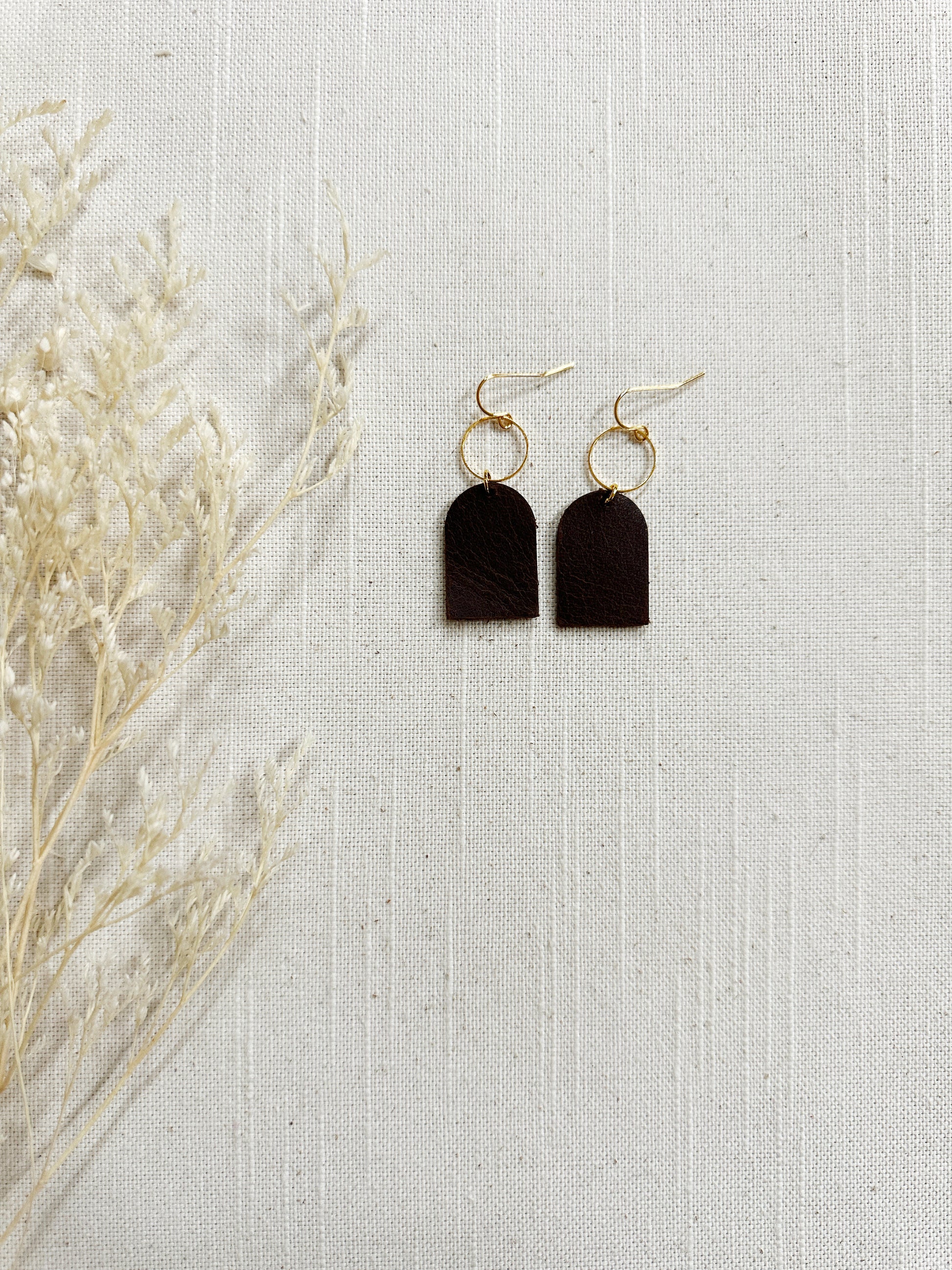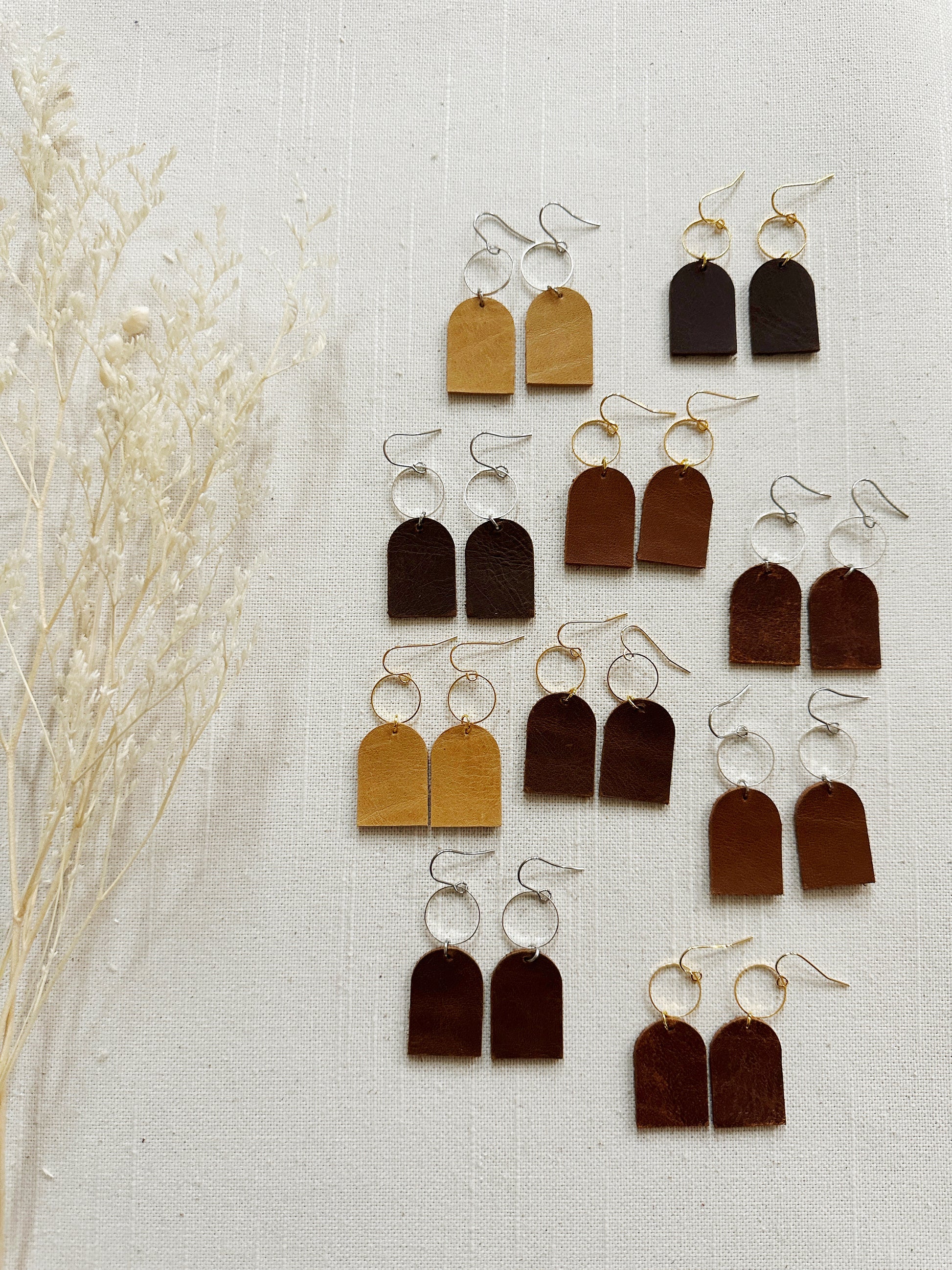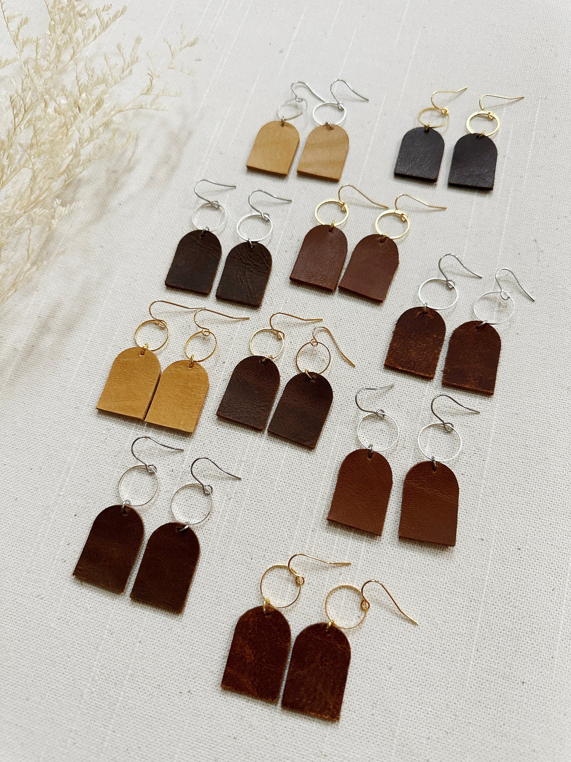 These small leather earrings feature a delicate arch design and come in your choice of silver or gold hoops.