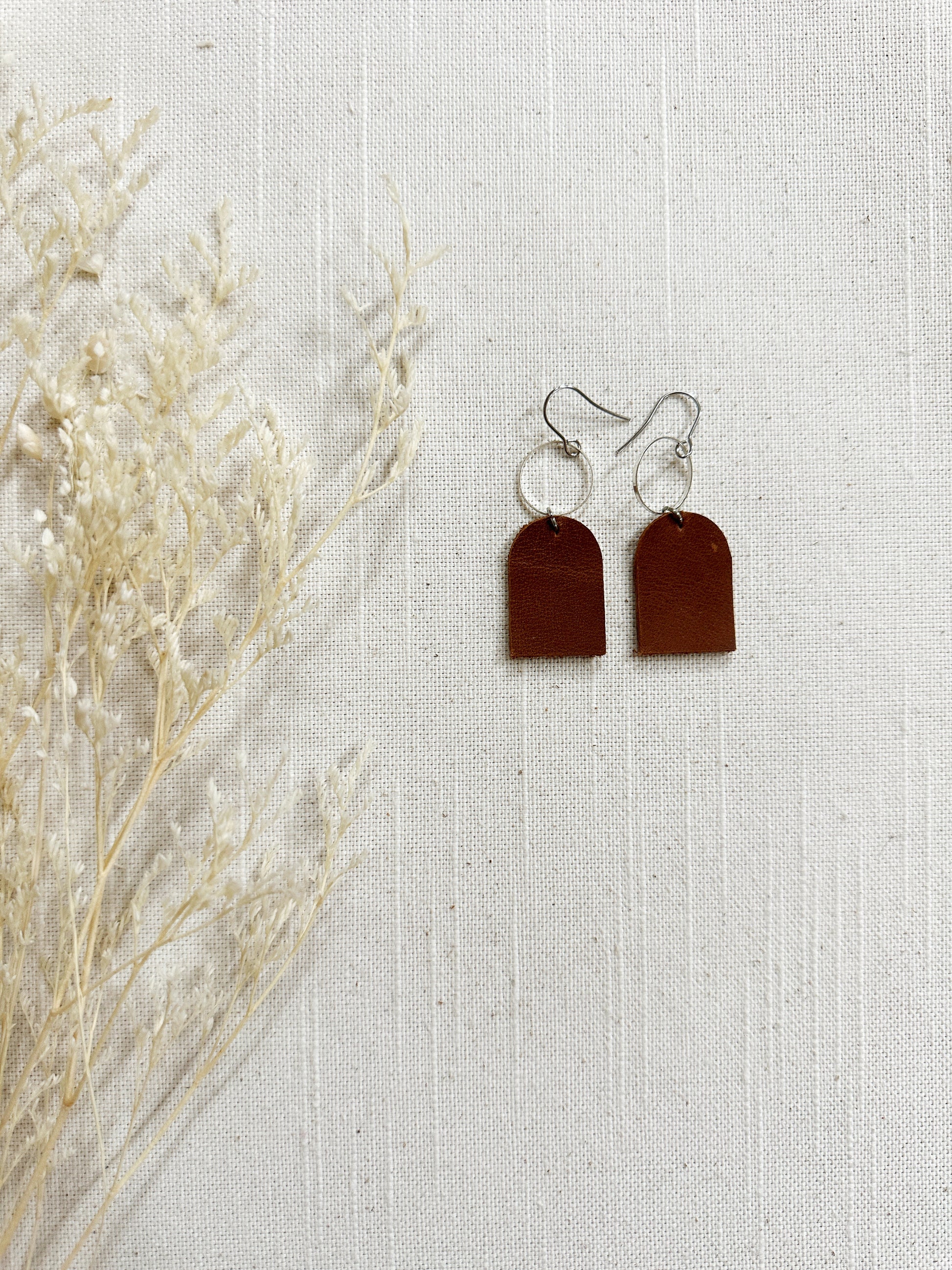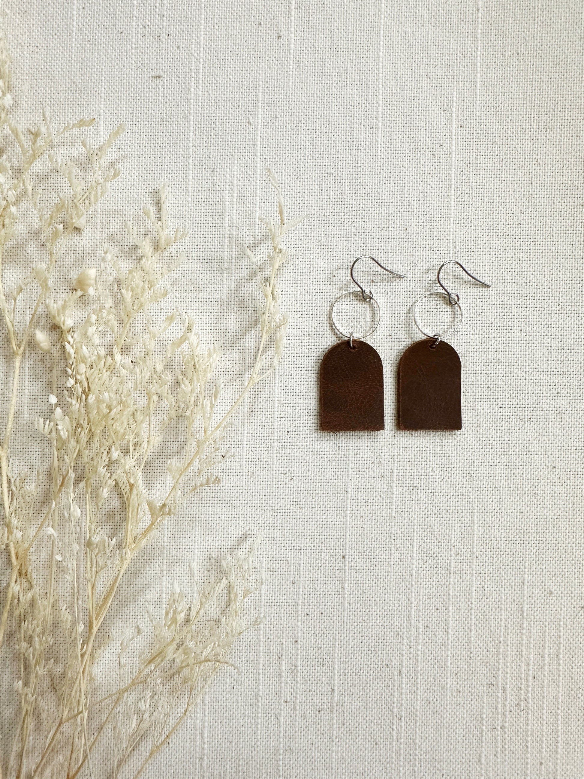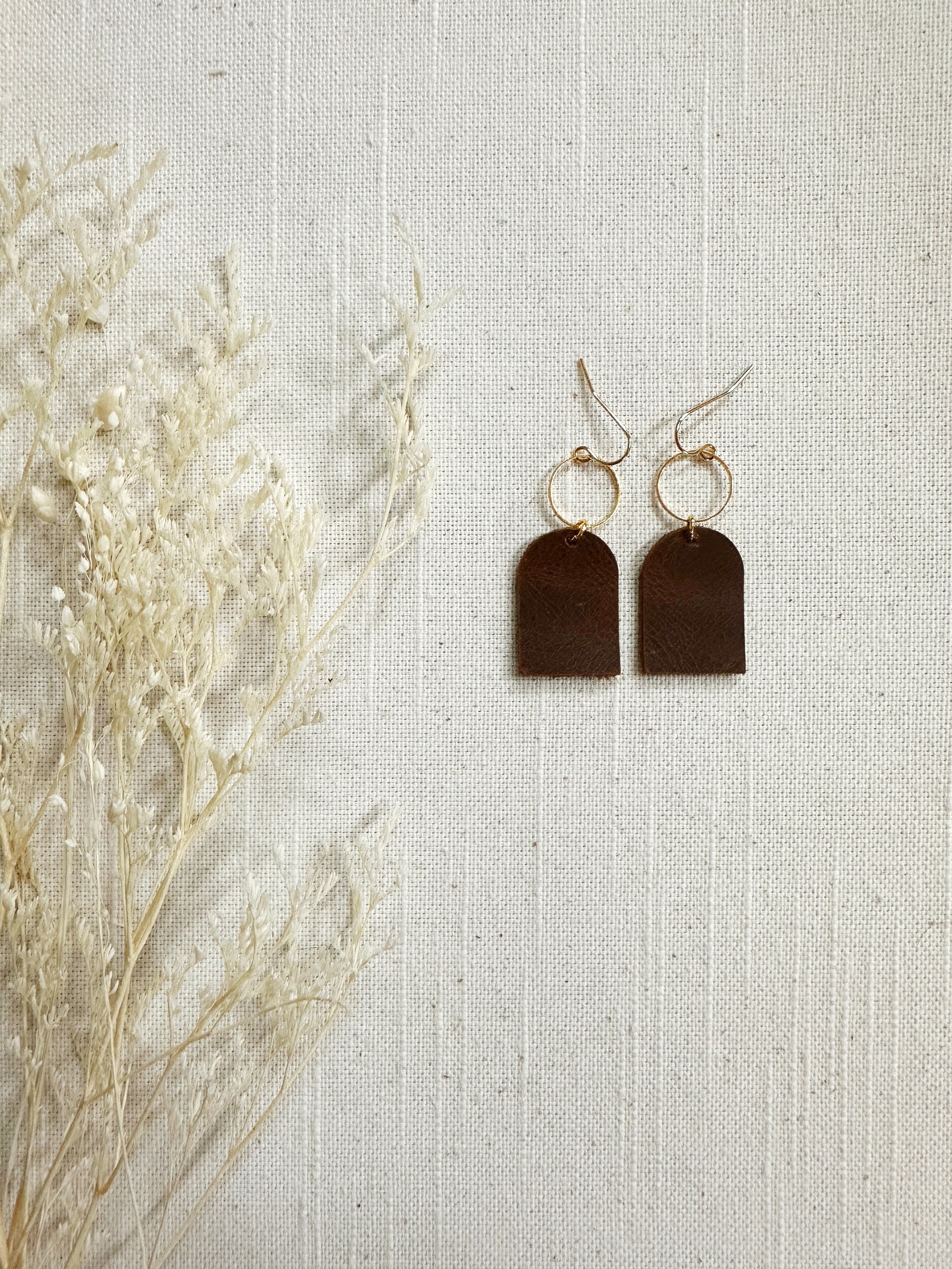 These small leather earrings feature a delicate arch design and come in your choice of silver or gold hoops.