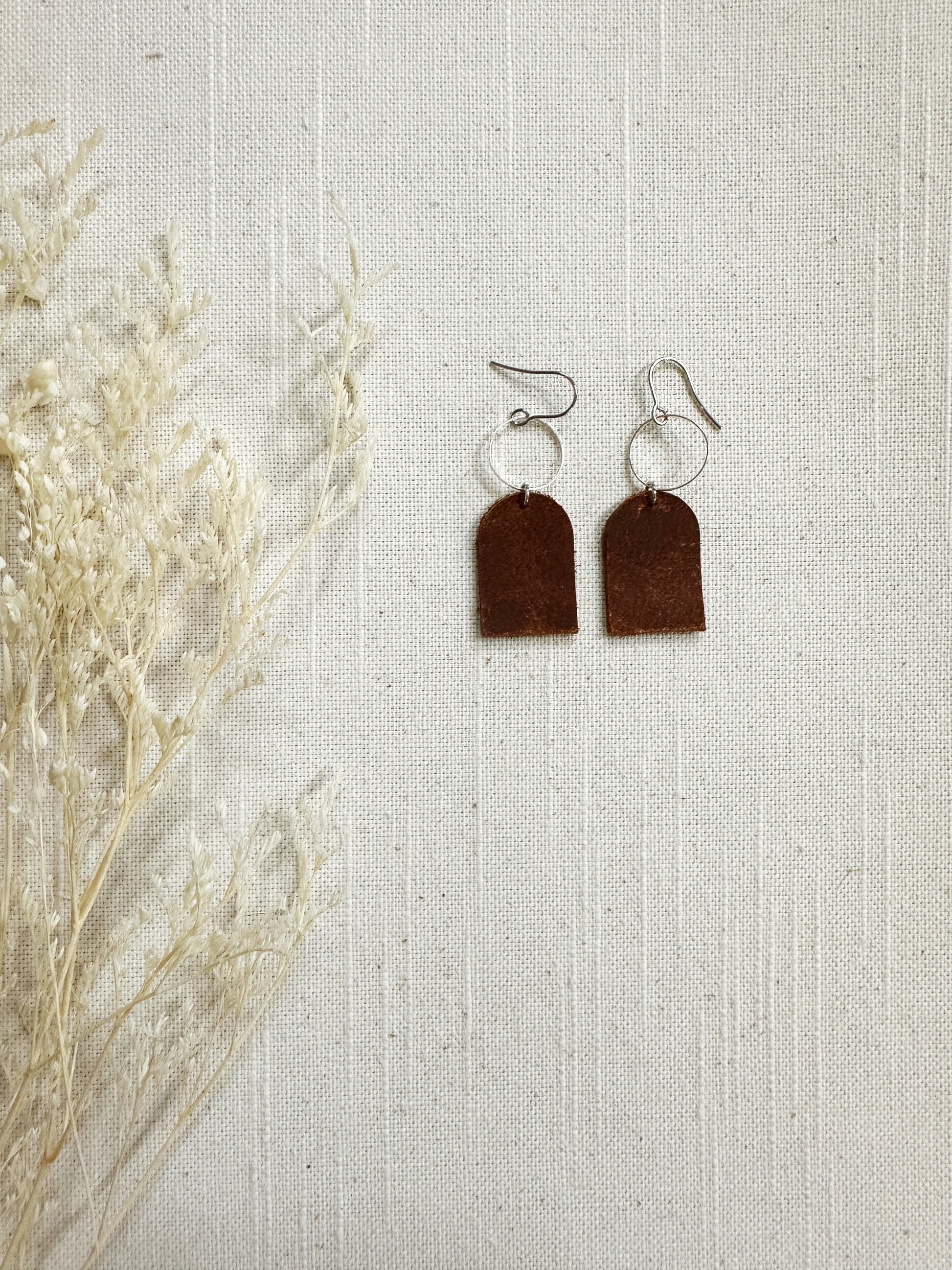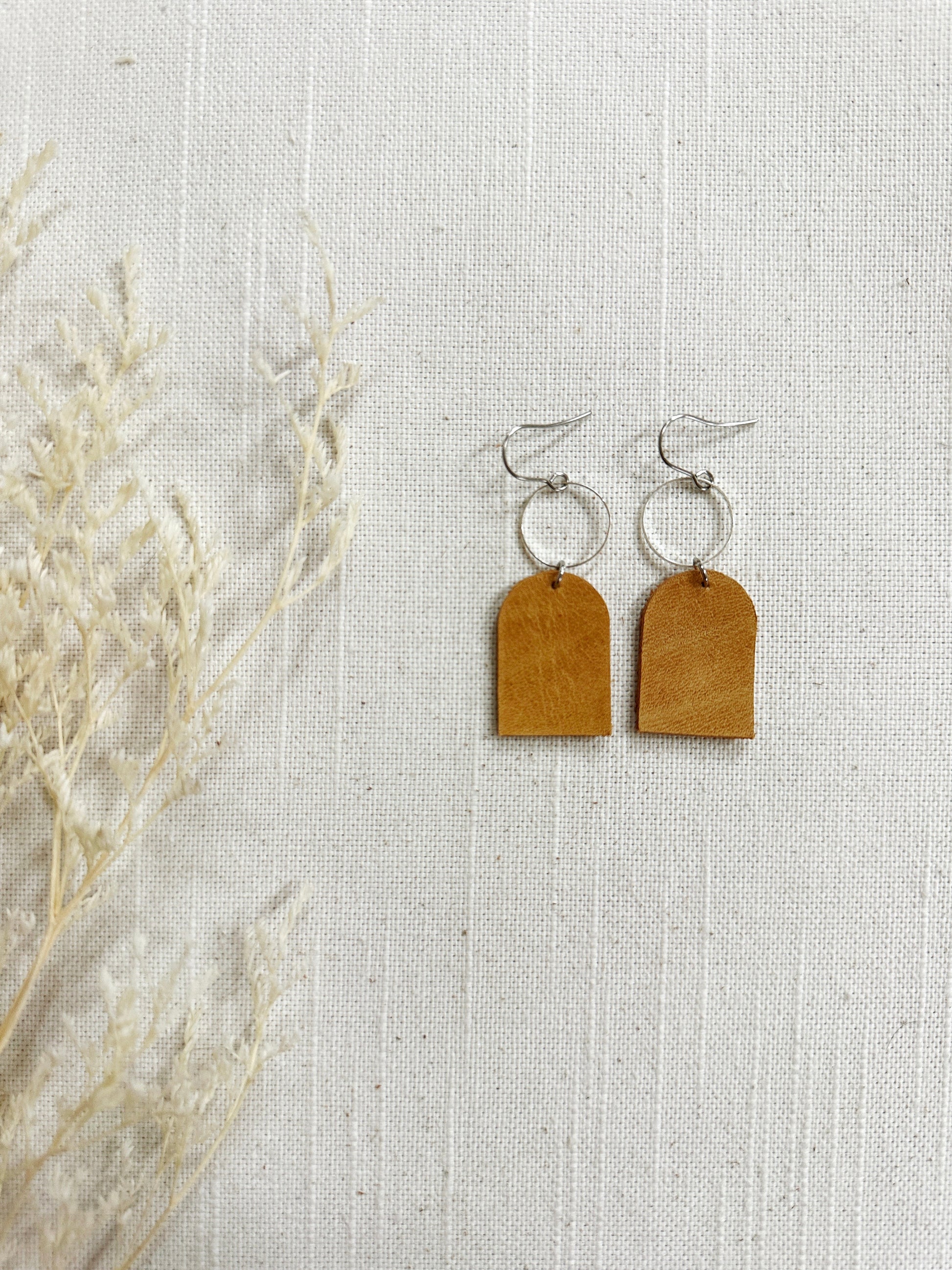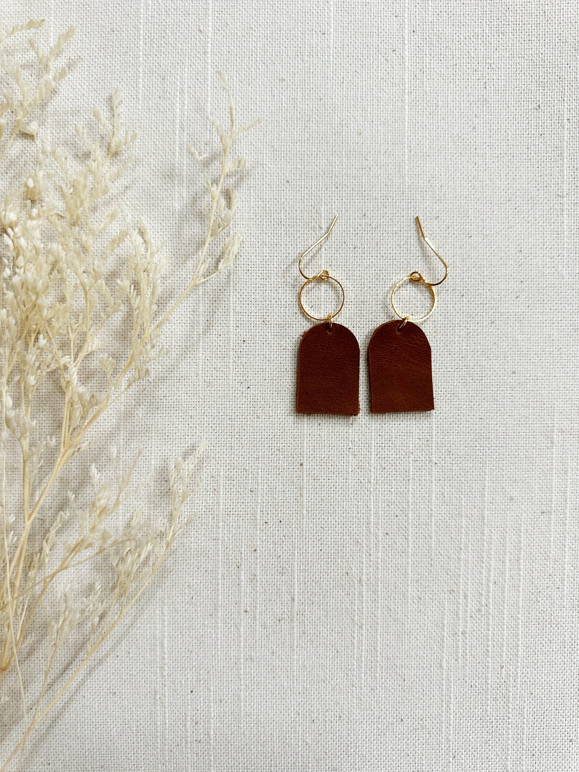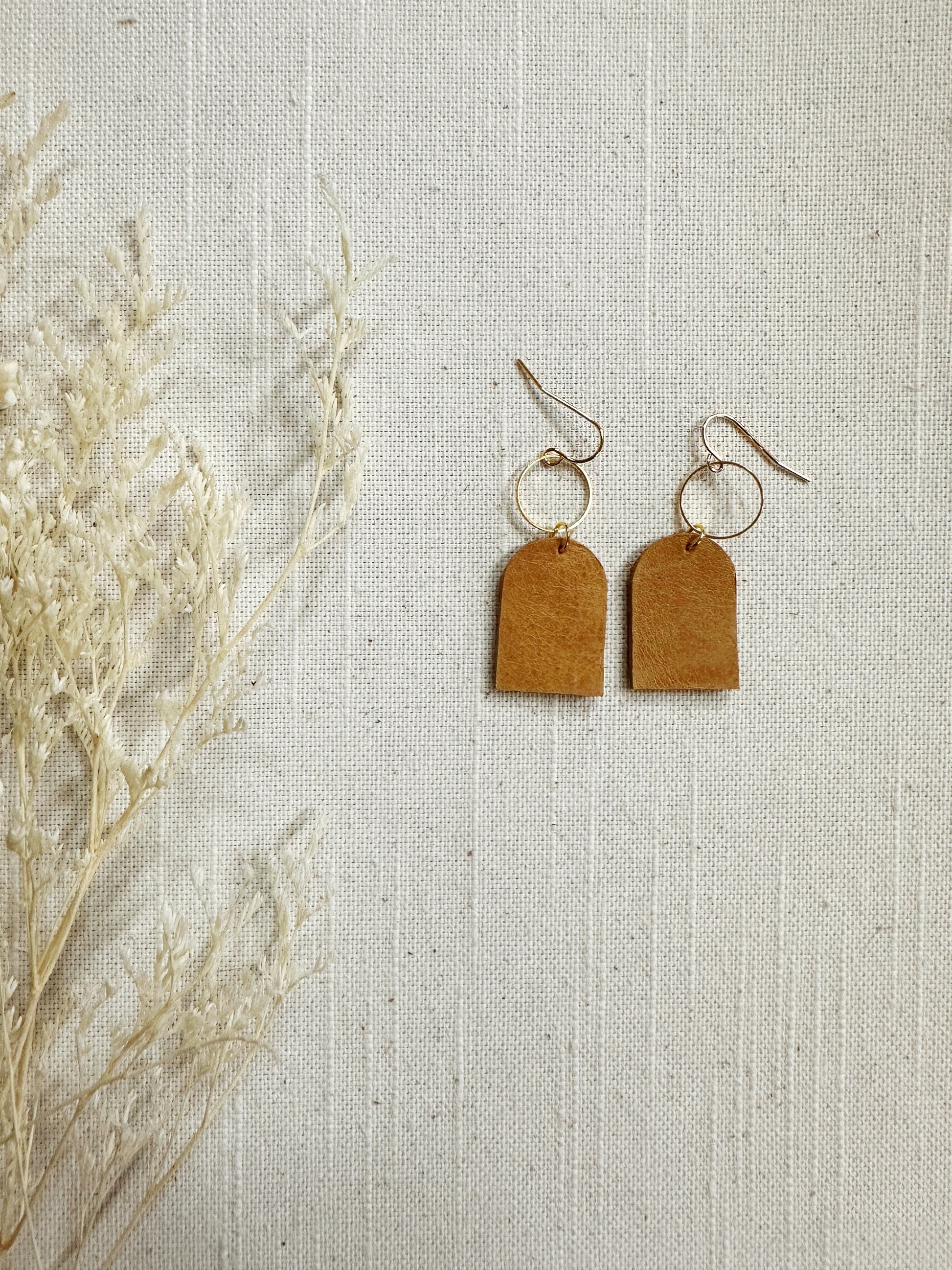 These small leather earrings feature a delicate arch design and come in your choice of silver or gold hoops.