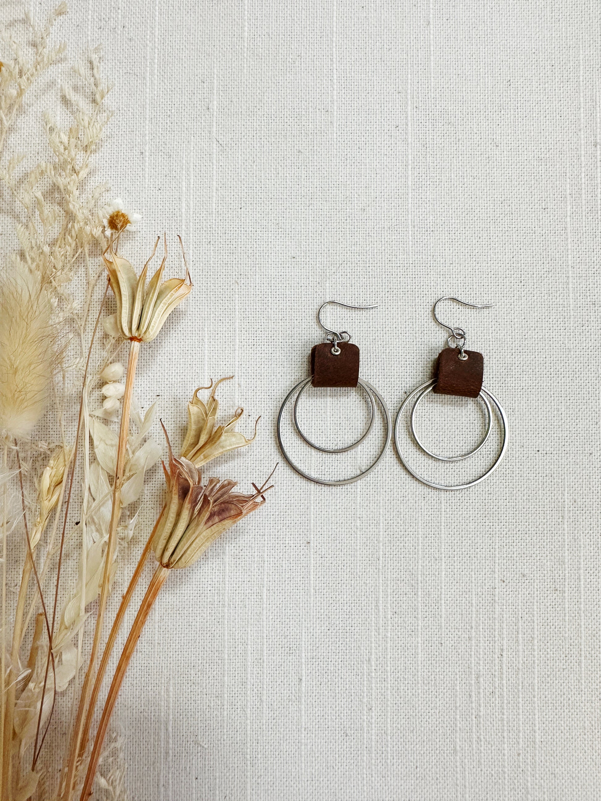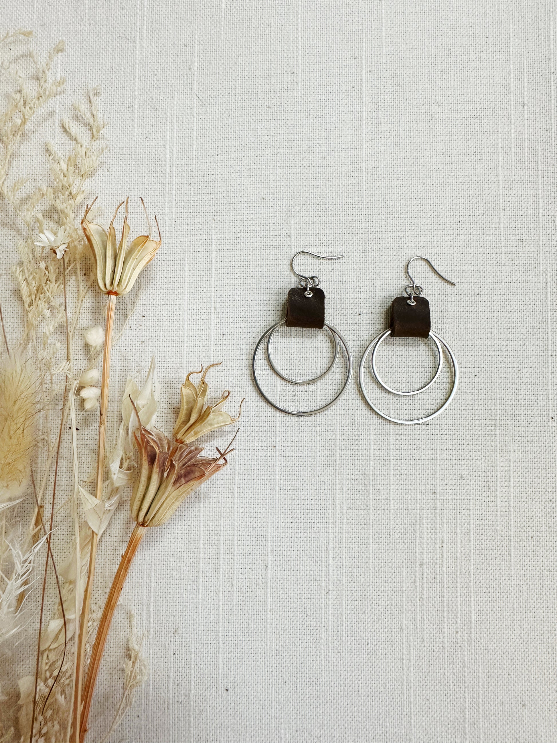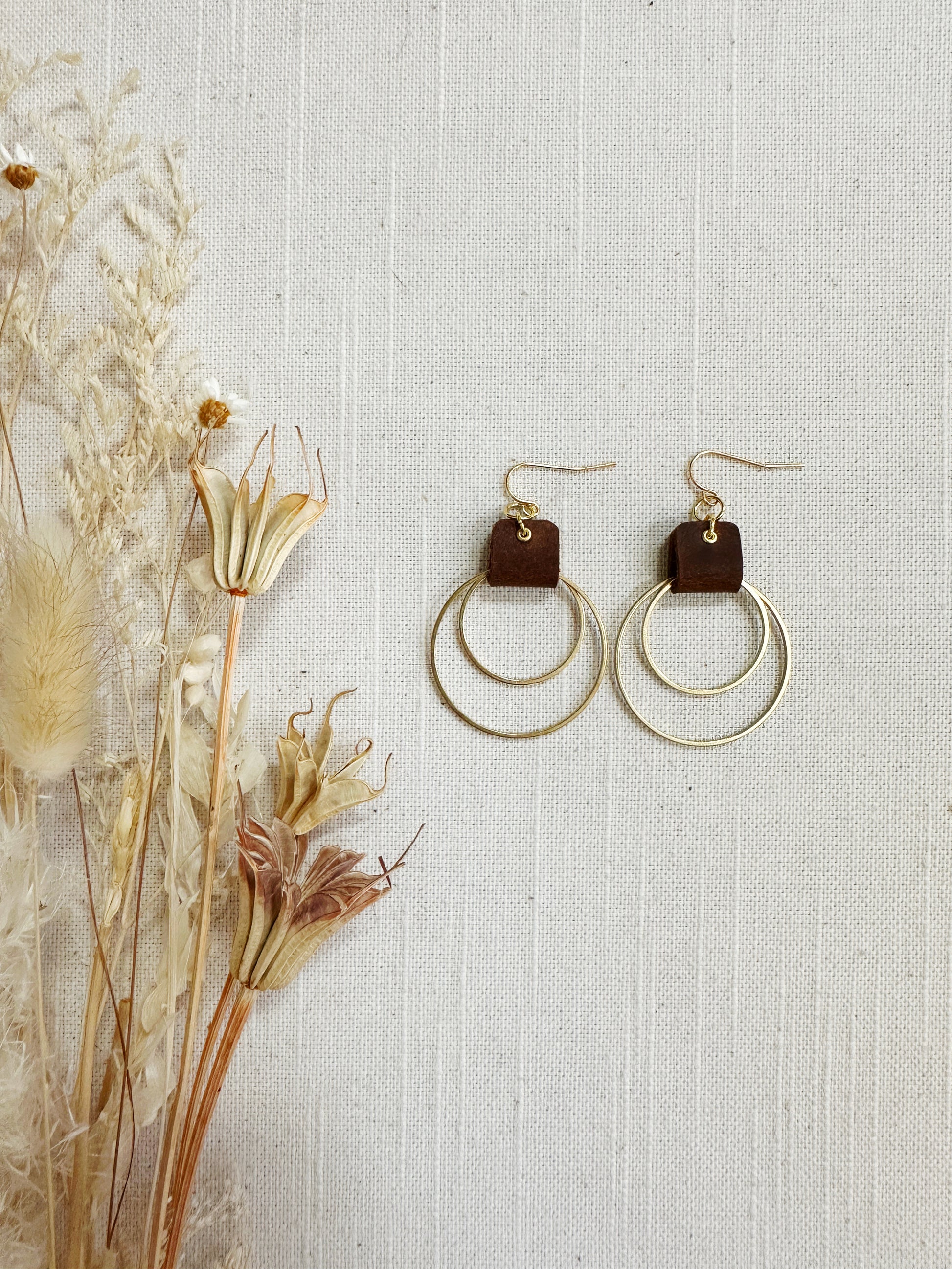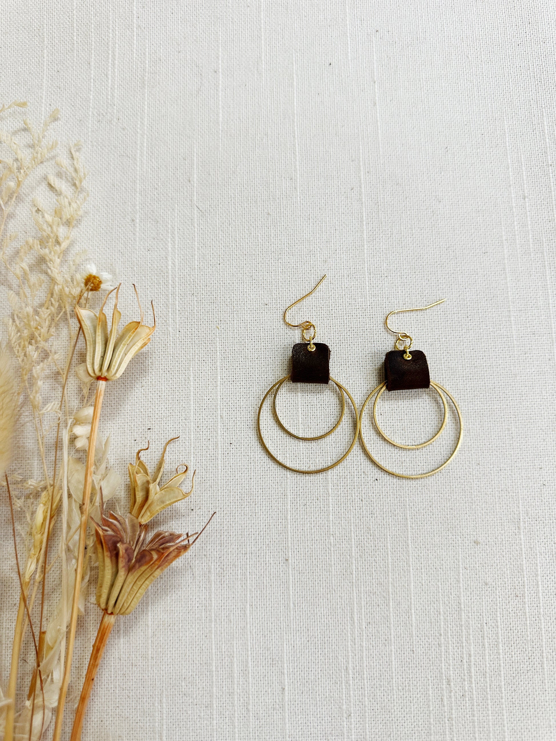 Double metal hoop in brass or stainless steel with a leather loop.