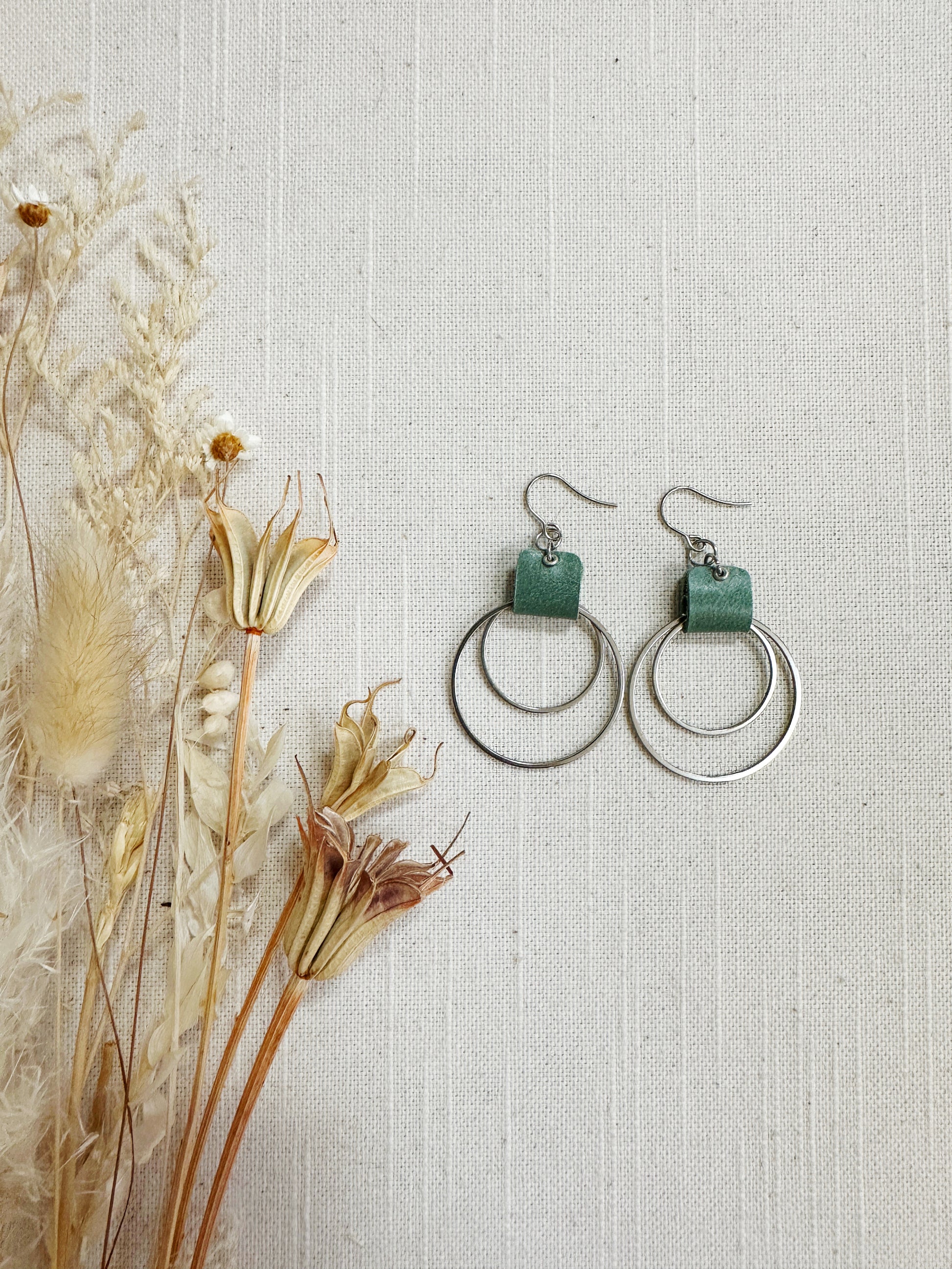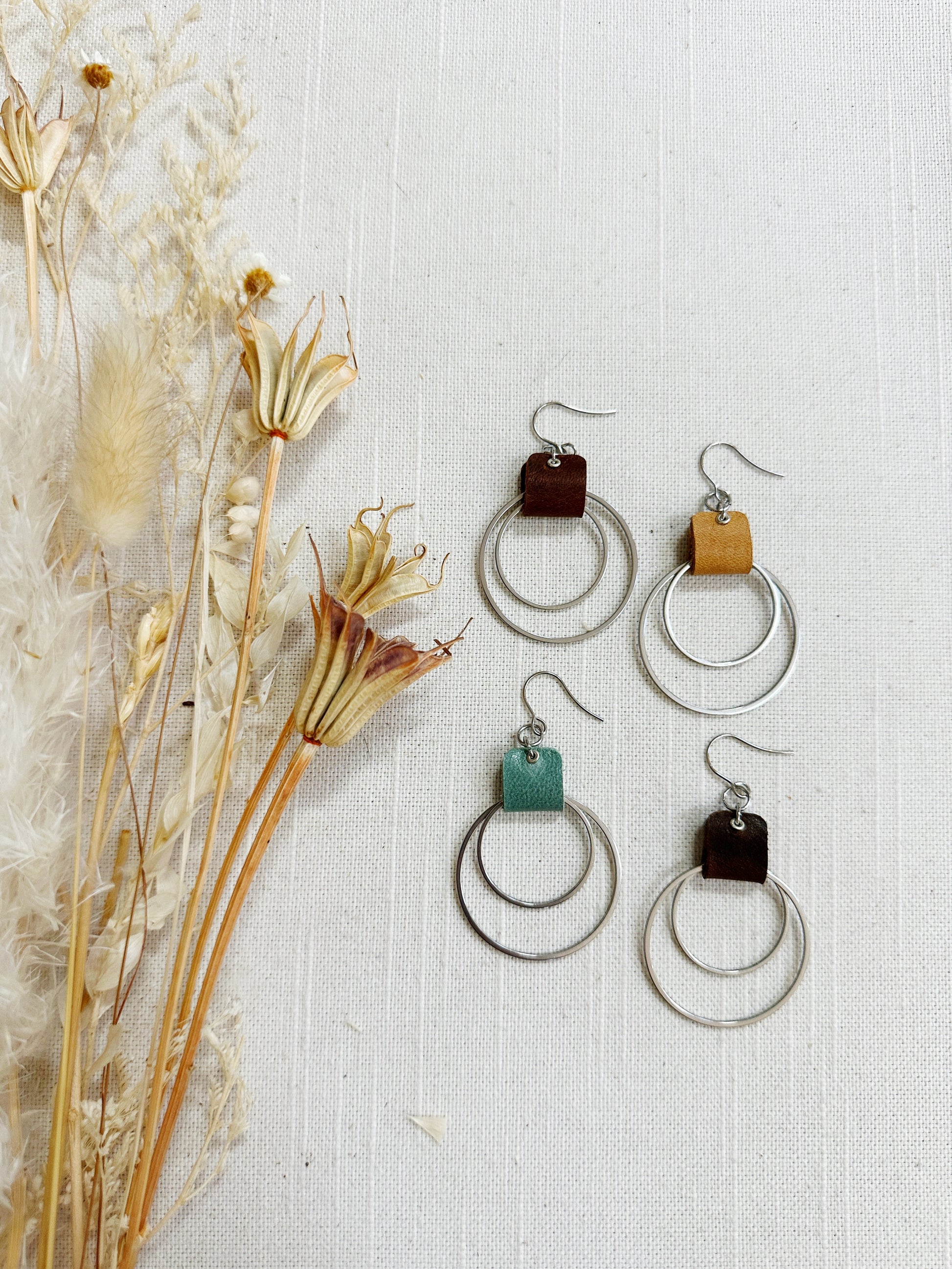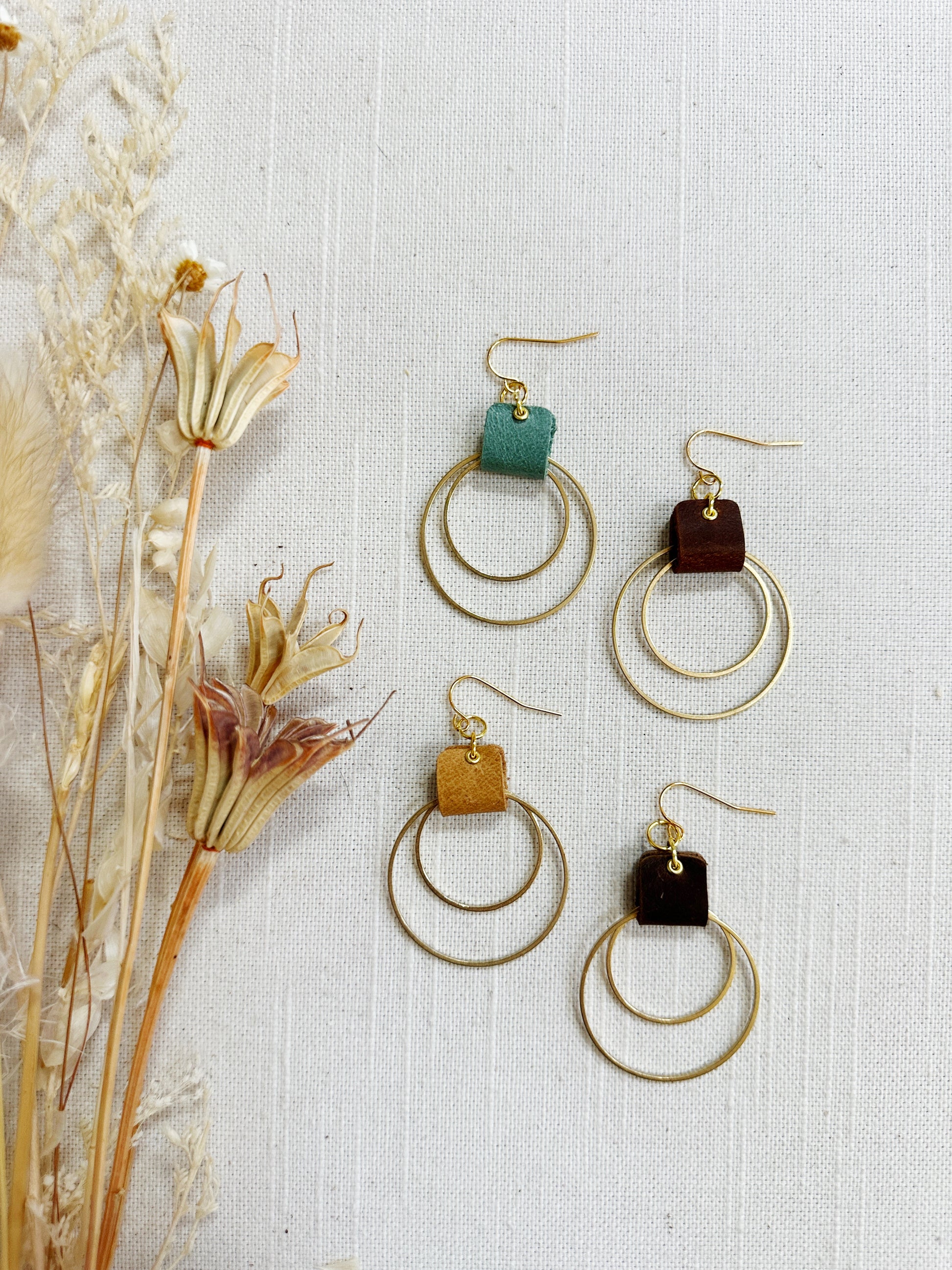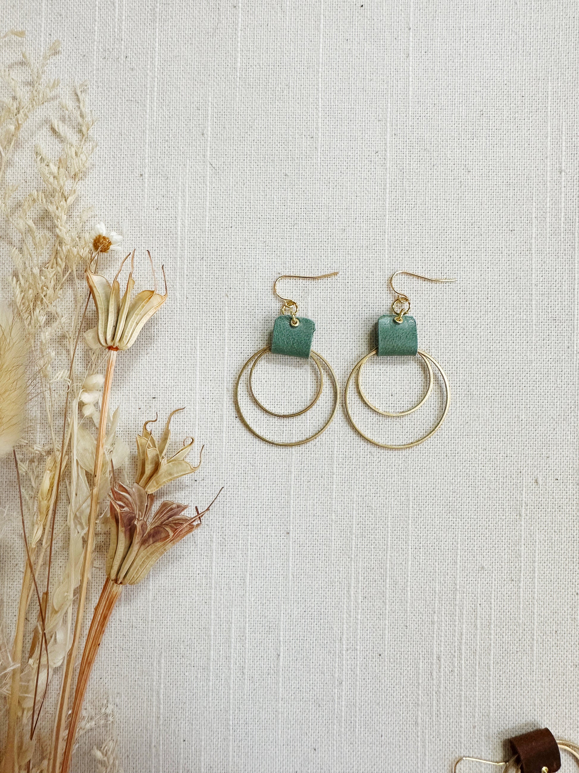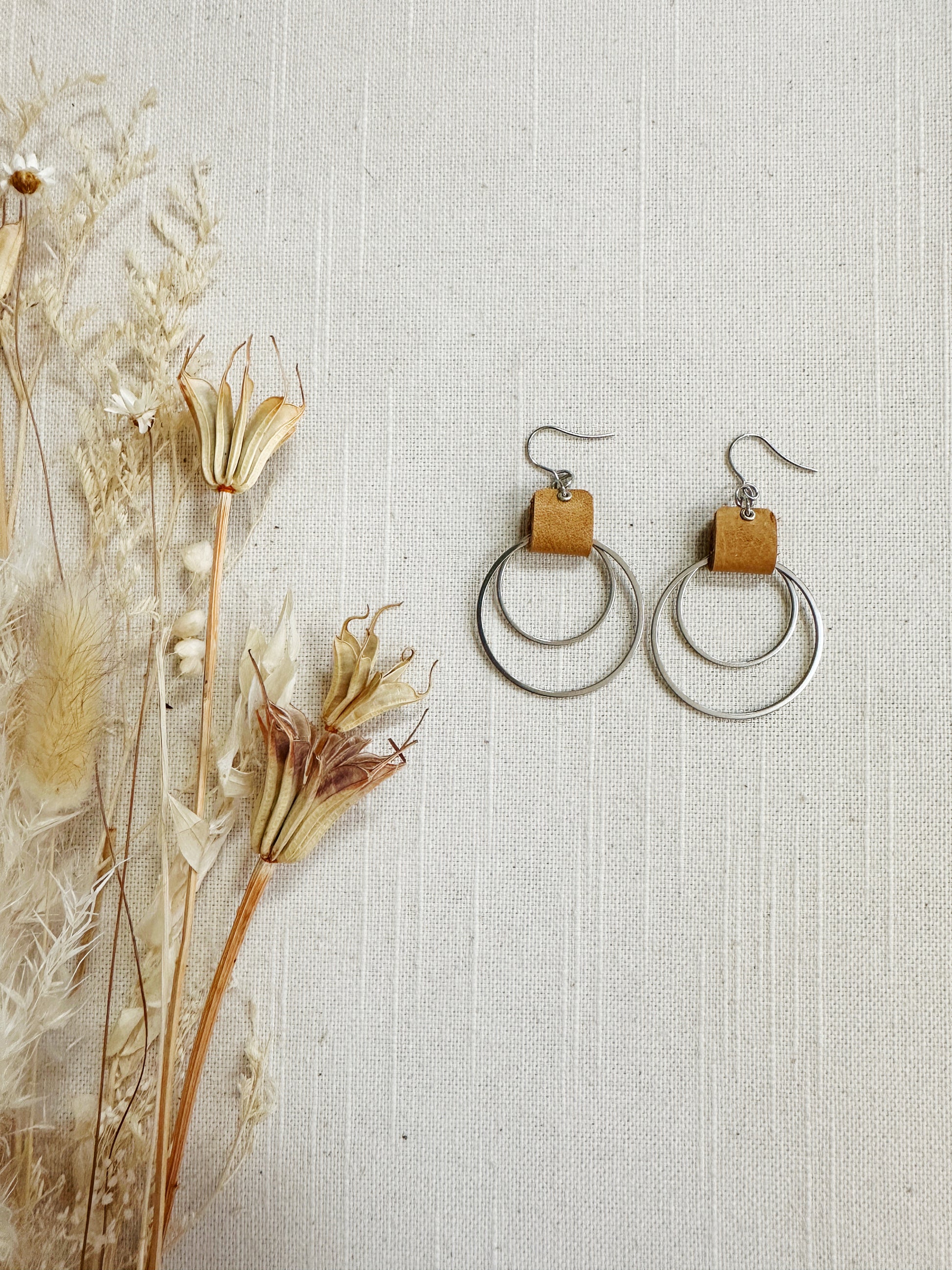 Double metal hoop in brass or stainless steel with a leather loop.