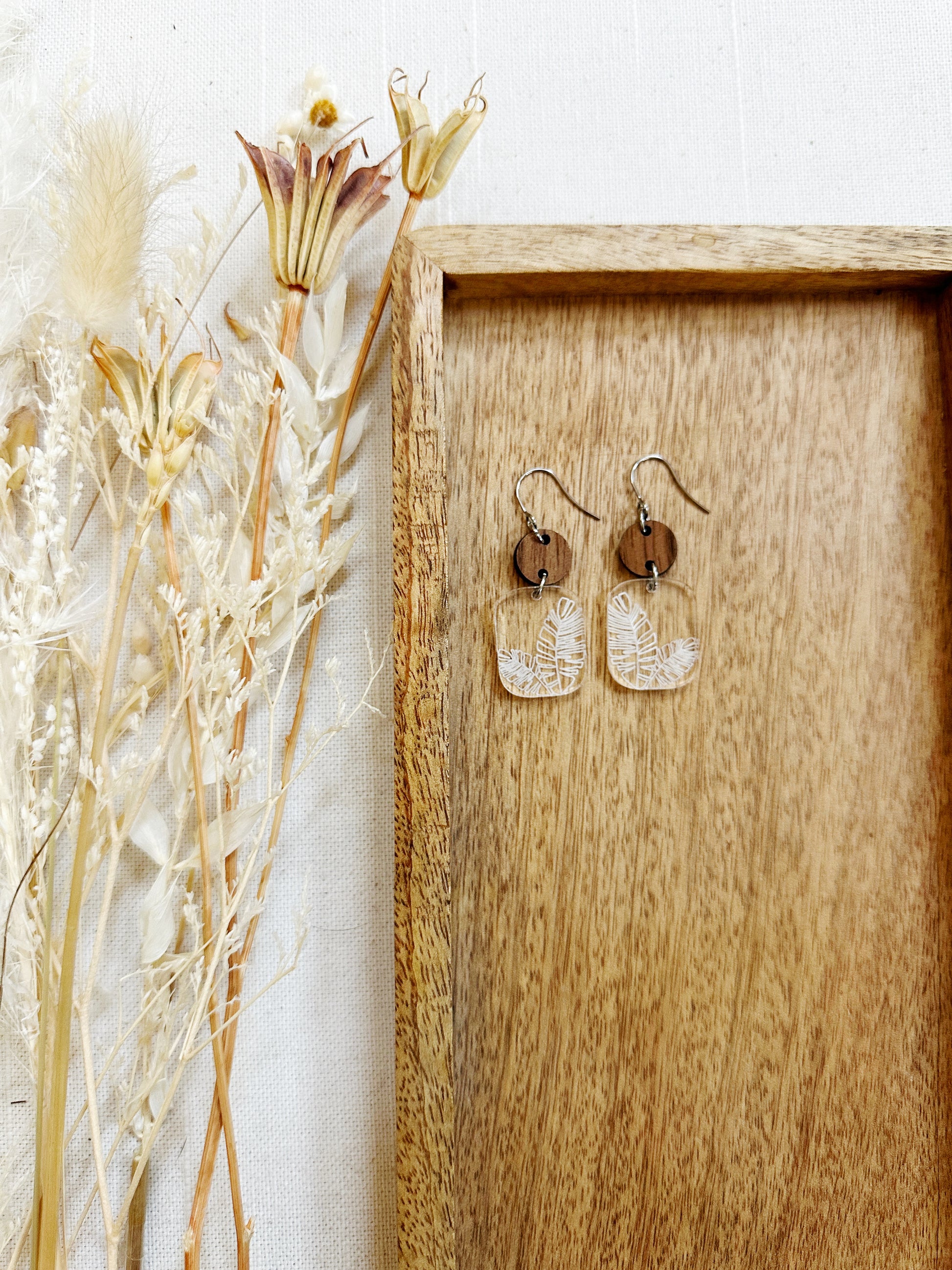 Double monstera leaf laser cut on clear acrylic with walnut plywood finding.