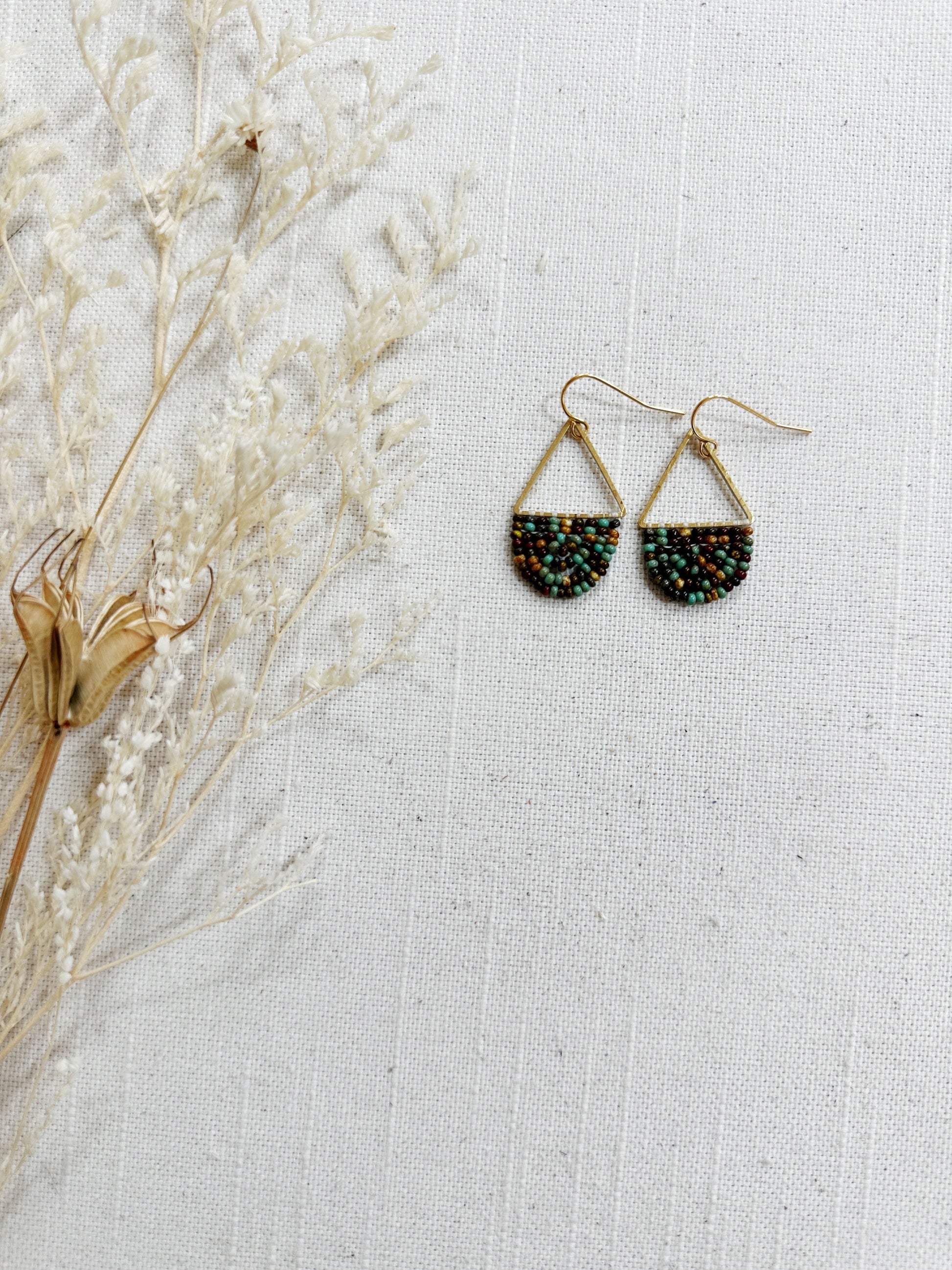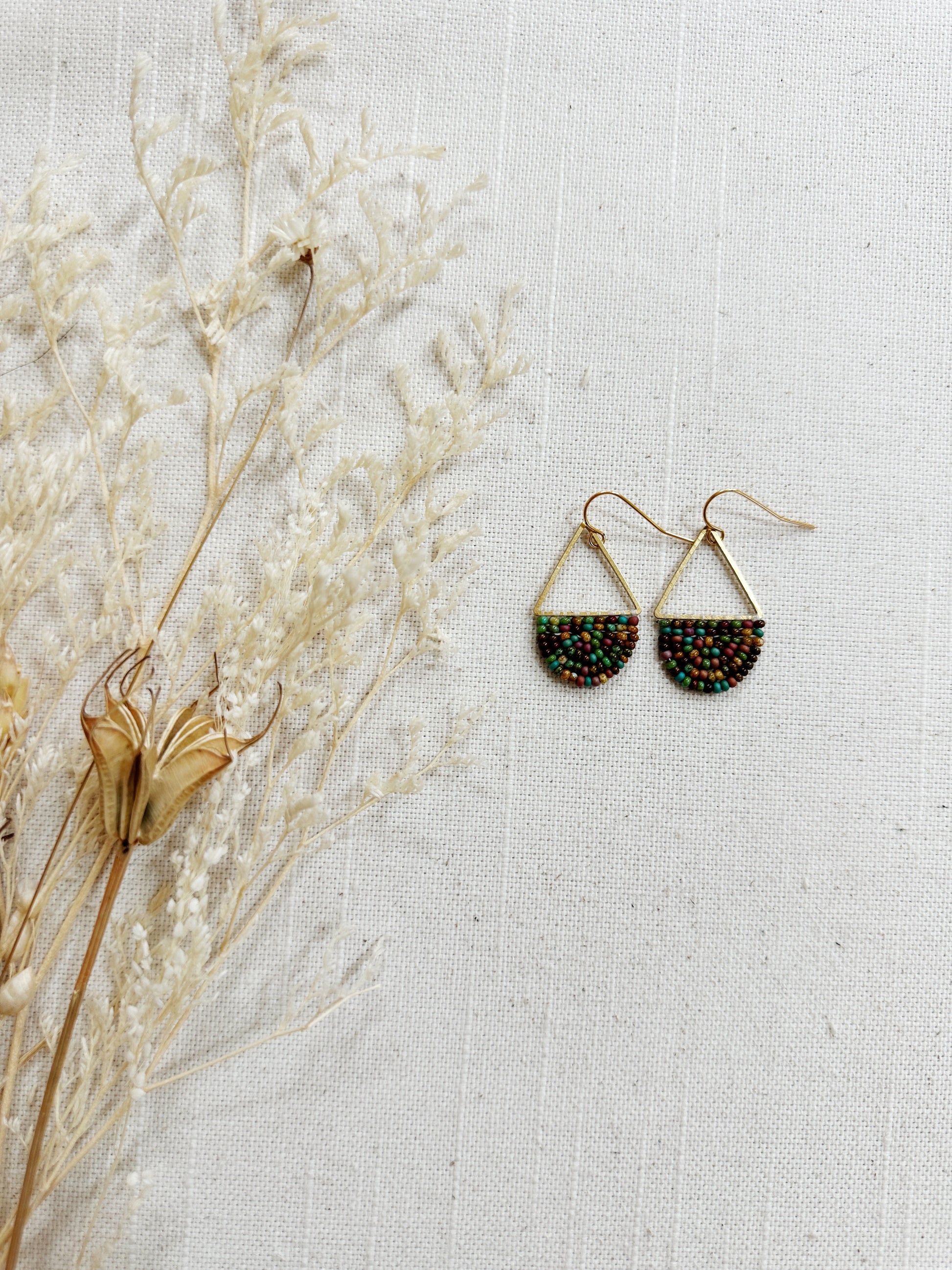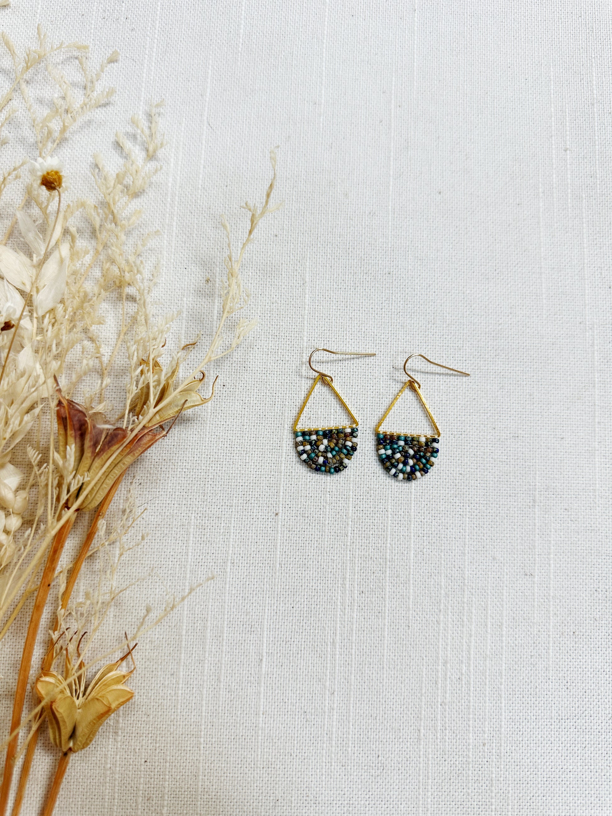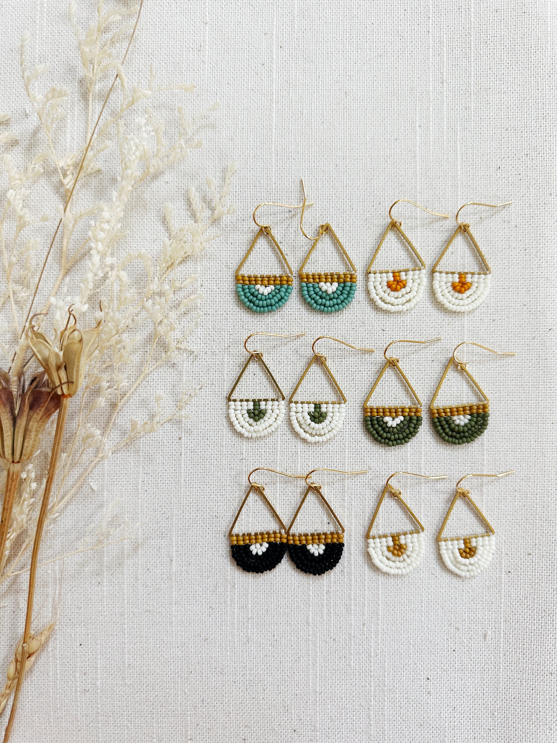 The mixed beads earring (Golds & Creams, Reds, Browns & Turquoise, Pinks, Browns, Greens & Turquoise) these are not identical earring sets and not two pairs will ever be the same. What you see in the photo is an example of what the style looks like but the beads will not be in the same order. It’s a collection of colors mixed together.