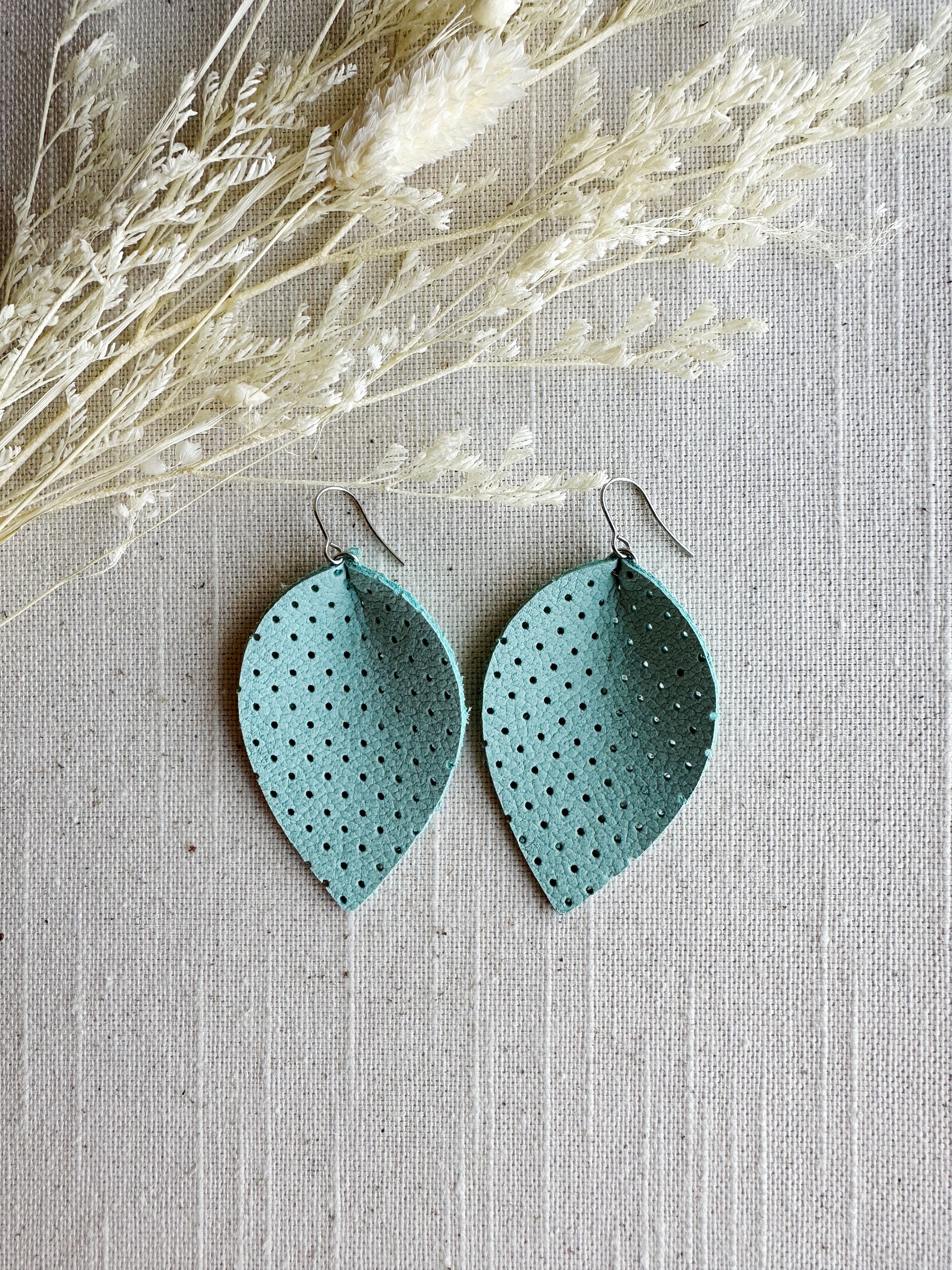 Pinched tear drop braided leather earrings. Dots are holes that go all the way through leather.