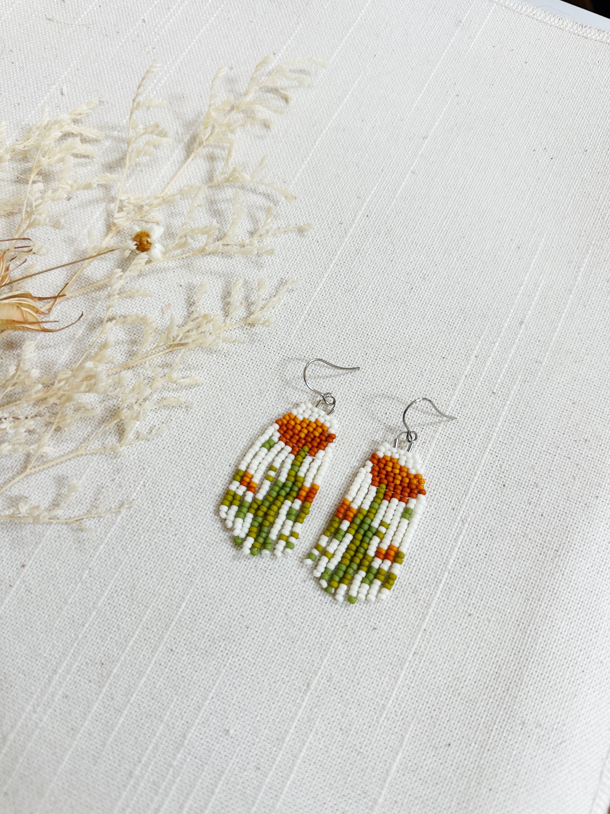 These tiny poppy fringe earrings are perfect foe everyday wear. Pops of Orange and Saffron and varying shades of green can be dressed up or down!