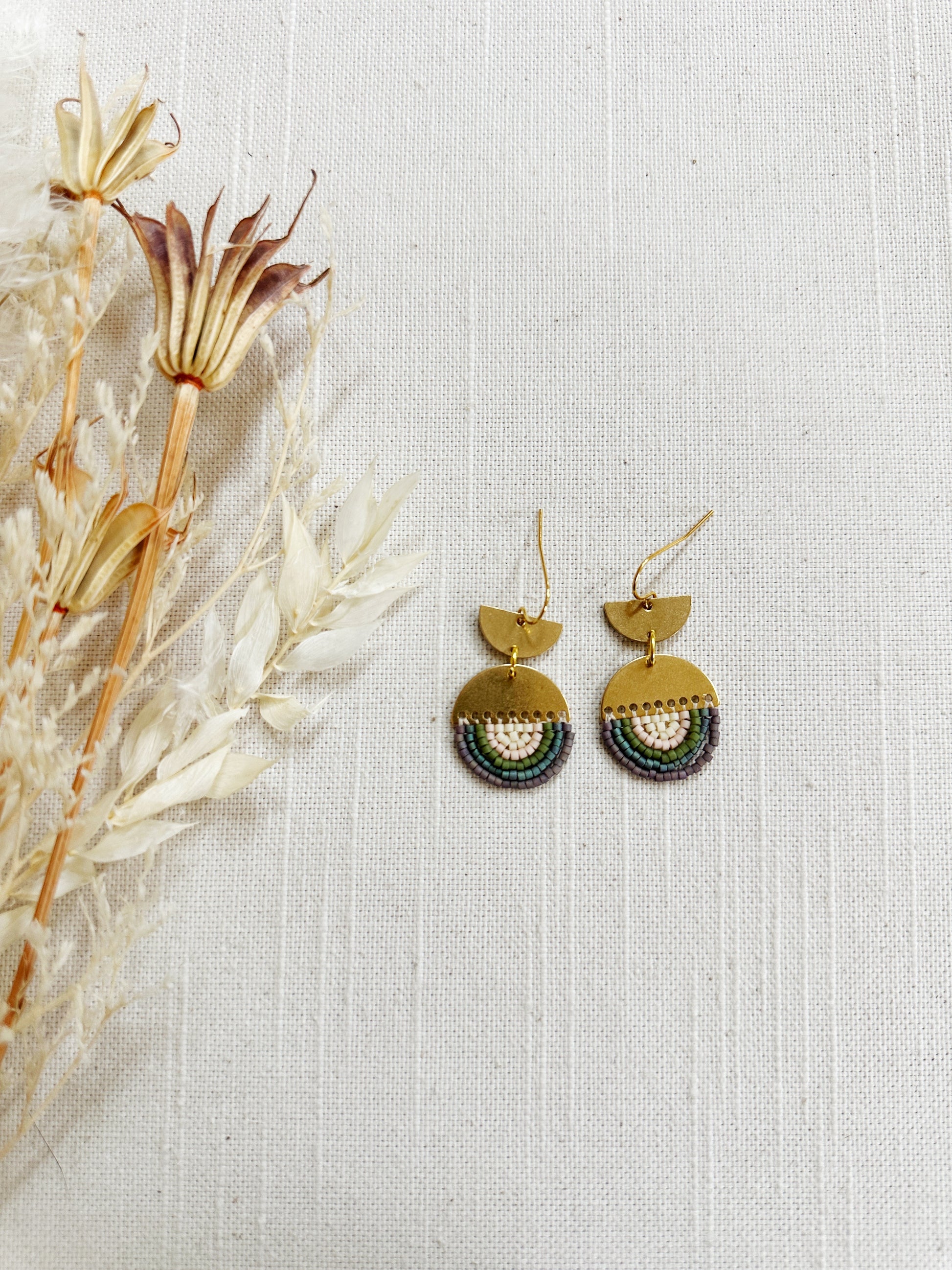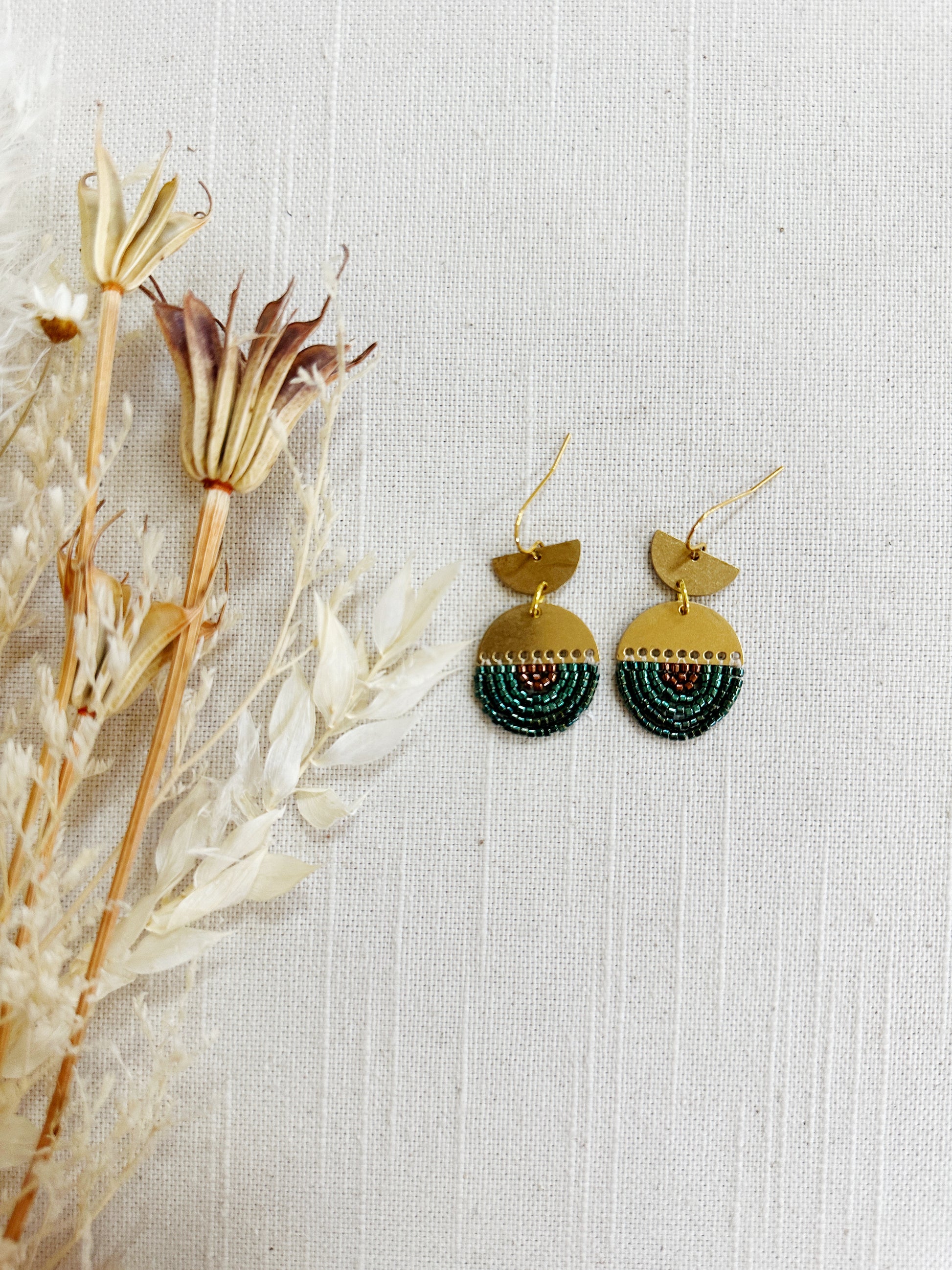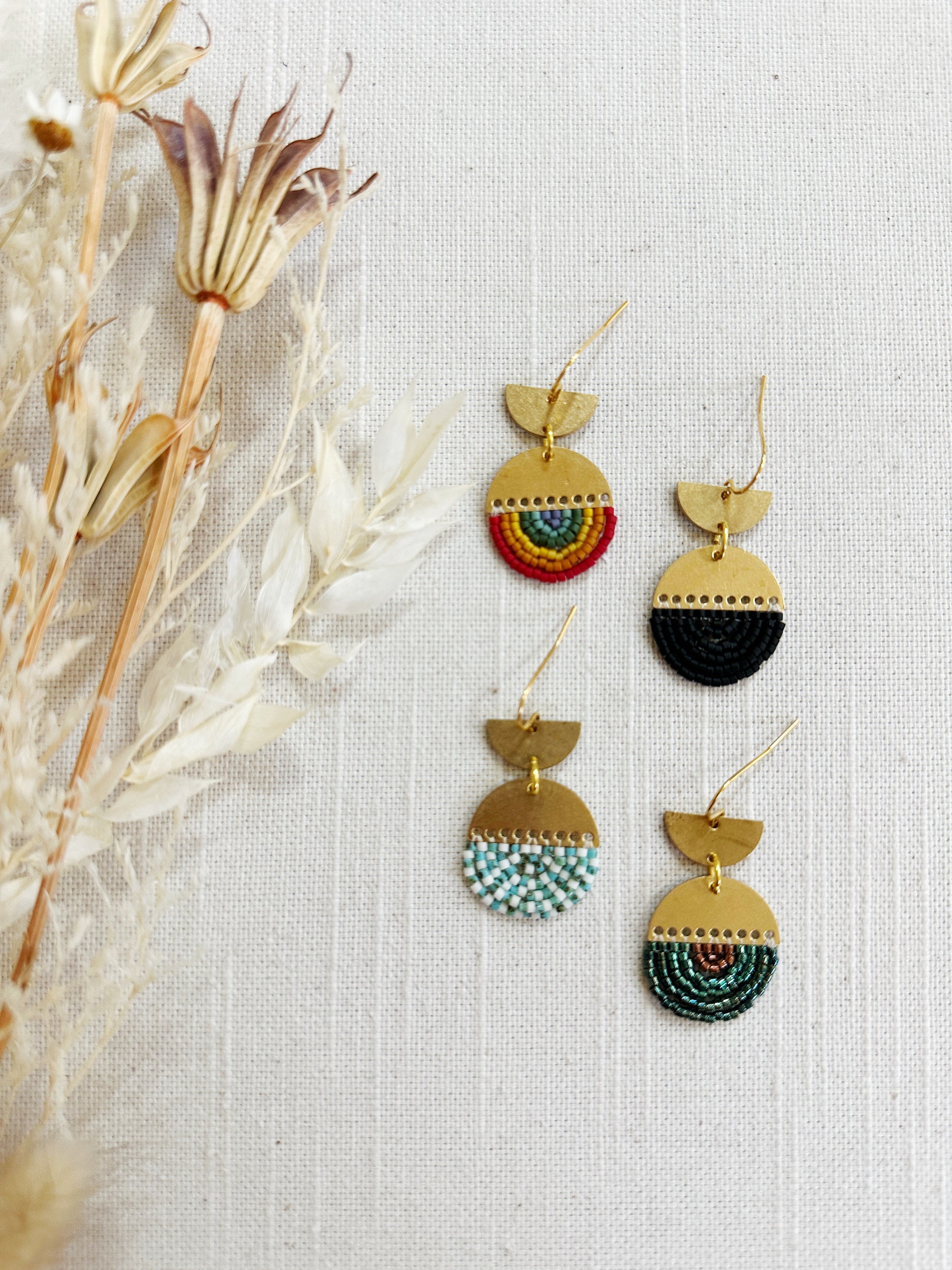 Semi circle moon shaped brass findings with simple beaded designs.