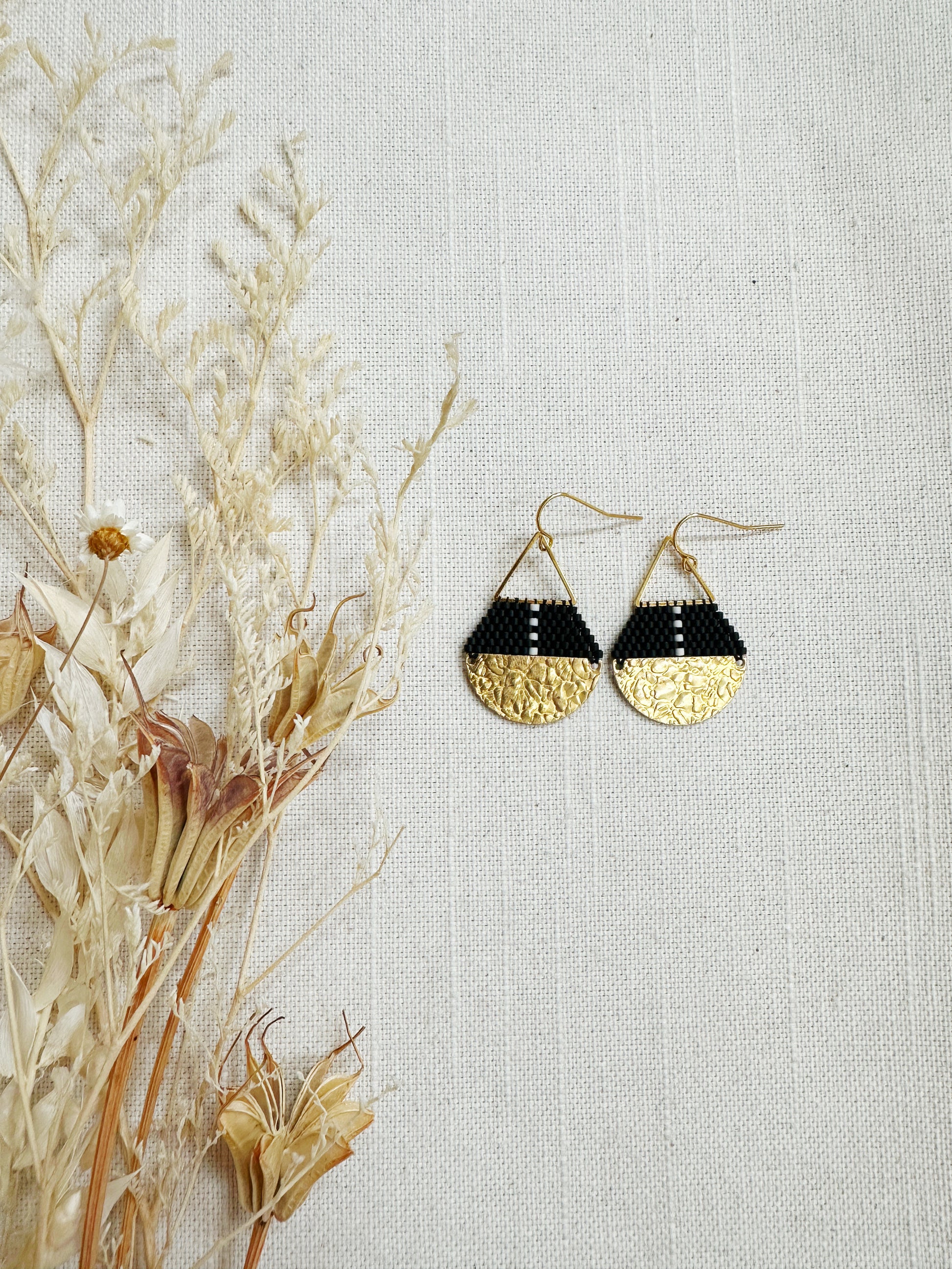 Brass hammered semi circle with a gold plated triangle connected by delica glass beads.