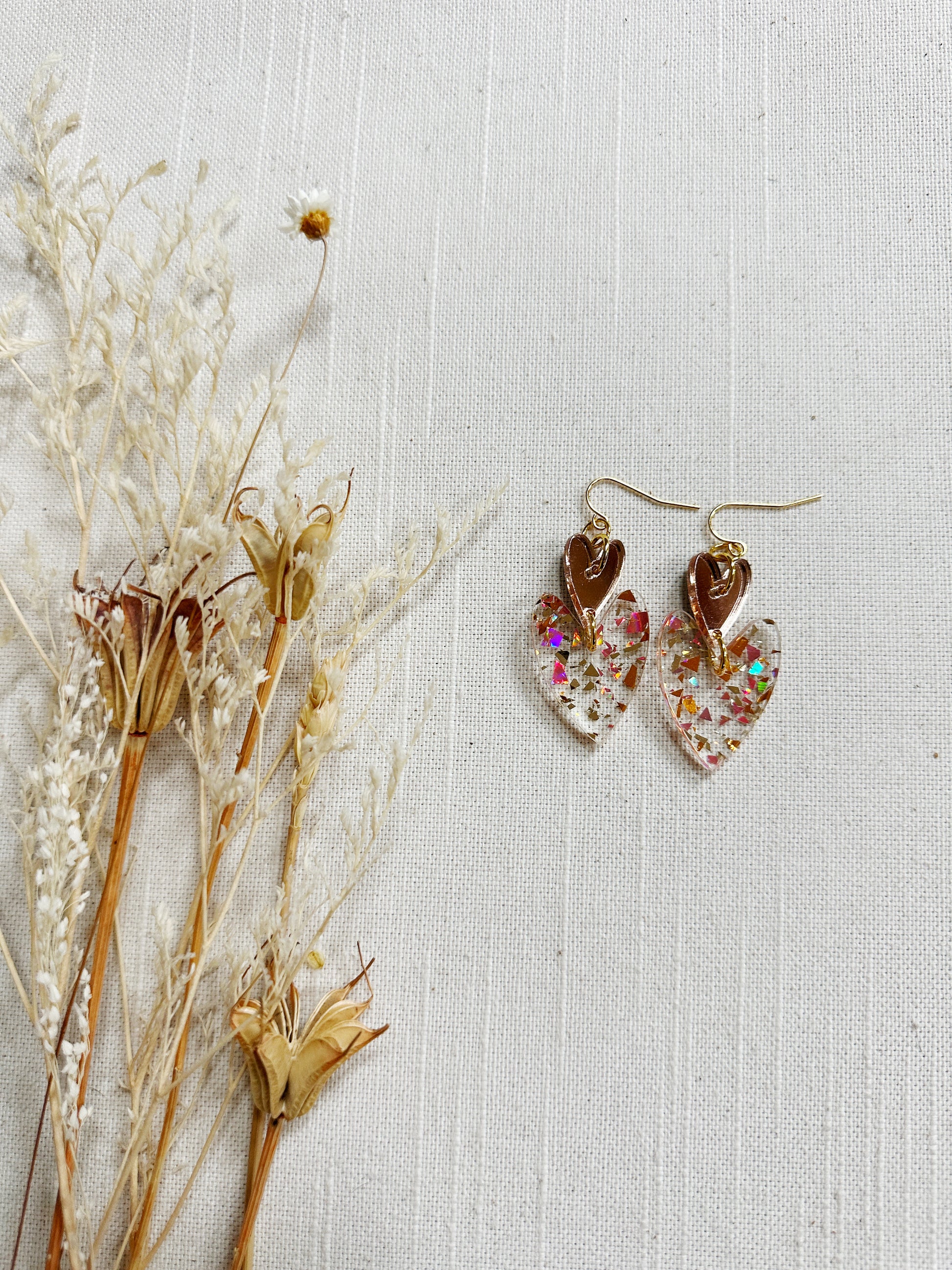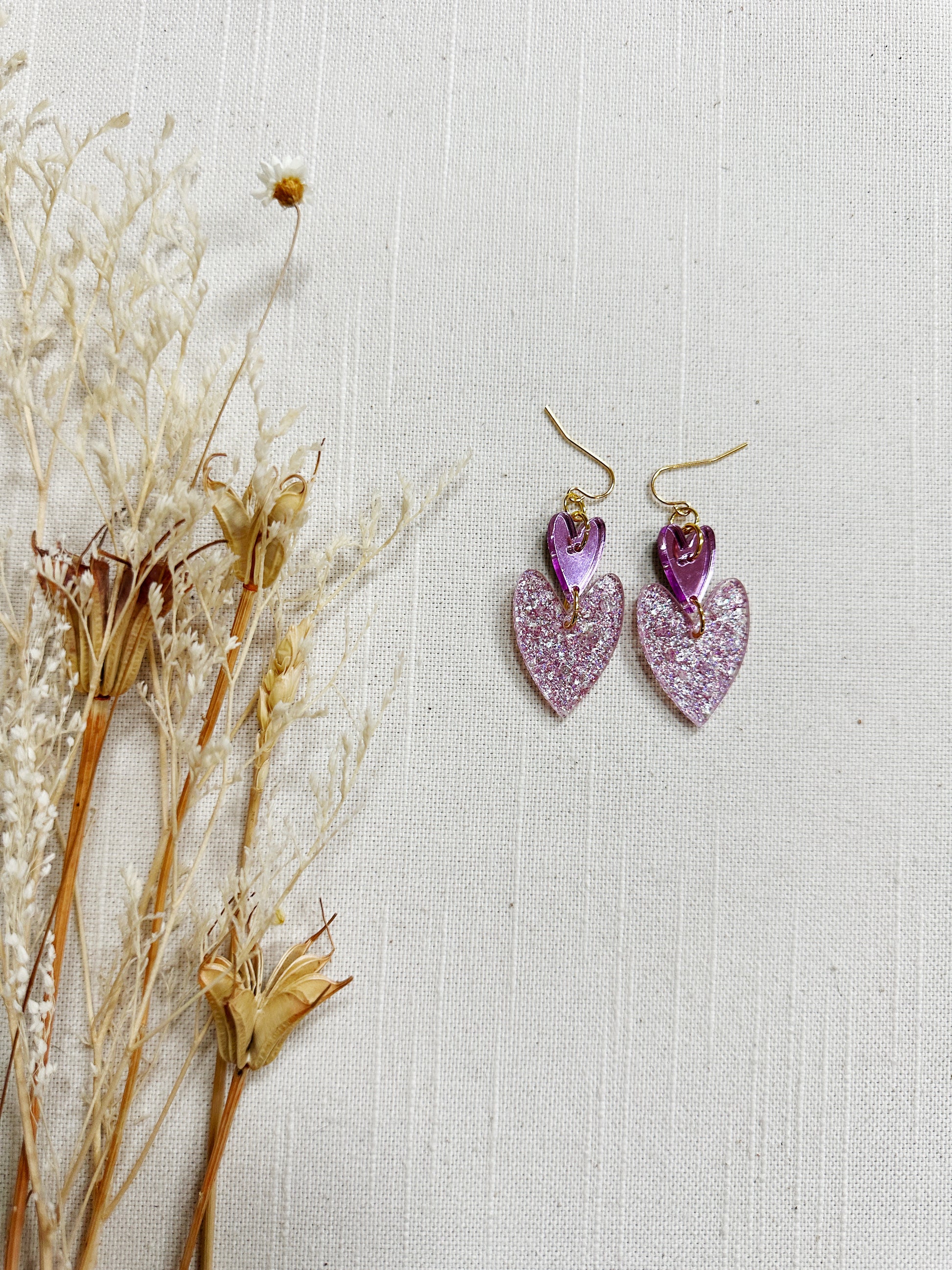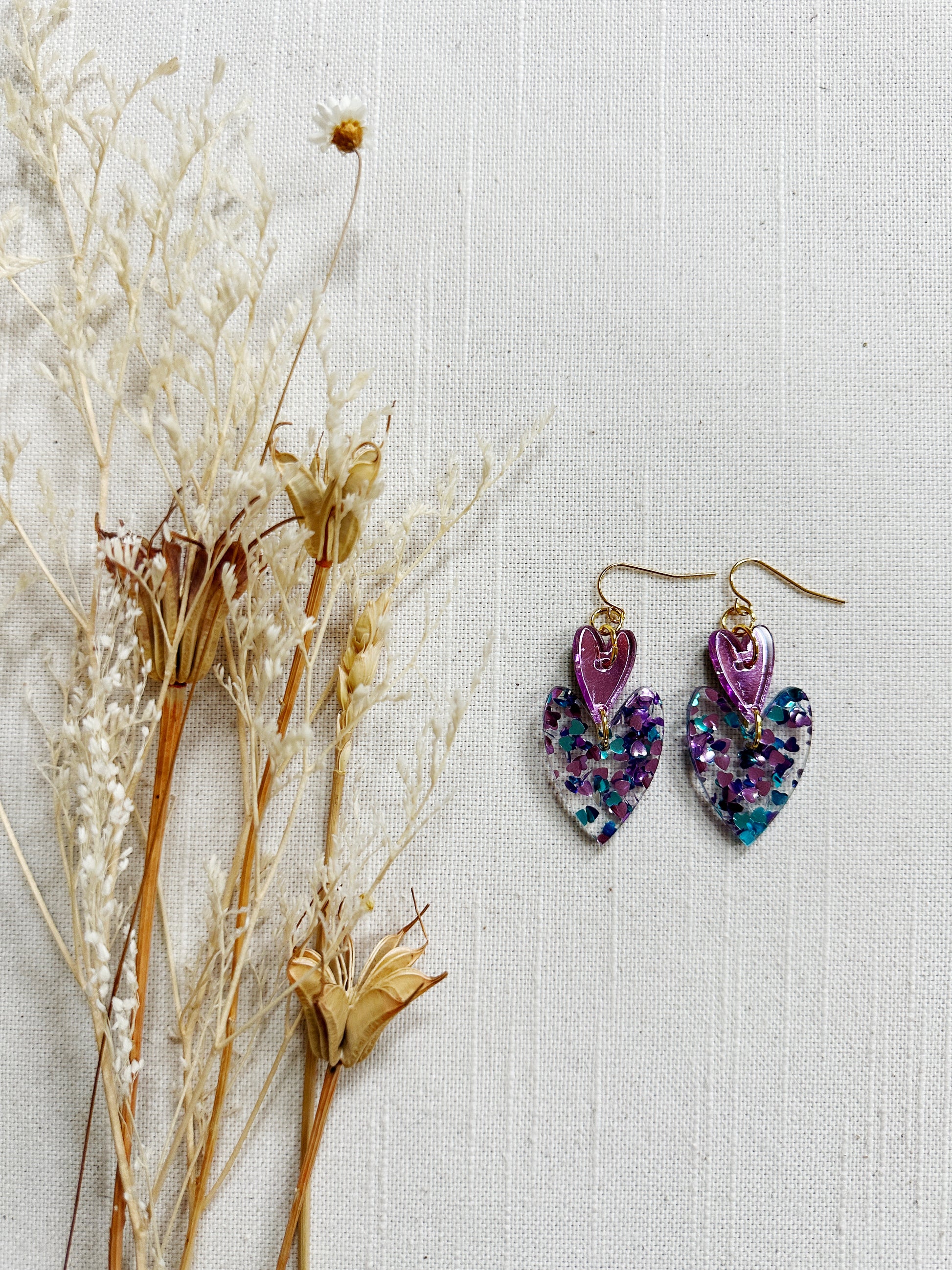 The double oblong hearts are a made with lightweight acrylic and gold plated findings.