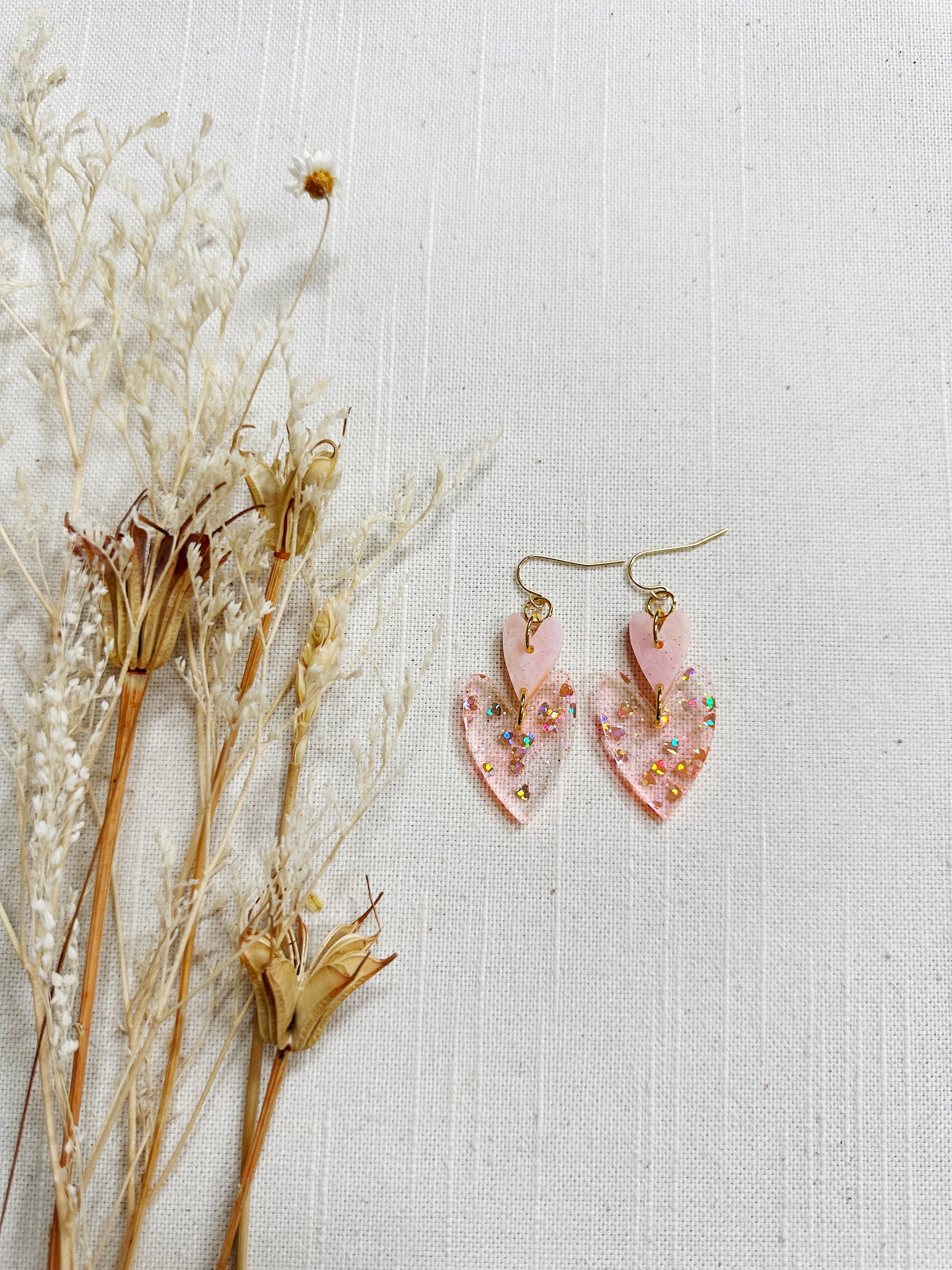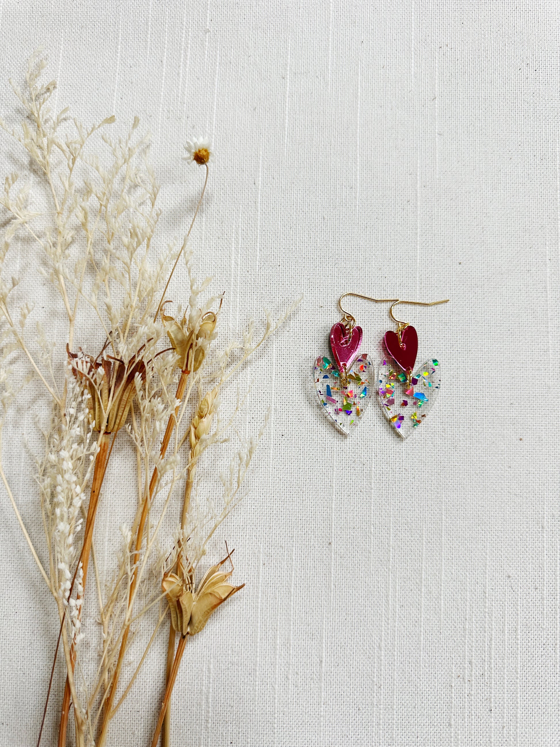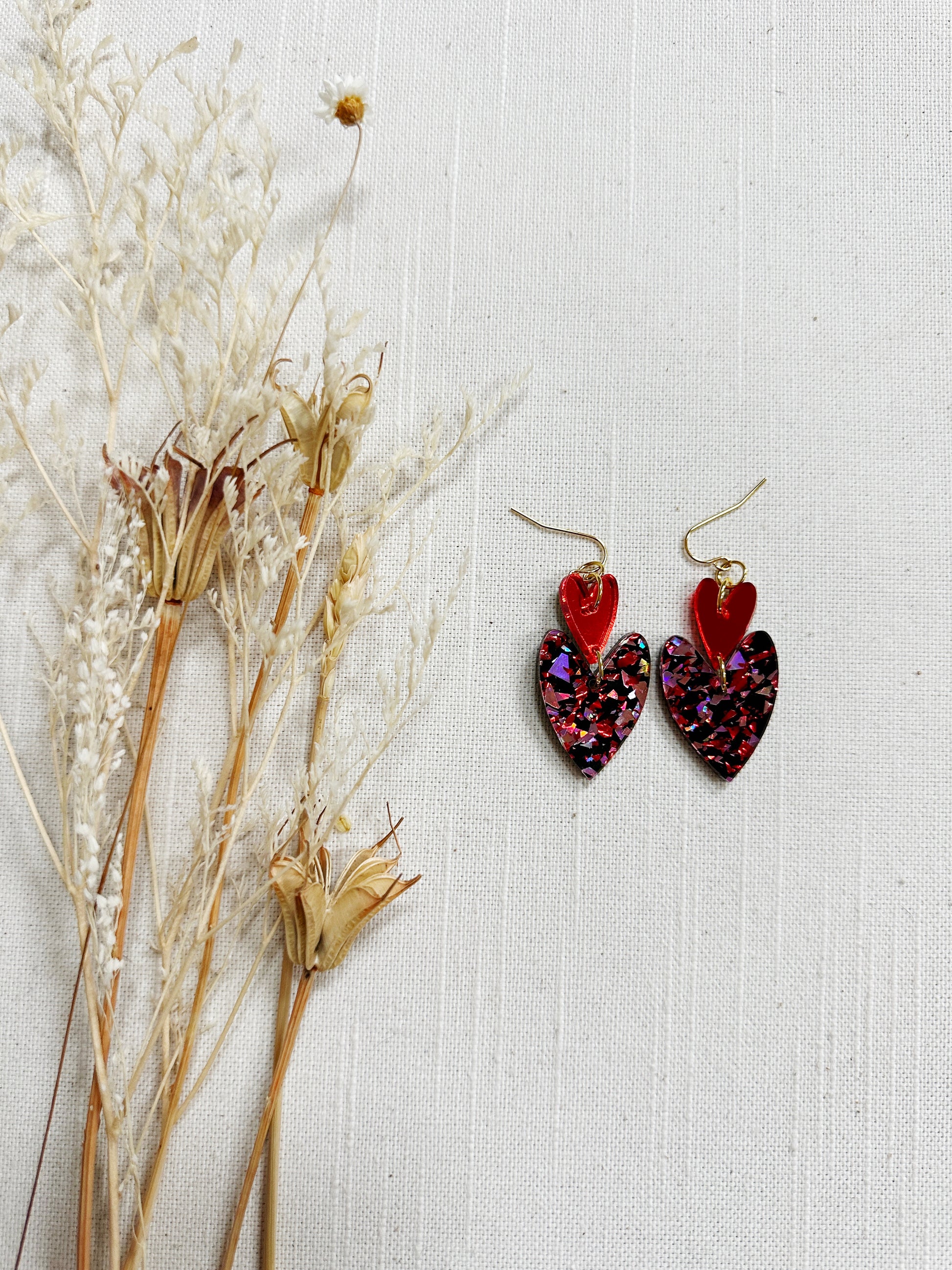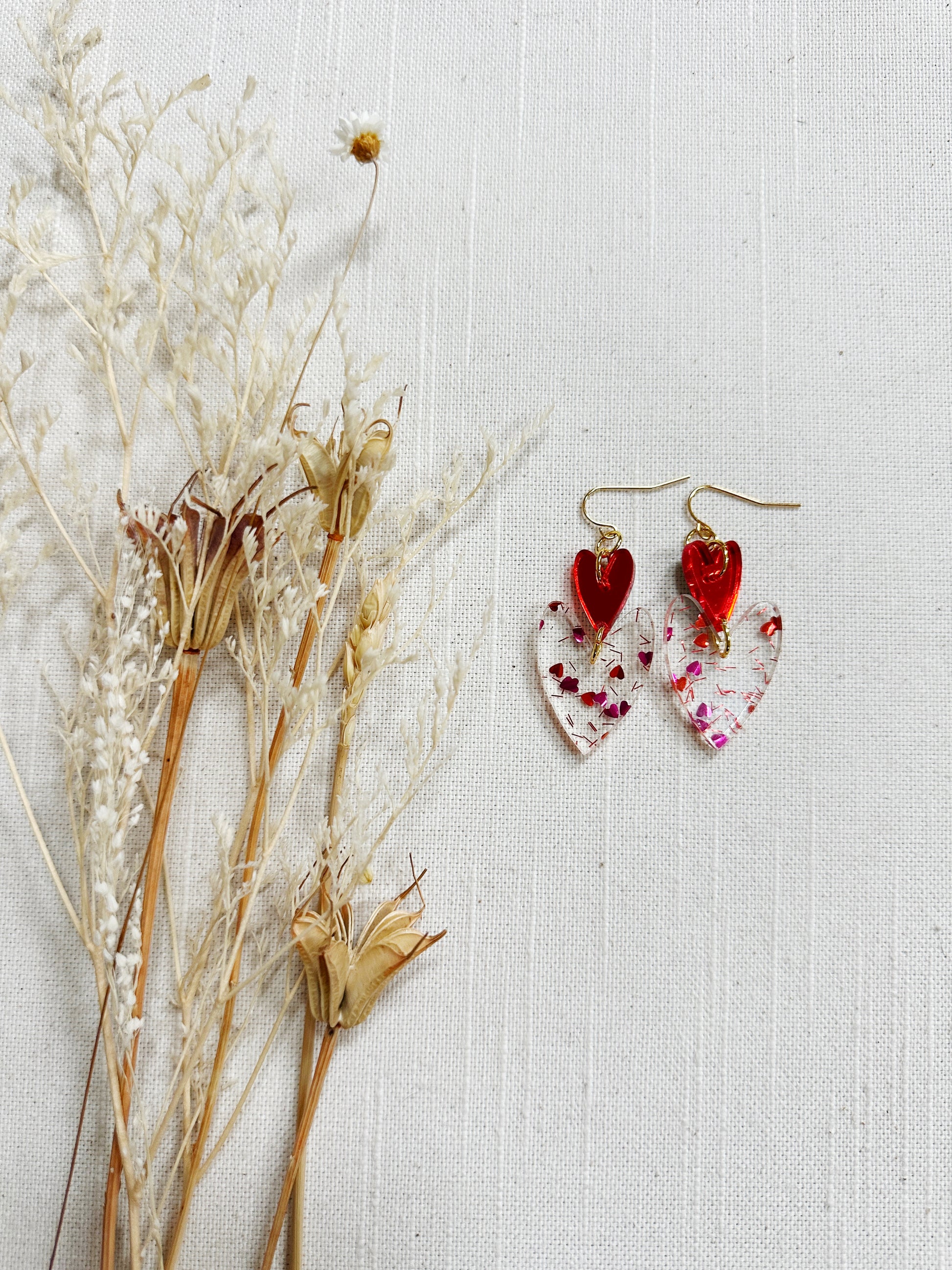 The double oblong hearts are a made with lightweight acrylic and gold plated findings.