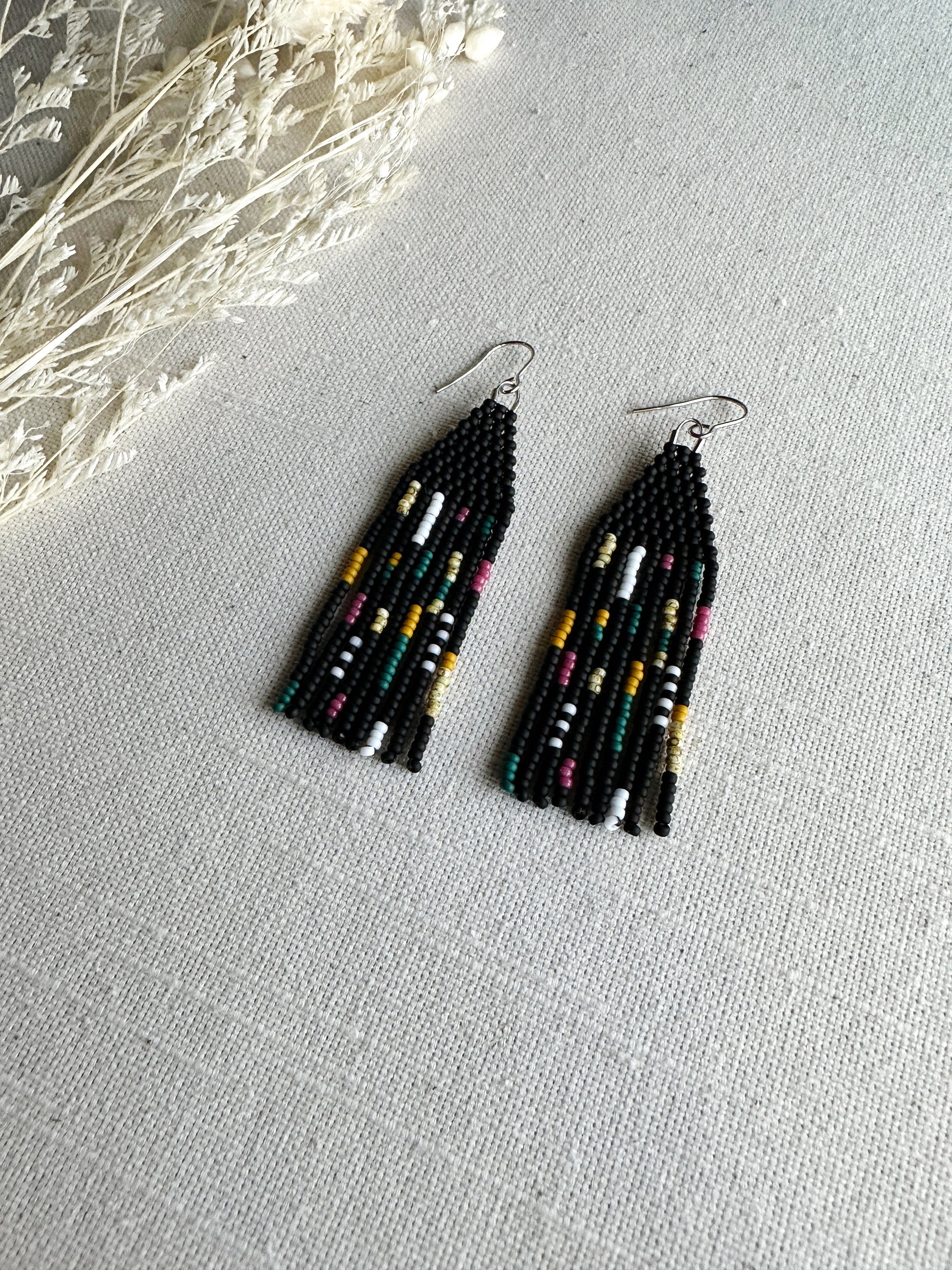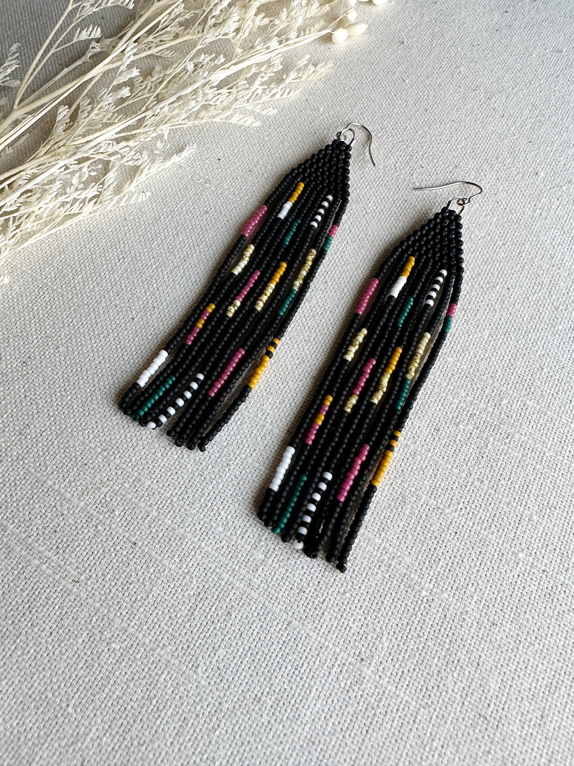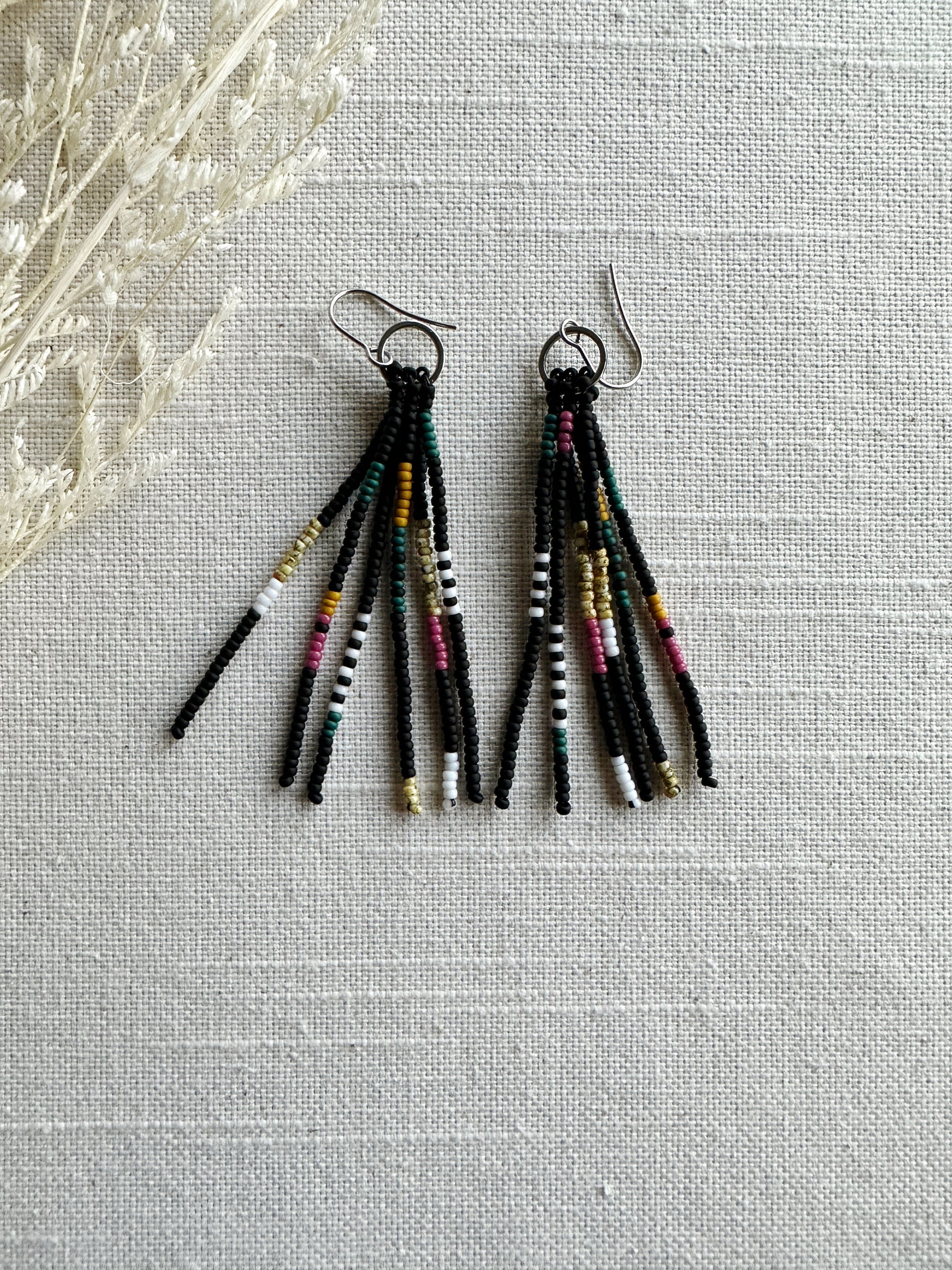 Black, magenta, teal, mustard and white beads in a quilt patchwork pattern.