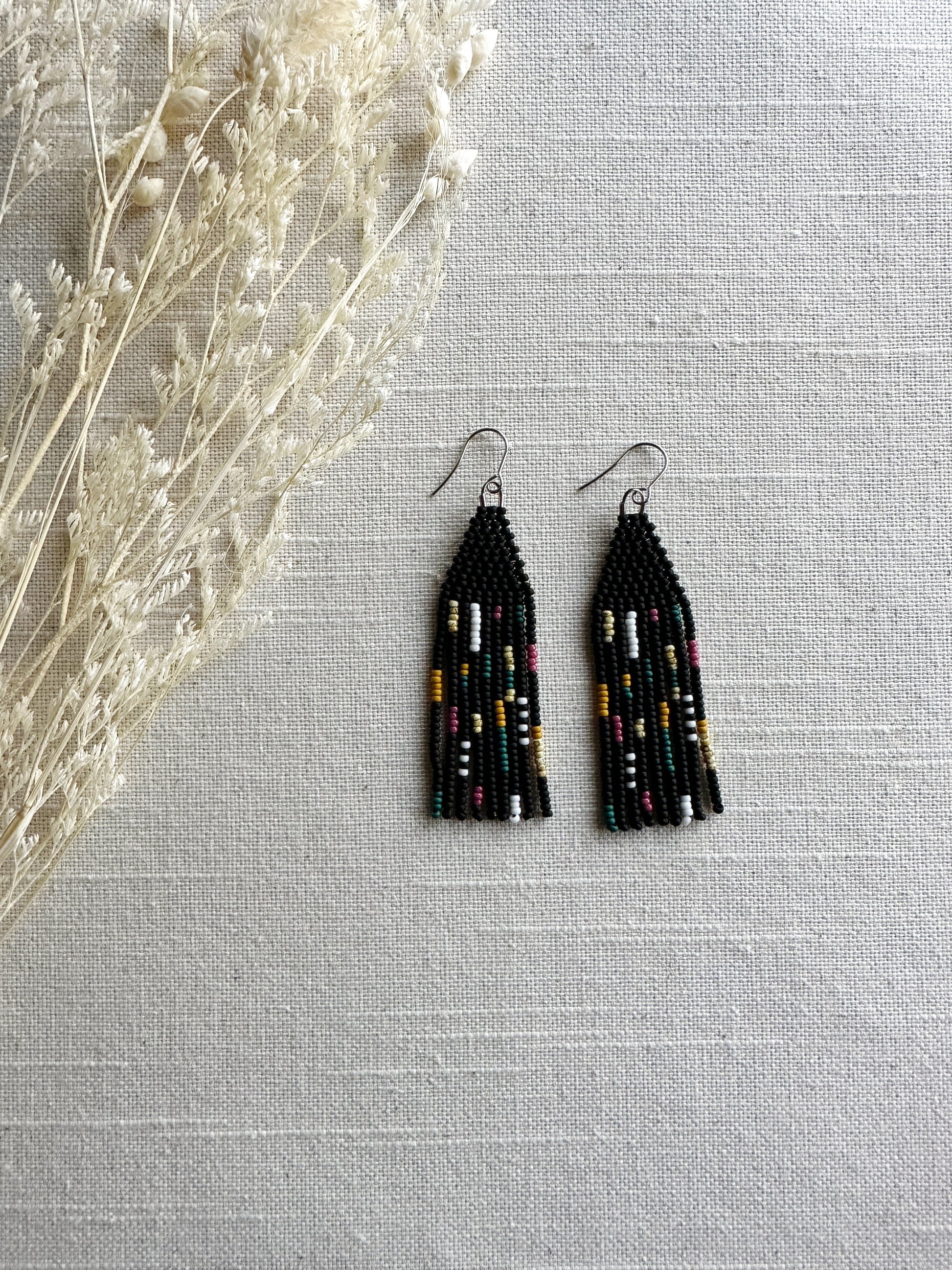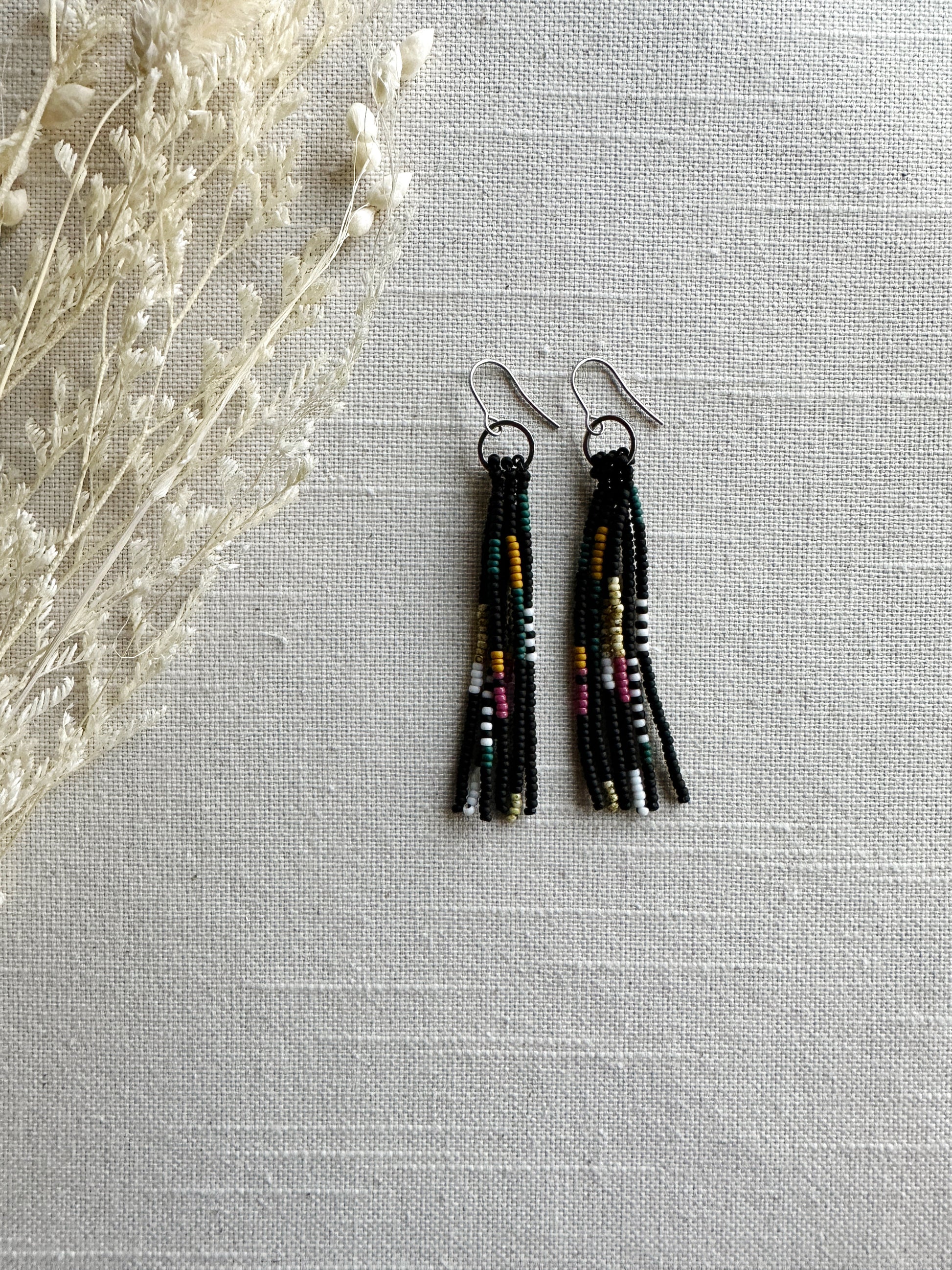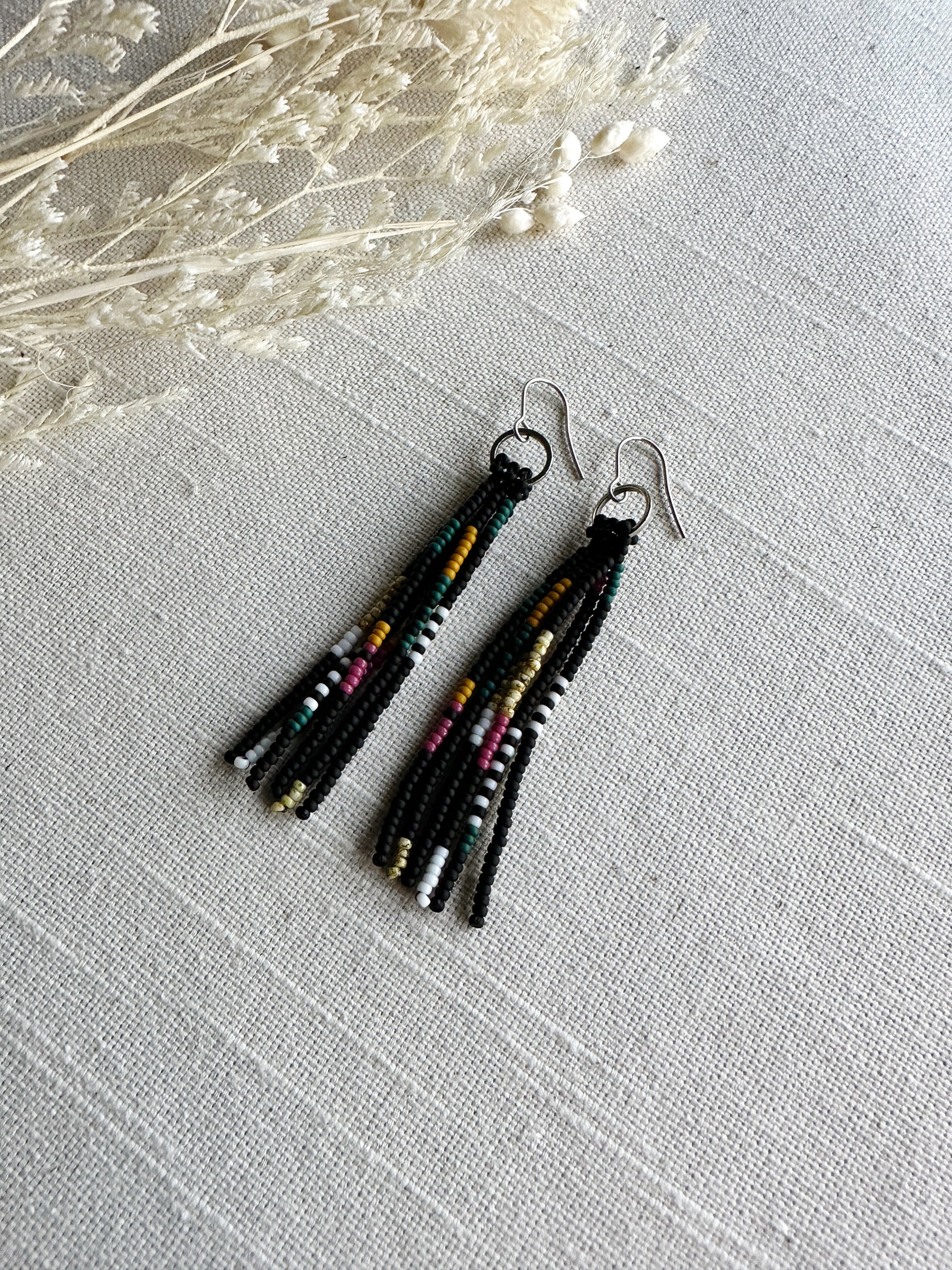 Black, magenta, teal, mustard and white beads in a quilt patchwork pattern.
