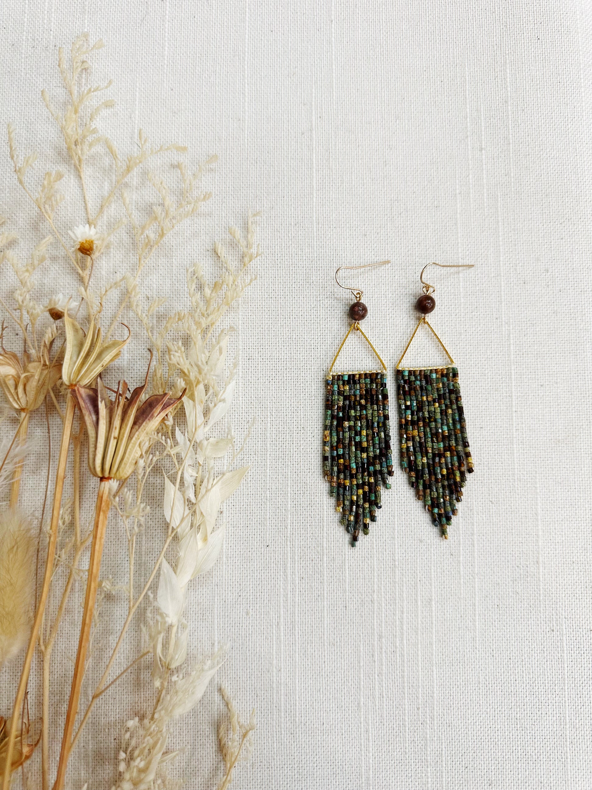 A unique blended mix of rectangular picasso beads. No two earrings are alike as beads are a complete mix and get woven in a random order. Marine Agate bead connects the triangle to the ear hook.