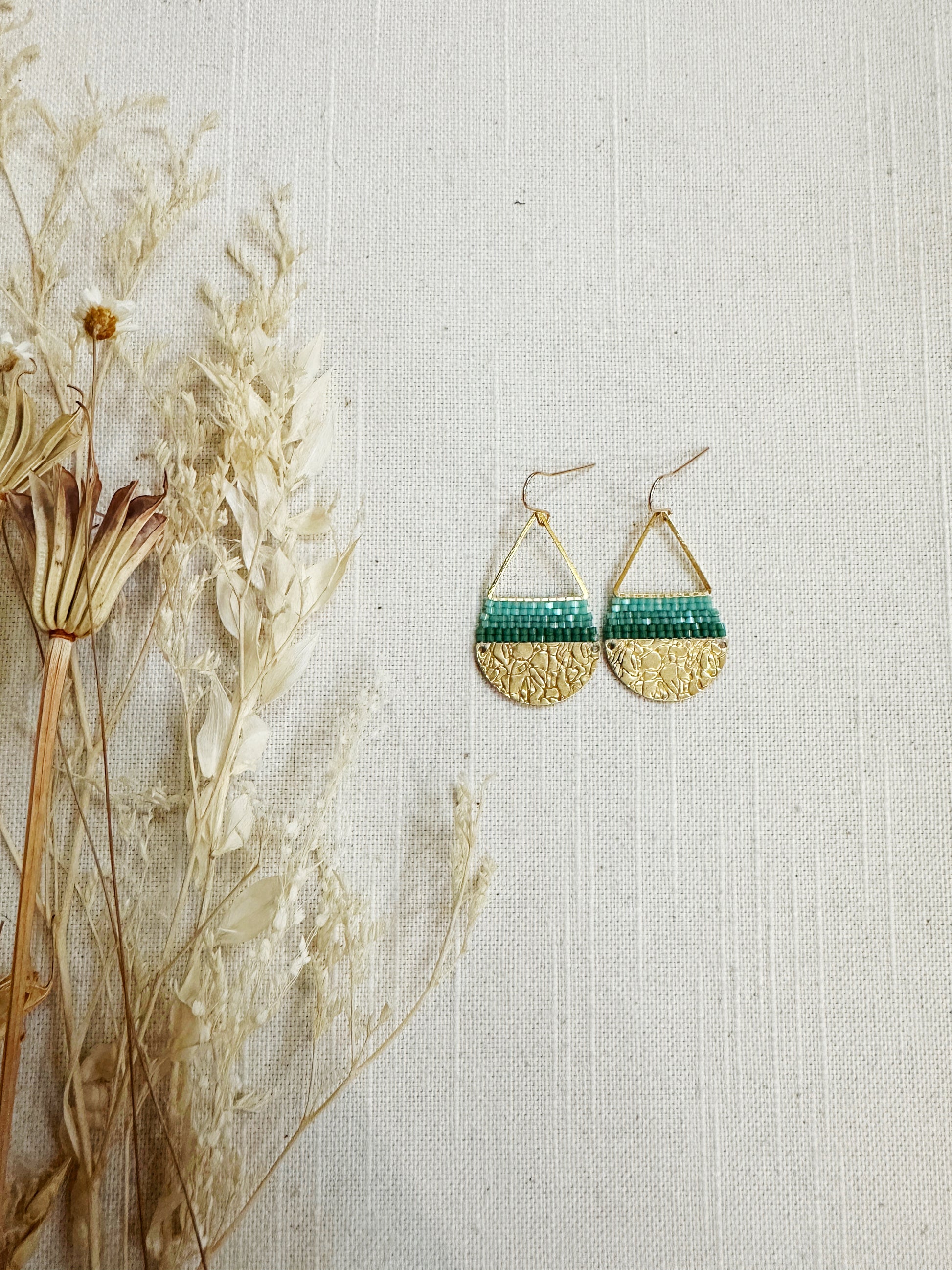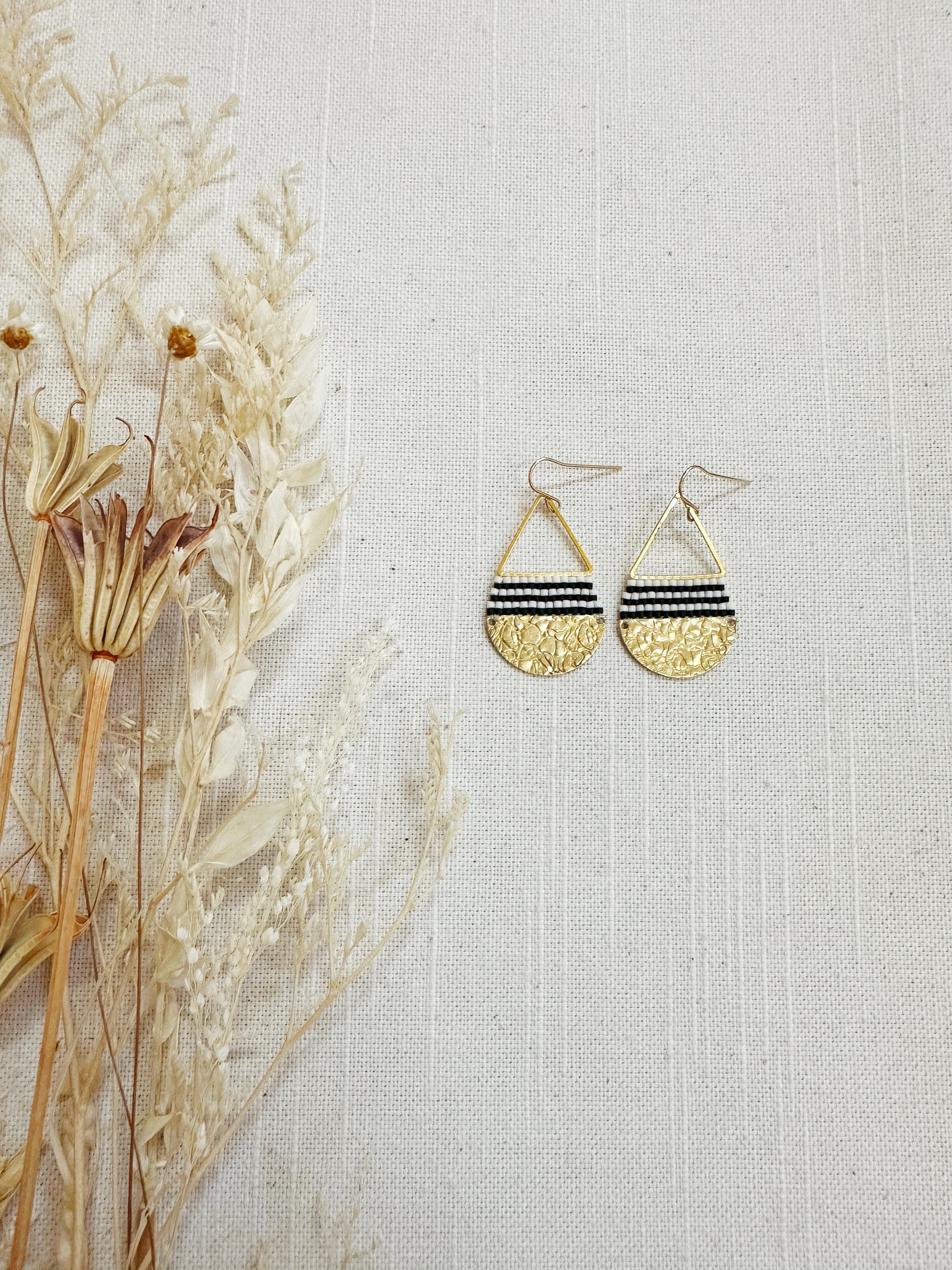 Brass hammered semi circle with a gold plated triangle connected by delica glass beads.