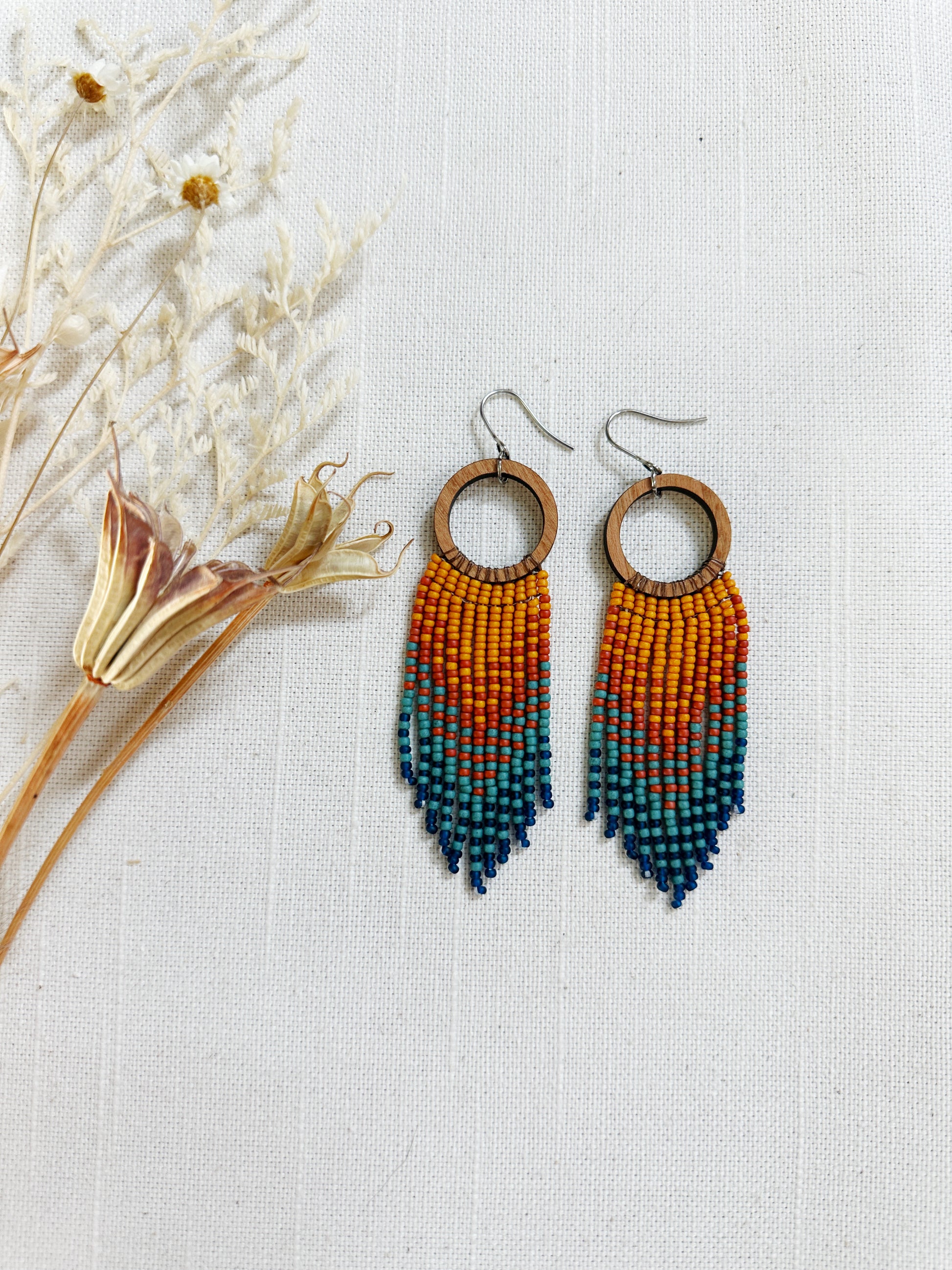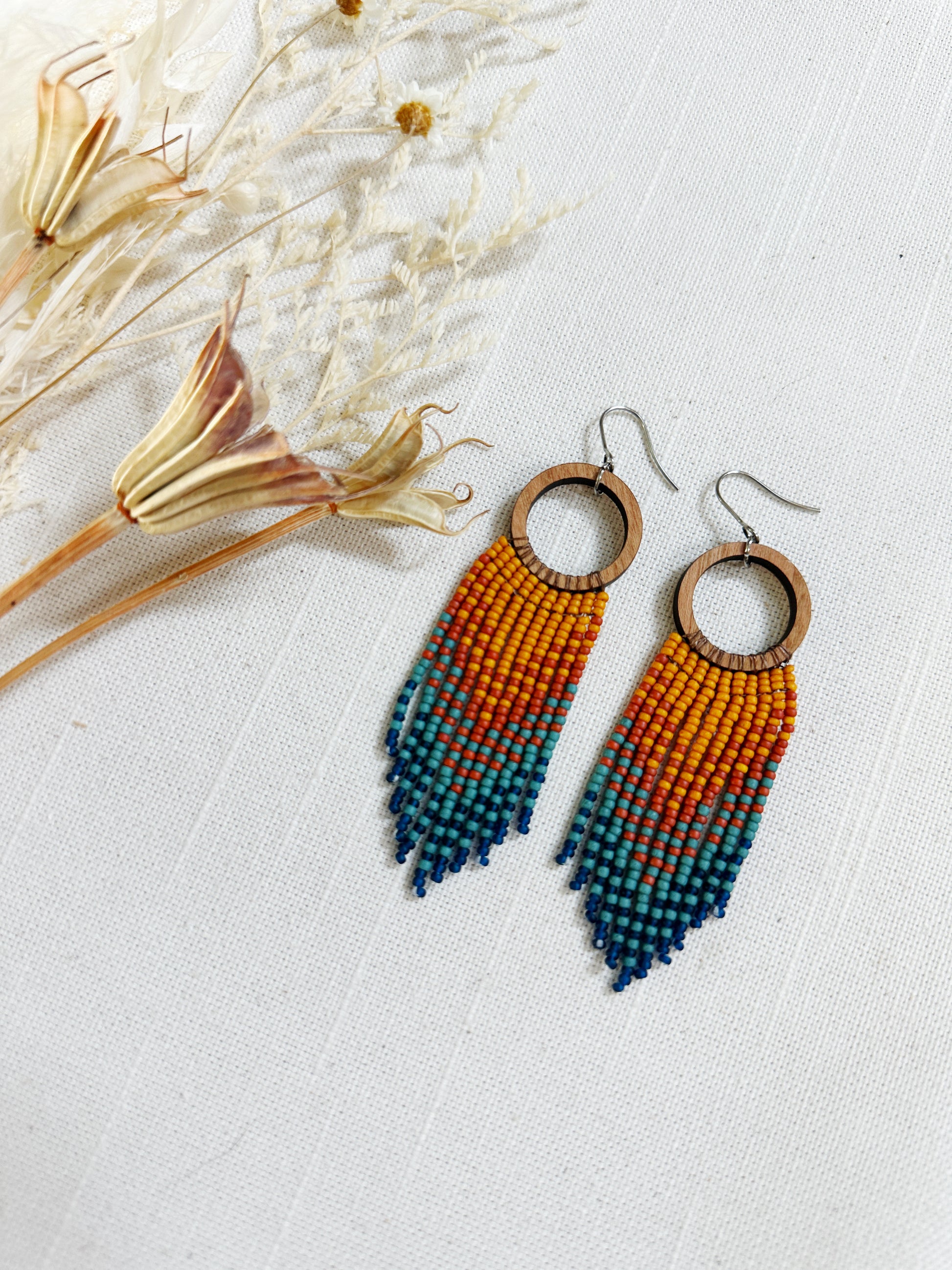 Inspired by those gorgeous southwest sunsets, Sedona comes in a new mini size! Featuring a cherry plywood hoop with yellow, sienna, turquoise and navy beads.