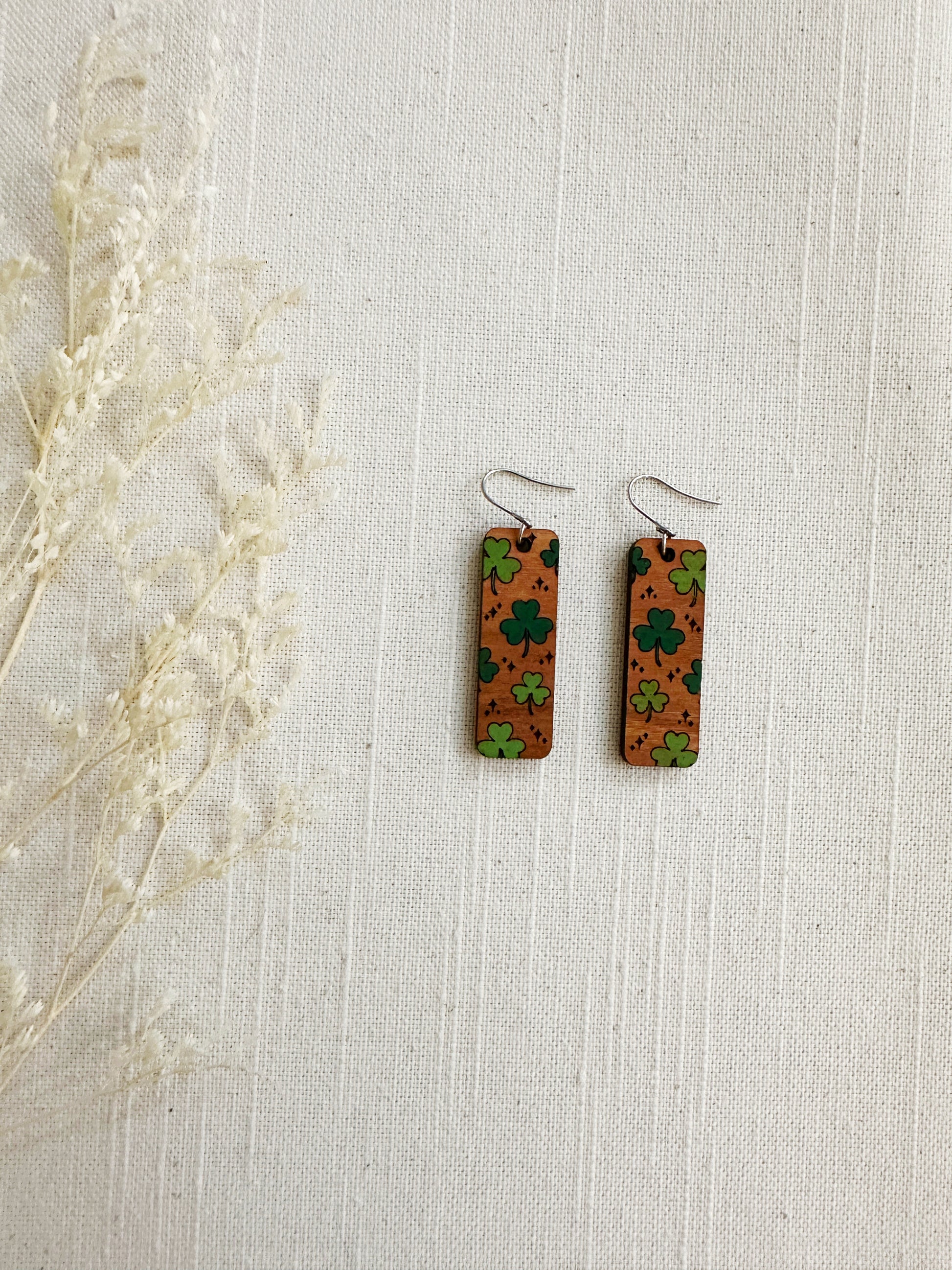 Embrace your Irish spirit with our Shamrock Scattered Wood Dangle earrings. Perfect for St. Patrick's Day, these hand-painted wood earrings feature a unique shamrock design. Who says jewelry can't be lucky?!
