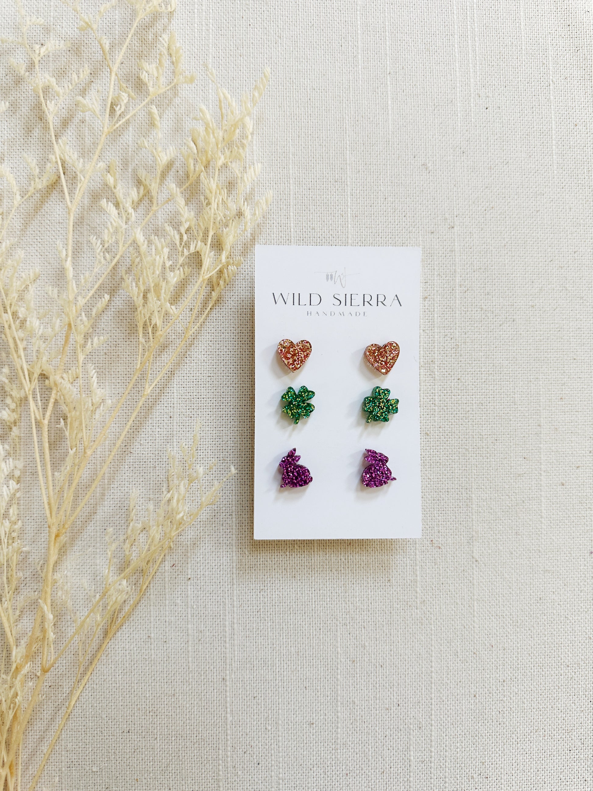Triple pack of Spring Holiday Studs. Each pack contains a rose gold heart, green shamrock and then your pick of a glitter bunny stud in 6 different options.