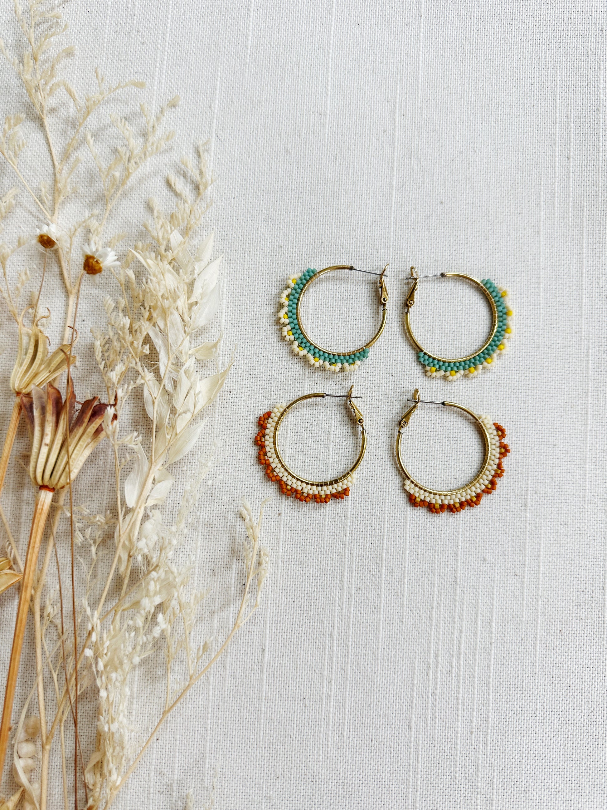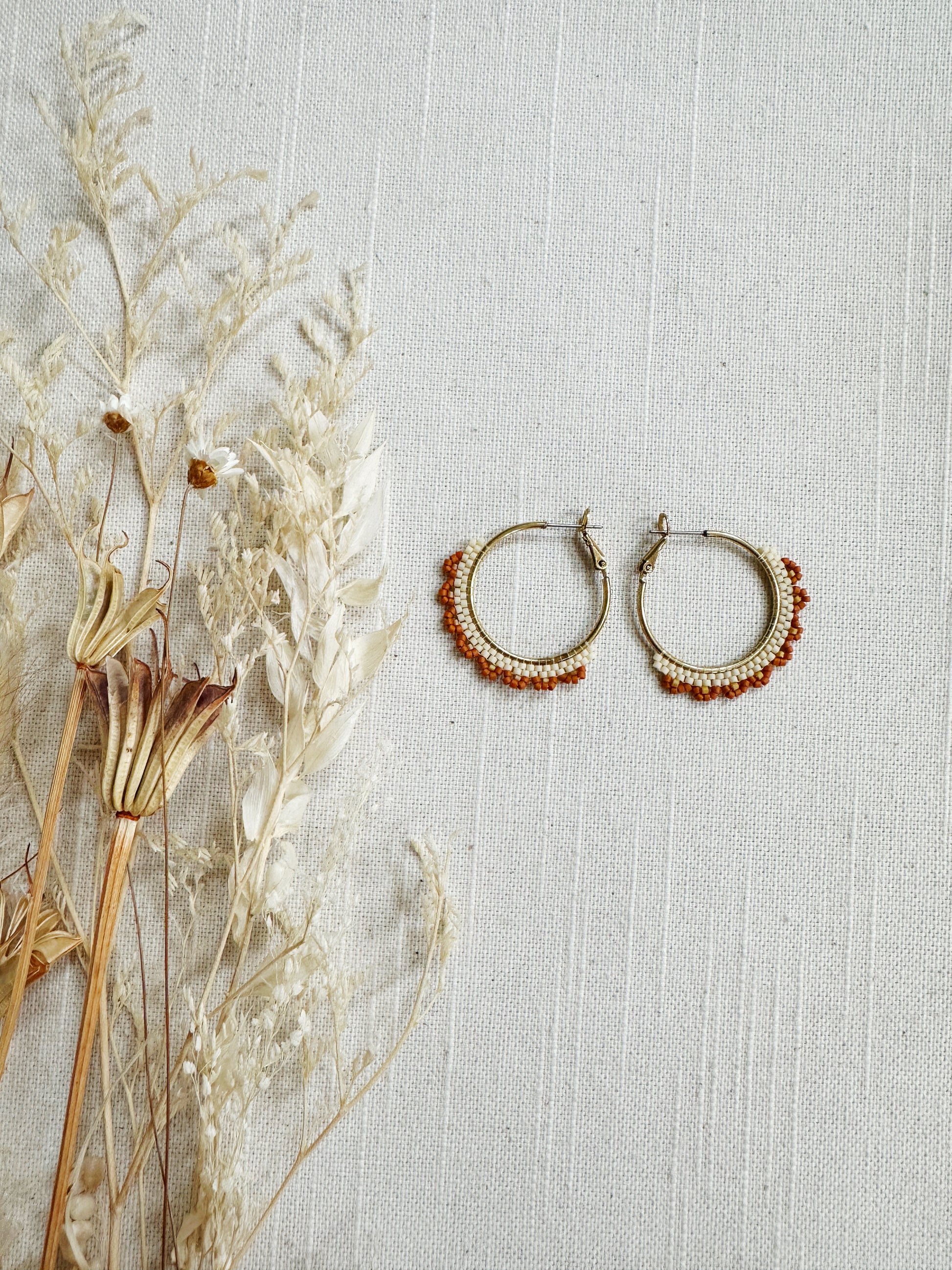 Woven Beaded hoop in a floral design on a brass hoop.