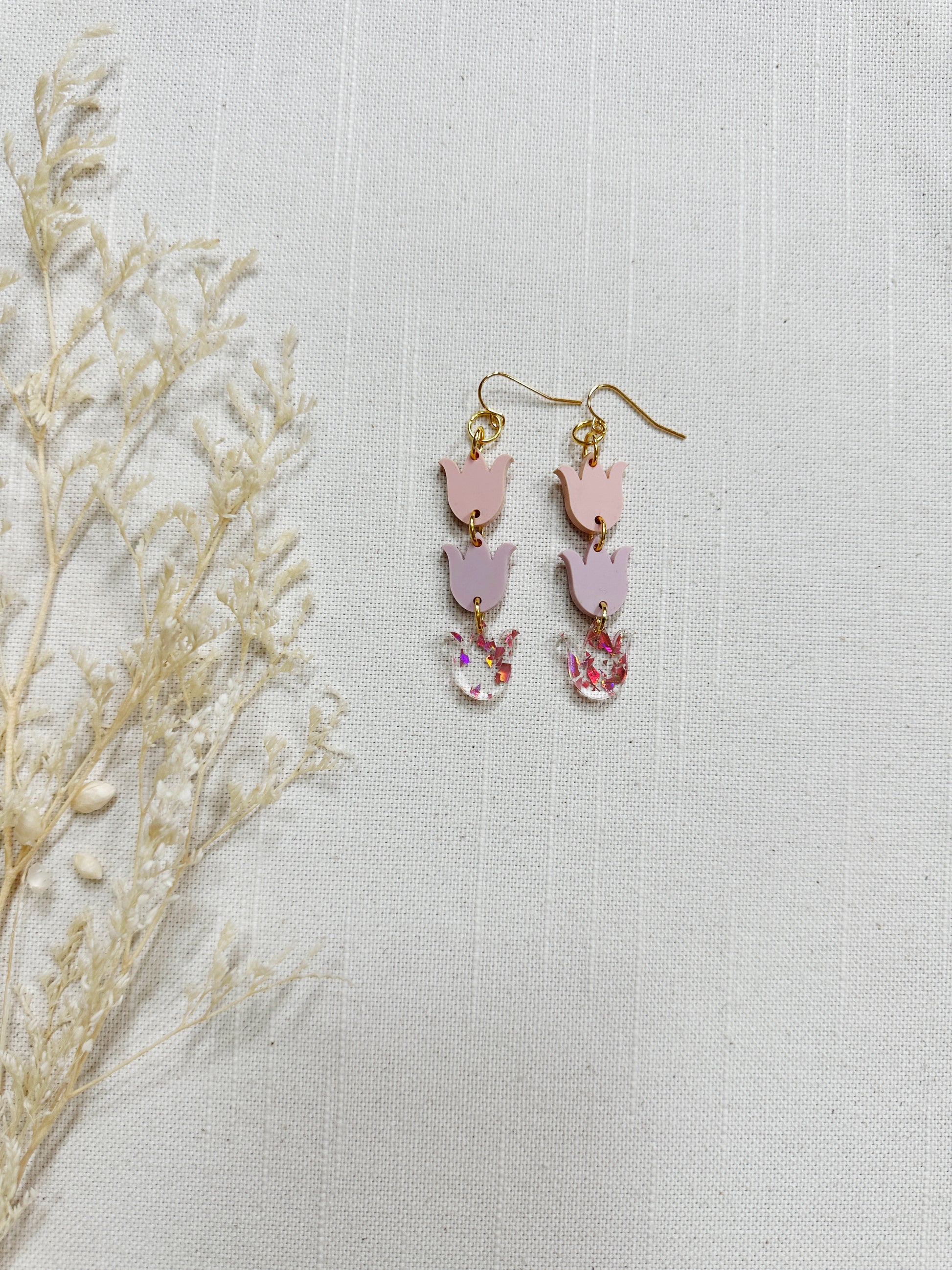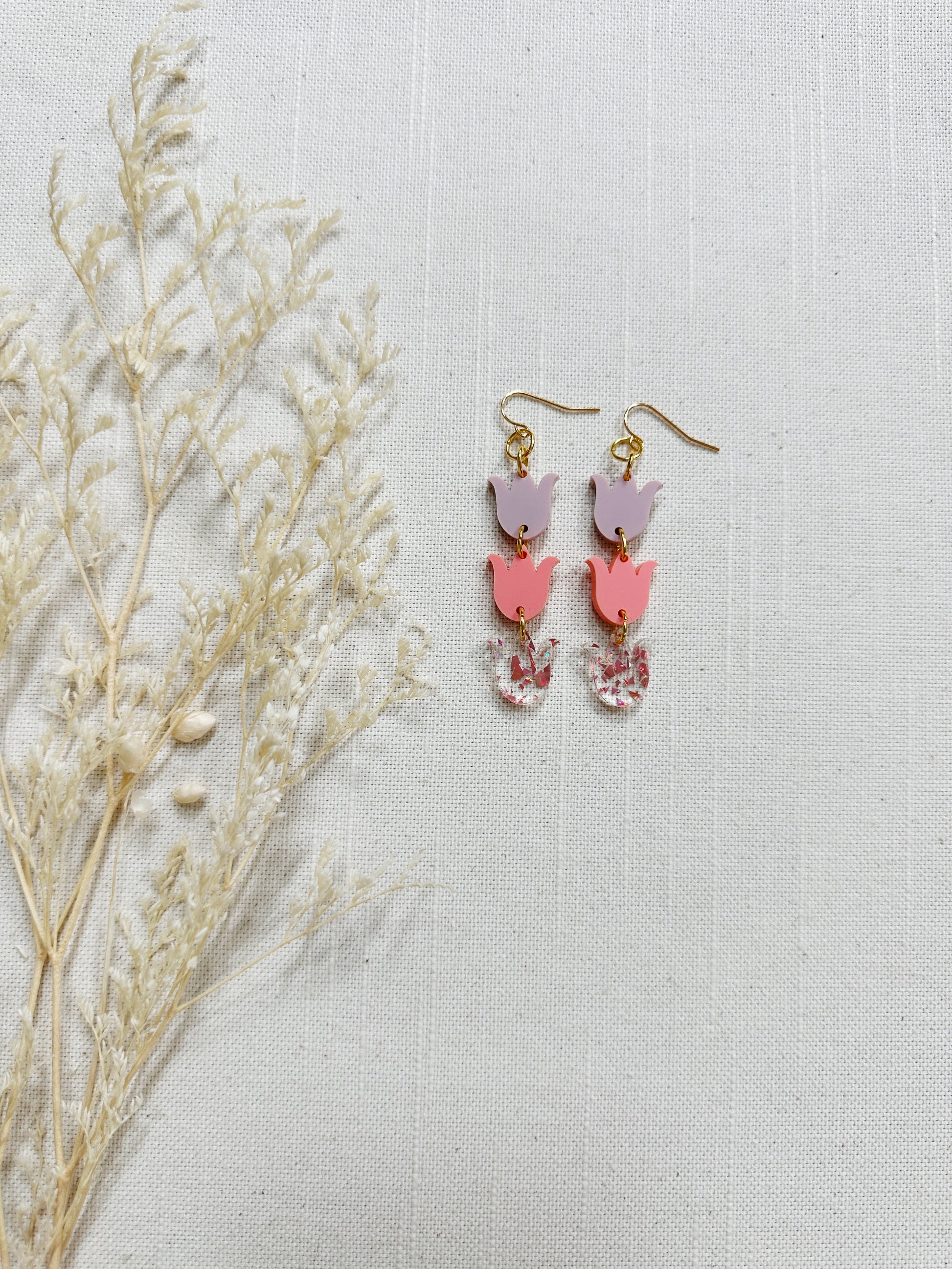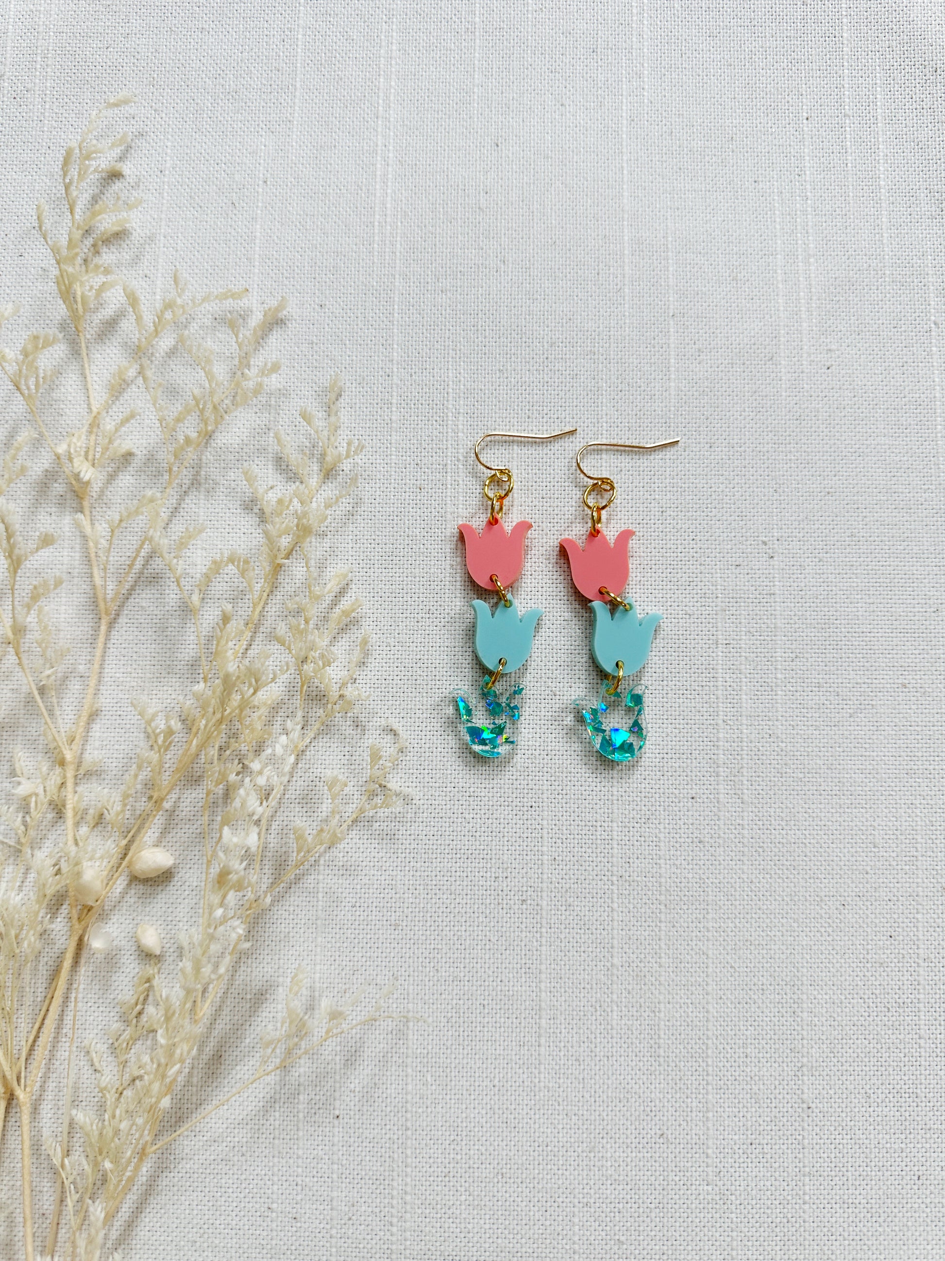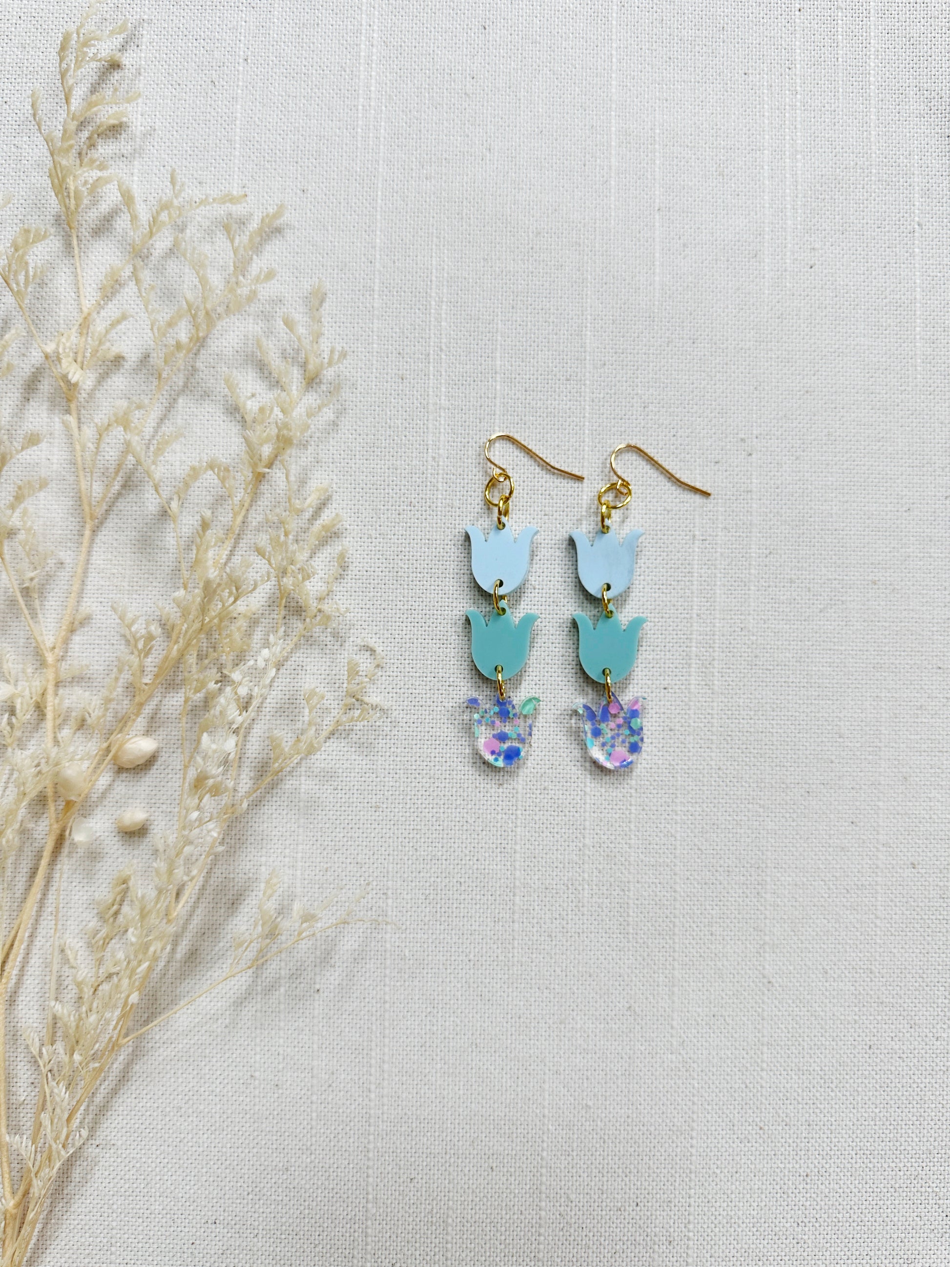 These earrings feature delicate tulip designs made with durable acrylic, they are lightweight and comfortable to wear all day long. All solid colors are a matte finish with the glitter having a bit of gloss.