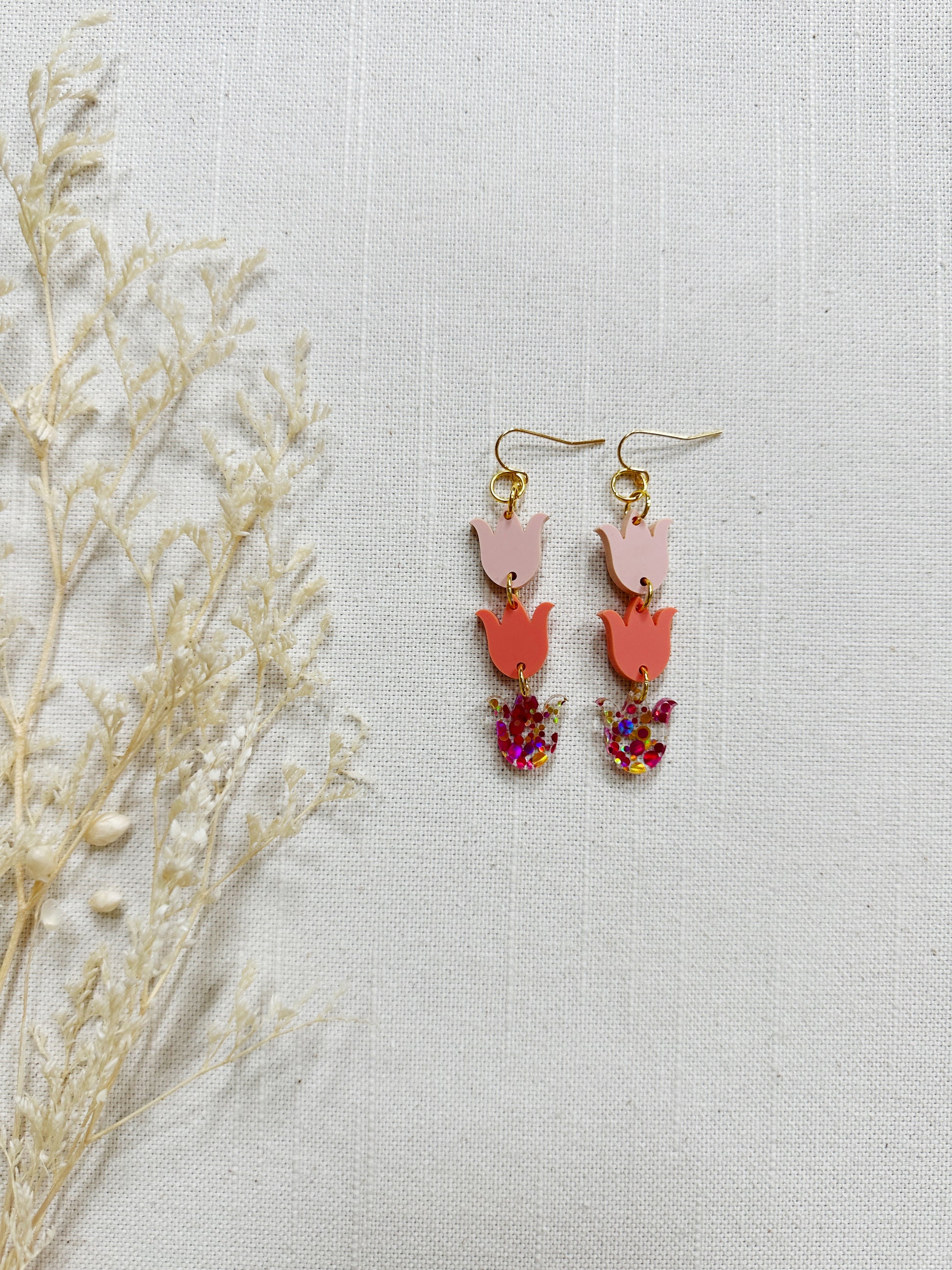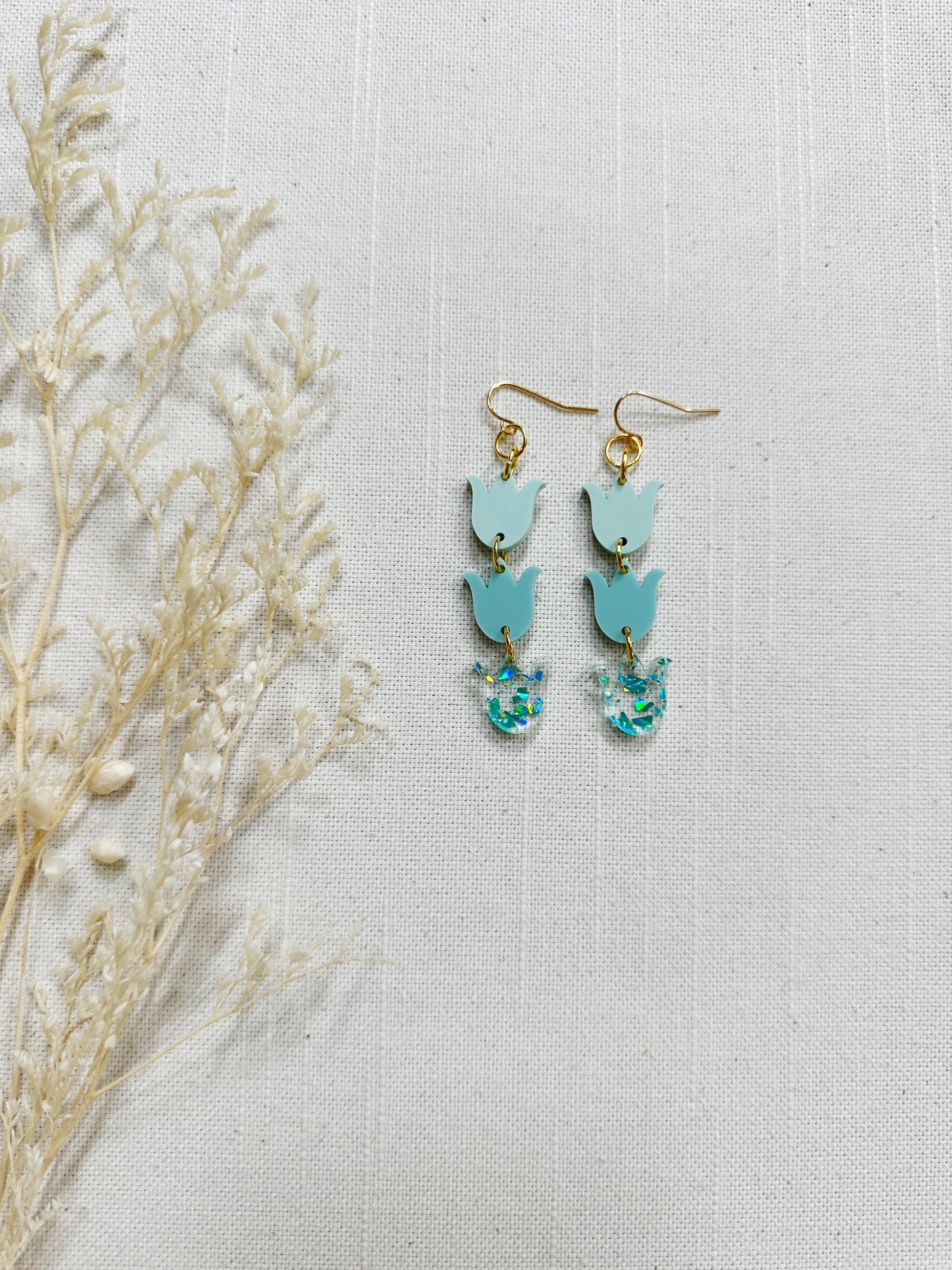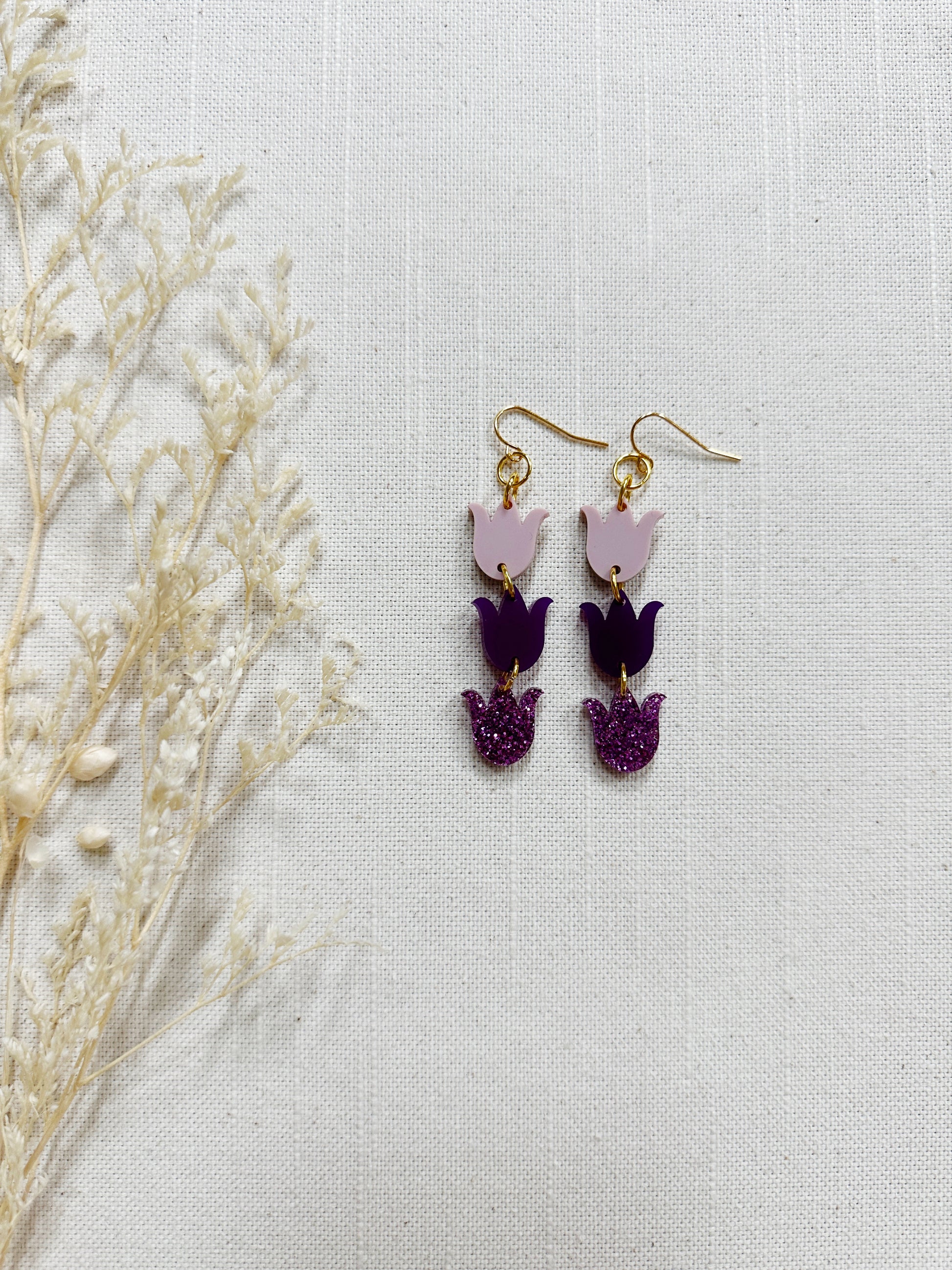 These earrings feature delicate tulip designs made with durable acrylic, they are lightweight and comfortable to wear all day long. All solid colors are a matte finish with the glitter having a bit of gloss.