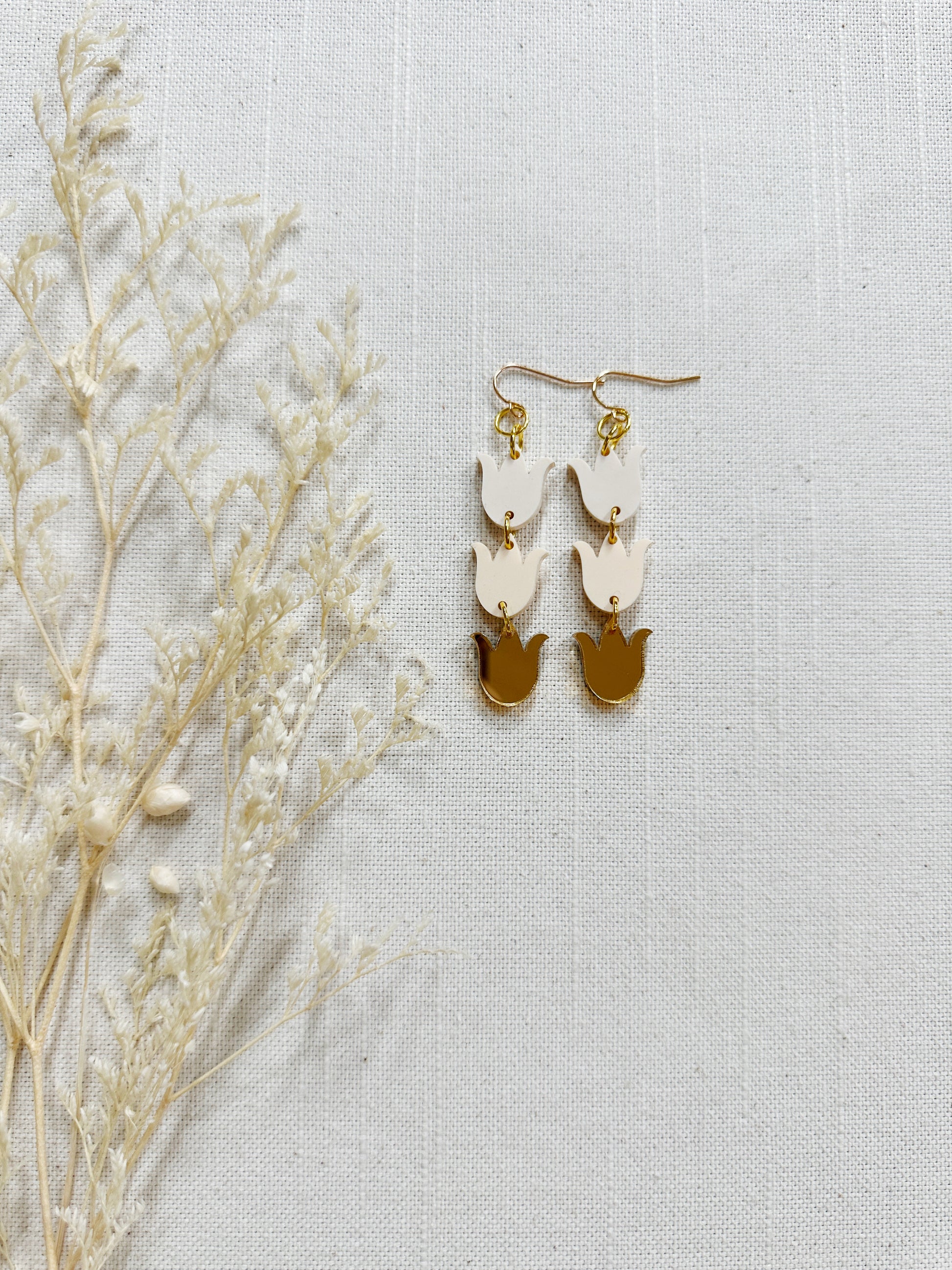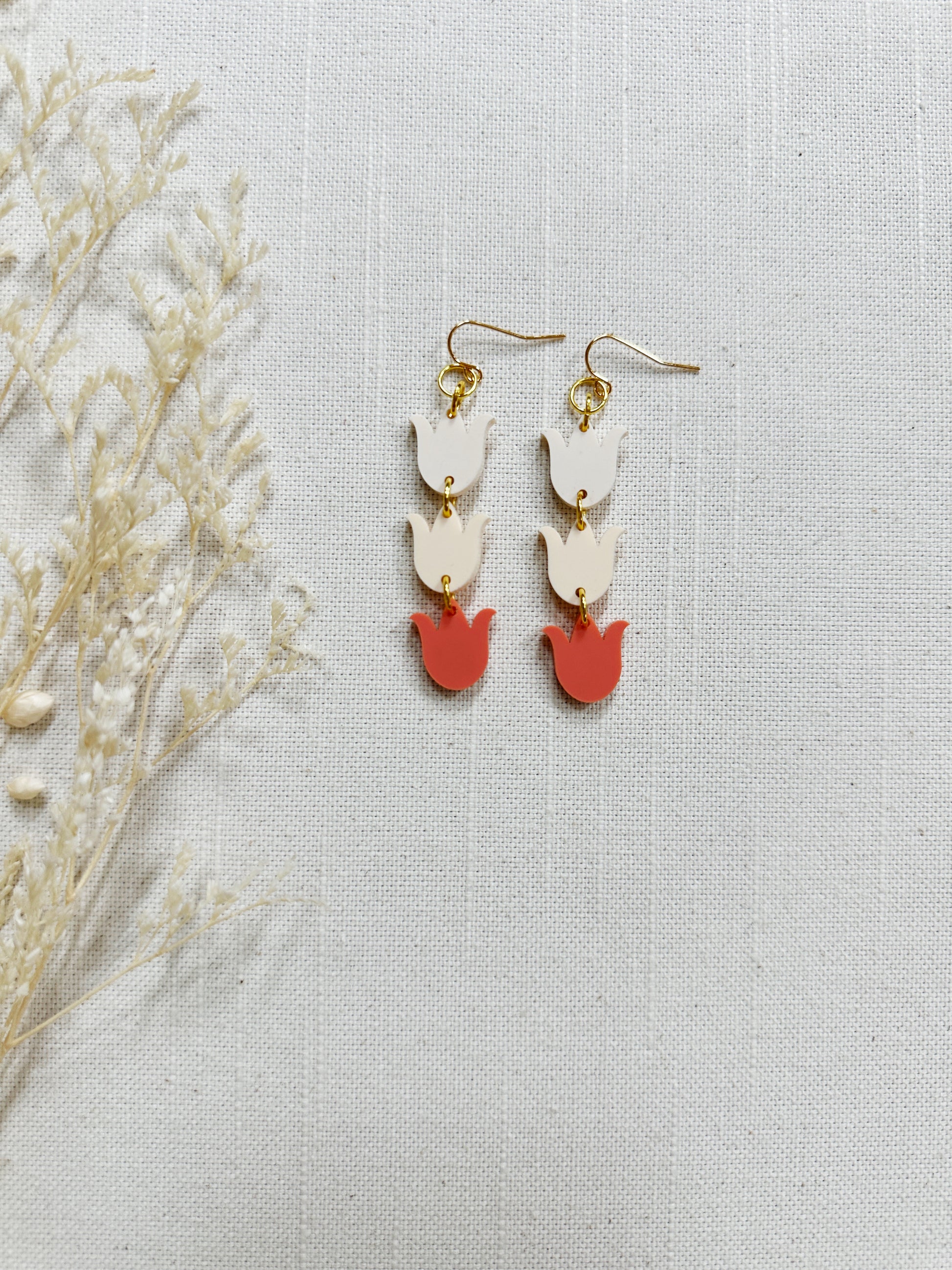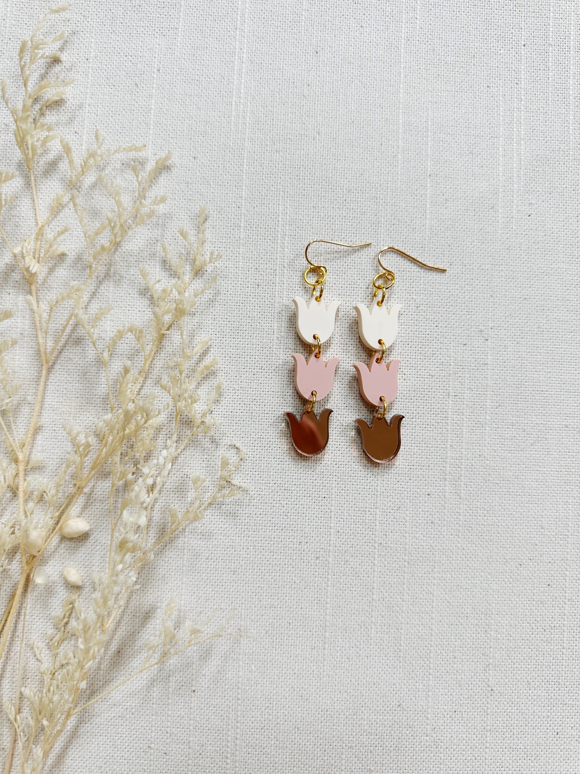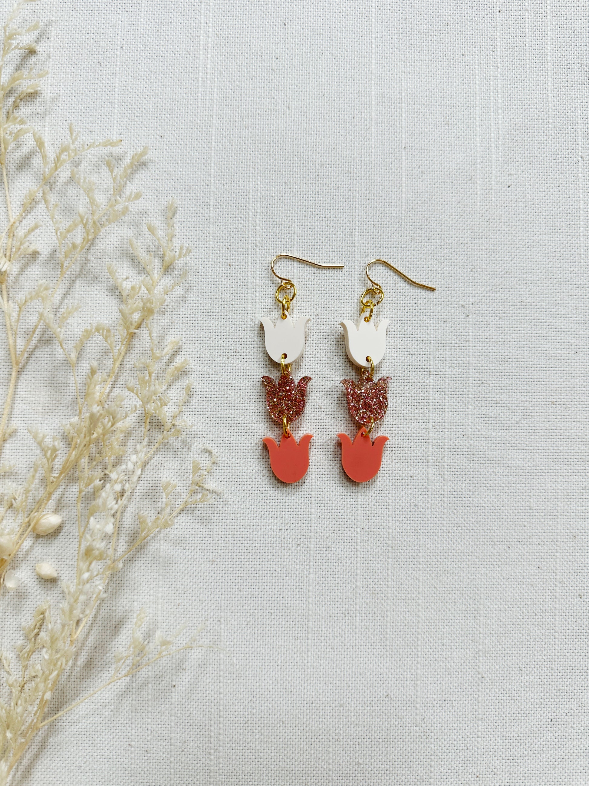 These earrings feature delicate tulip designs made with durable acrylic, they are lightweight and comfortable to wear all day long. All solid colors are a matte finish with the glitter having a bit of gloss.