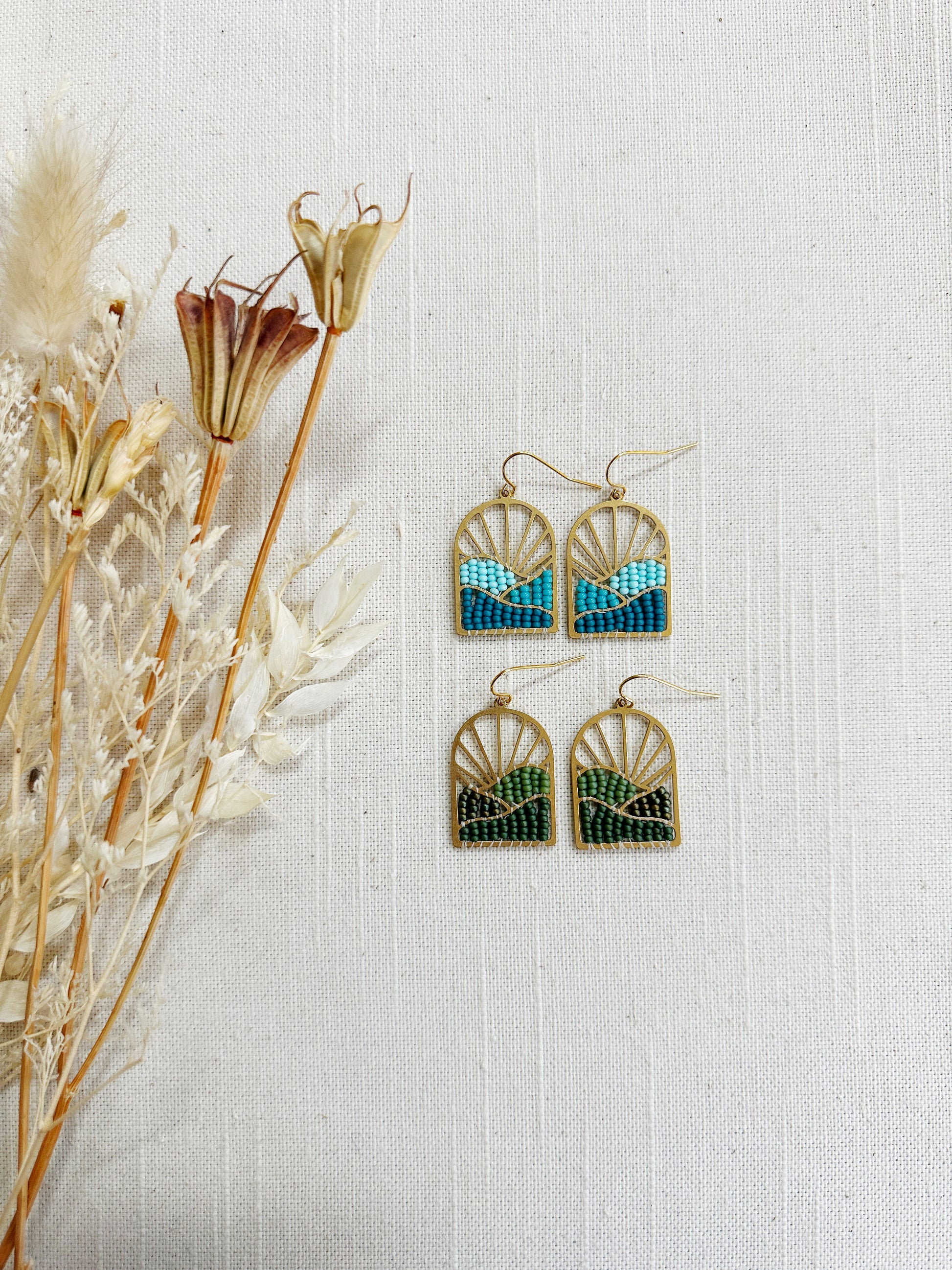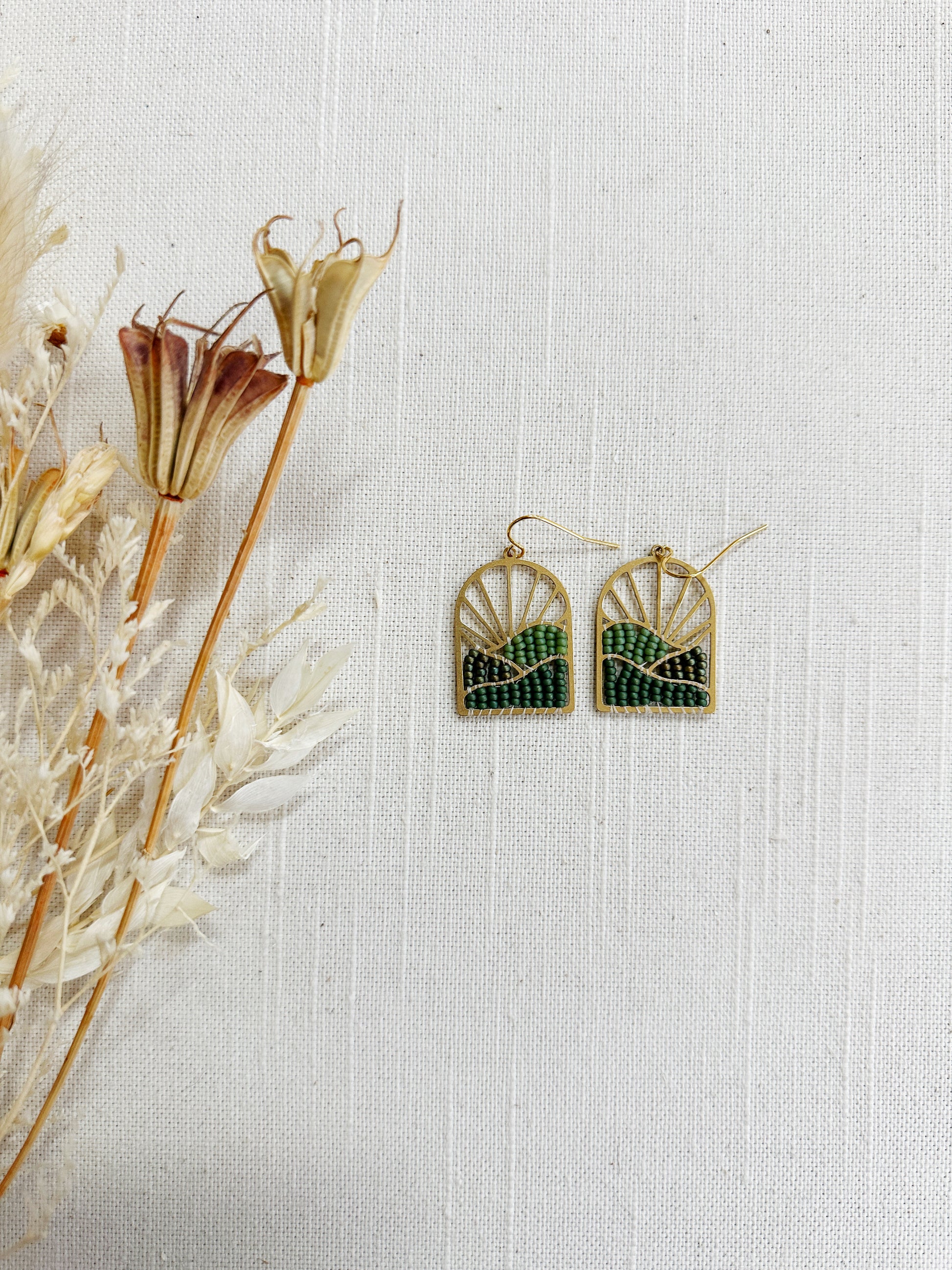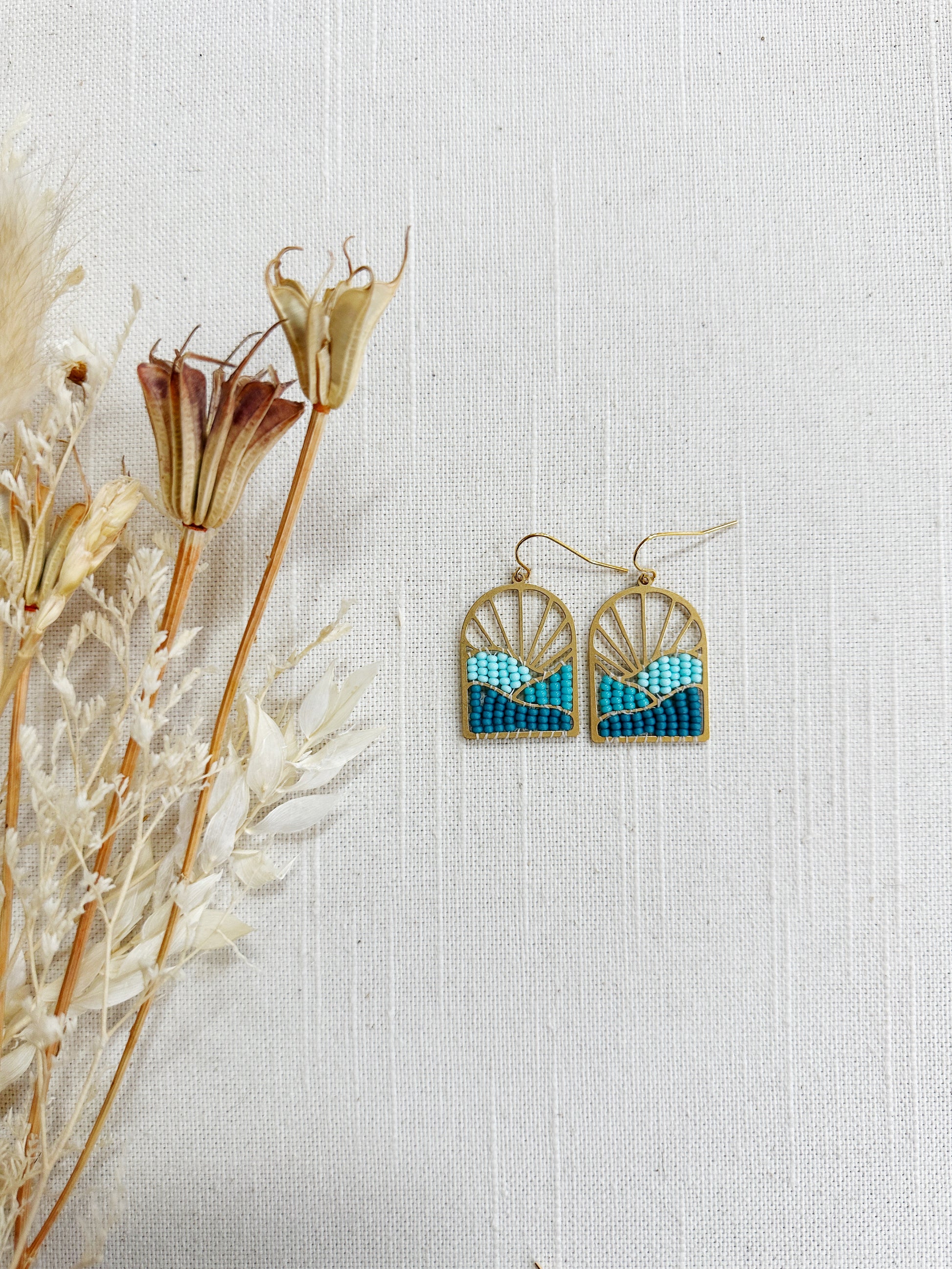 Brass Sunburst with waves finding woven with glass seed beads.