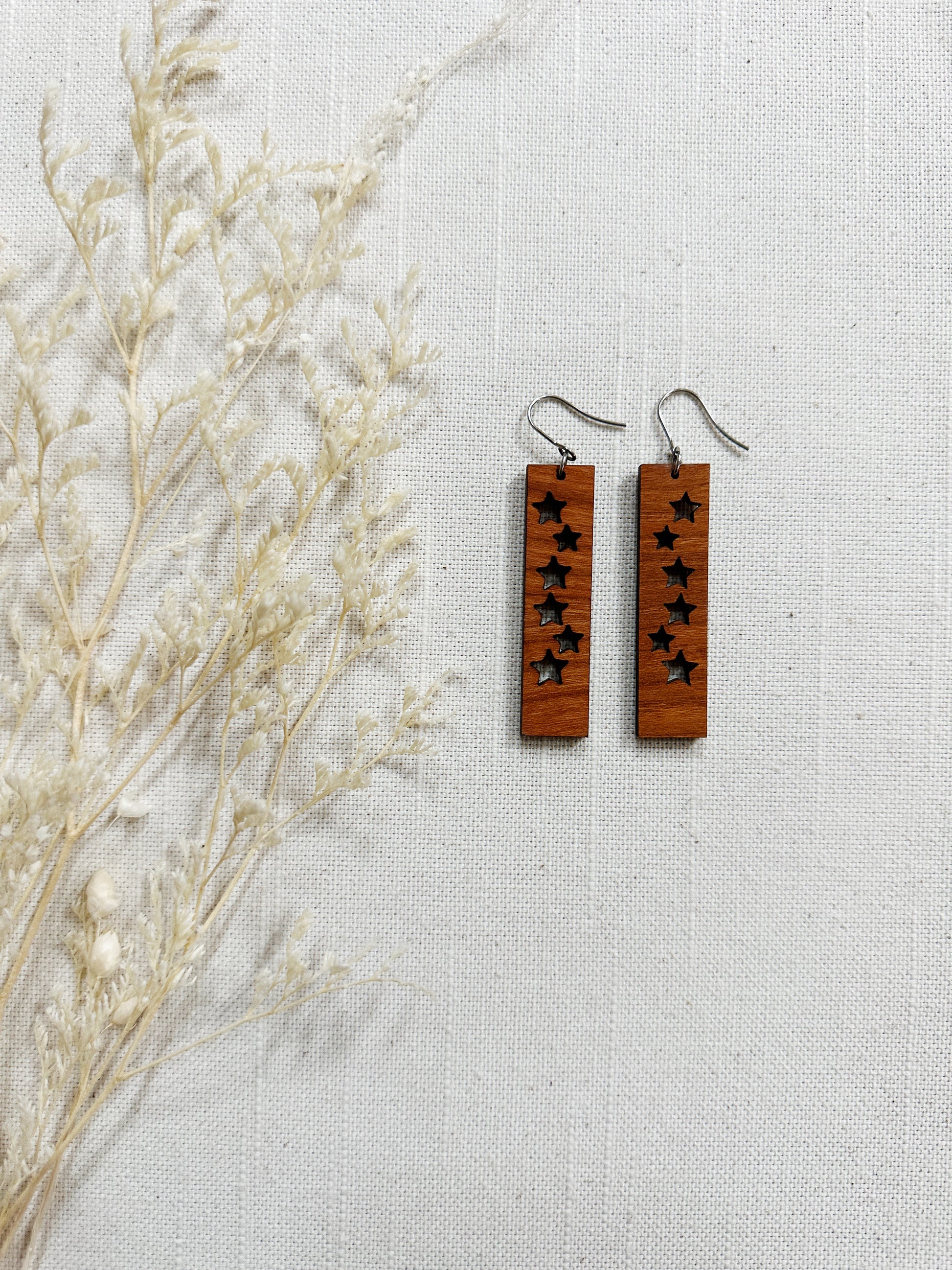 The perfect pair of organic wooden earrings that are laser cut from cherry veneer on plywood. These earrings offer a unique and natural touch to any outfit.
